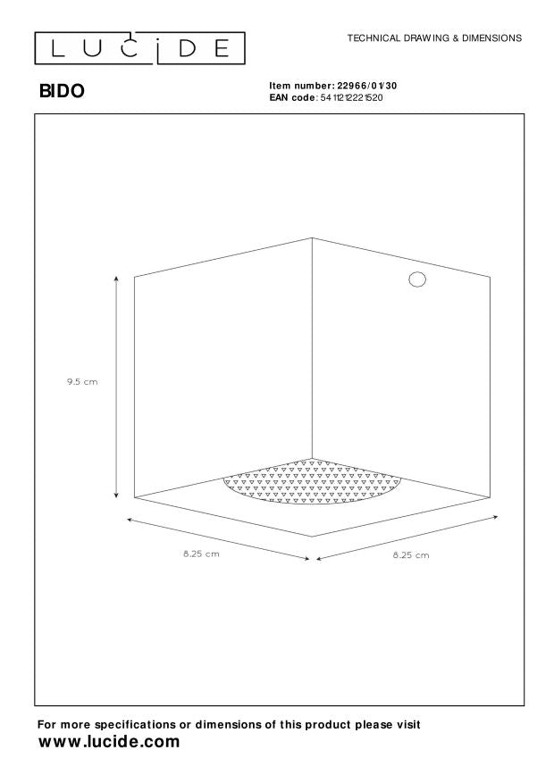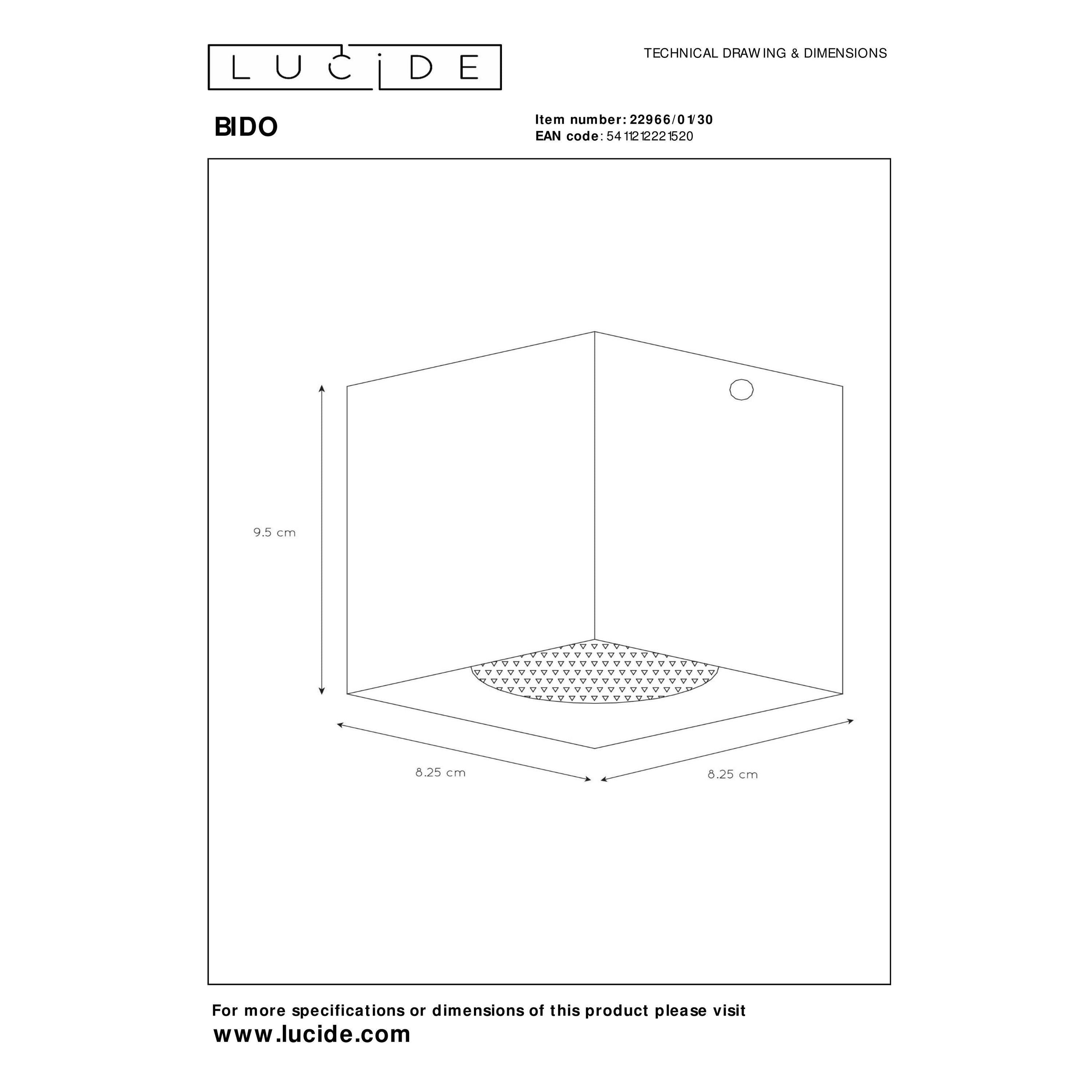Een strakke opbouwspot met pit. Bido dankt zijn krachtige uitstraling aan het hoogstaand, aluminium omhulsel. De plafondspot monteer je zowel in de keuken en de eetkamer. De spot is met een hoogte van bijna 10 centimeter makkelijk plaatsbaar op het plafond. Speel met aantal en opstelling om zo een uniek karakter te geven aan jouw woning. Indien gewenst kan je Bido combineren met een dimmer. Zo pas je het licht eenvoudig aan op je stemming van het moment. Unieke productkenmerken: • Geschikt voor toepassing met LED lichtbron • Eenvoudig aan te sluiten op een dimmer (excl.) • Vervaardigd uit hoogwaardig aluminium Belangrijke productkenmerken: • Verbruik: 1x50W / 230V / Dimbaar (excl.) • Afmetingen: L.8,3 x B.8,3 x H.9,5 cm • 2 Jaar garantie op het armatuur / Passende lichtbron is EAN: 5411212491237 Waarom Lucide verlichting kopen? Lucide ontwikkelt en produceert sinds haar oprichting in 1992 hoogwaardige en trend zettende lichtoplossingen. Deze 2 elementen zijn de basis voor het toonaangevend assortiment van het in Antwerpen gevestigde bedrijf. Een team van Lucide designers, aangevuld met freelance ontwerpers, ontwikkelen dagelijks tal van nieuwe producten. Innovatieve materiaalkeuze, vormgeving en kleurtoepassing in combinatie met de meest actuele lichttechnologie stelt Lucide daarbij continue centraal.
