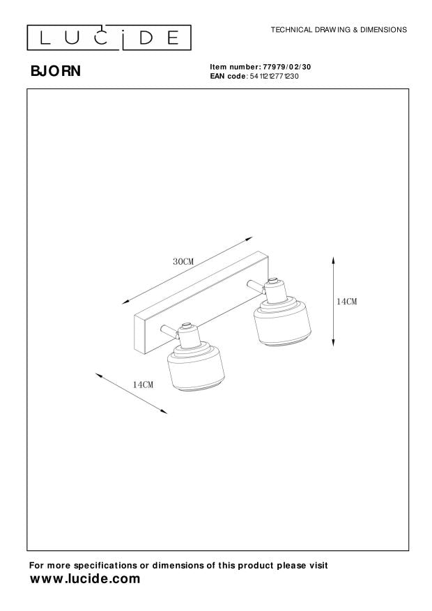 Of je nu houdt van klassieke of van moderne interieurs, voor Bjorn vind je vast en zeker een plekje. Deze plafondspot met twee lichtpunten op een rij werd doordacht vormgegeven zodat hij aan iedere stijlbehoefte voldoet. Met een metalen plafondplaat en hoogwaardige glazen lampenkappen bieden de pure vormen van Bjorn meerwaarde aan je ruimte. Bovendien kan je de lichtpunten eenvoudig kantelen en draaien naar de plekken waar je licht nodig hebt. Sluit deze plafondlamp aan op een dimmer voor het gewenste effect. Unieke productkenmerken: • Geschikt voor toepassing met LED lichtbronnen • Deze lamp is draaibaar en kantelbaar • Eenvoudig aan te sluiten op een dimmer (excl.) • Vervaardigd uit hoogwaardig metaal Belangrijke productkenmerken: • Verbruik: 2x40W / 230V / Dimbaar (lichtbronnen niet inbegrepen) • Afmetingen: L.30 x B.14 x H.16,5 cm • 2 Jaar garantie op het armatuur / Passende lichtbron is EAN: 5411212490759 Waarom kiezen voor Lucide verlichting? Lucide staat voor trendsettend design, vakmanschap en betrouwbaarheid. Als Belgisch familiebedrijf met ruim drie decennia aan expertise ontwerpen wij hoogwaardige verlichting die elke ruimte – binnen én buiten – verrijkt en transformeert. Onze veelzijdige collectie omvat duurzame armaturen en energiezuinige lichtbronnen, zorgvuldig ontworpen door onze eigen experts en geproduceerd volgens de strengste CE-normen. Met ons uitgebreide assortiment bieden we jou altijd een geschikte lichtoplossing, ongeacht stijl of ruimte. Zo verlichten we niet enkel jouw leefruimte maar ook jouw keuzeproces in de zoektocht naar kwalitatieve betaalbare verlichting. Bij Lucide combineren we innovatie met vakmanschap, voor verlichting die niet alleen sfeer toevoegt, maar van ieder huis een thuis maakt.