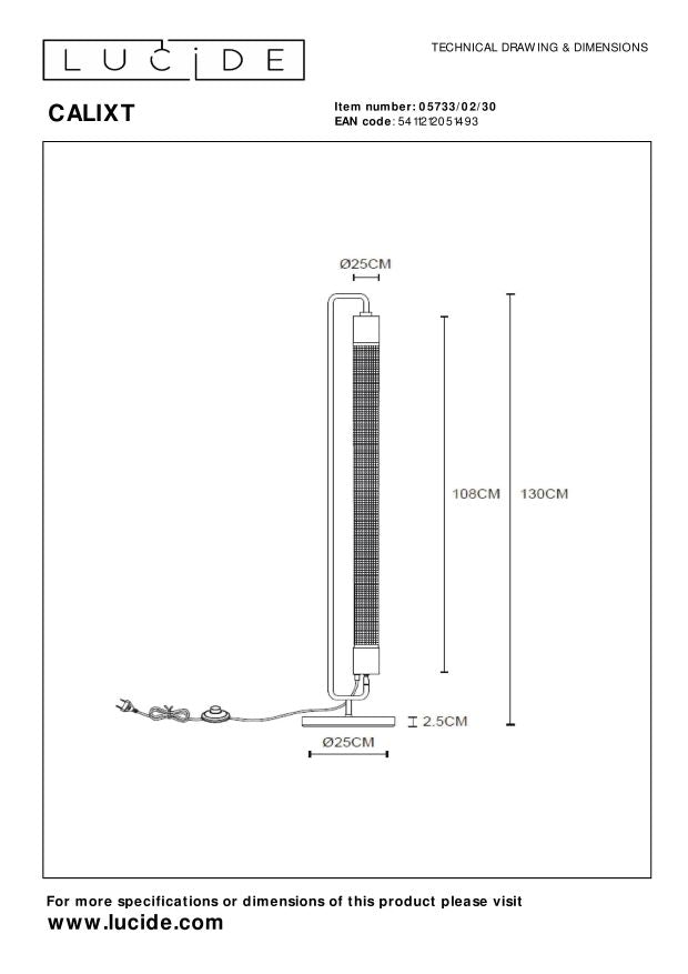 Je ideale partner in crime voor een knusse avond in de zetel. Of je nu geniet van een goed boek, aangenaam gezelschap of een avondje voor de tv, vloerlamp Calixt wijkt geen moment van je zijde. Met zijn strakke, smalle uitvoering, 2 filamentlampen die je plaatst in een cilinder van gaas en zijn metalen look past hij in een eigentijds interieur. Je knipt Calixt makkelijk aan en uit met een schakelaar op het snoer en, na aansluiting op een dimmer, dim je het licht volgens je behoefte. Deze vloerlamp is 130 centimeter hoog en 25 centimeter breed. Unieke productkenmerken: • Geschikt voor toepassing met LED lichtbronnen • Bedienbaar via aan/uit schakelaar in het snoer • Vervaardigd uit hoogwaardig staal Belangrijke productkenmerken: • Verbruik: 2x10W / 230V / Dimbaar (lichtbronnen niet inbegrepen) • Afmetingen: L.25 x B.25 x H.130 cm • 2 Jaar garantie op het armatuur / Passende lichtbron is EAN: 5411212491404 Waarom kiezen voor Lucide verlichting? Lucide staat voor trendsettend design, vakmanschap en betrouwbaarheid. Als Belgisch familiebedrijf met ruim drie decennia aan expertise ontwerpen wij hoogwaardige verlichting die elke ruimte – binnen én buiten – verrijkt en transformeert. Onze veelzijdige collectie omvat duurzame armaturen en energiezuinige lichtbronnen, zorgvuldig ontworpen door onze eigen experts en geproduceerd volgens de strengste CE-normen. Met ons uitgebreide assortiment bieden we jou altijd een geschikte lichtoplossing, ongeacht stijl of ruimte. Zo verlichten we niet enkel jouw leefruimte maar ook jouw keuzeproces in de zoektocht naar kwalitatieve betaalbare verlichting. Bij Lucide combineren we innovatie met vakmanschap, voor verlichting die niet alleen sfeer toevoegt, maar van ieder huis een thuis maakt.