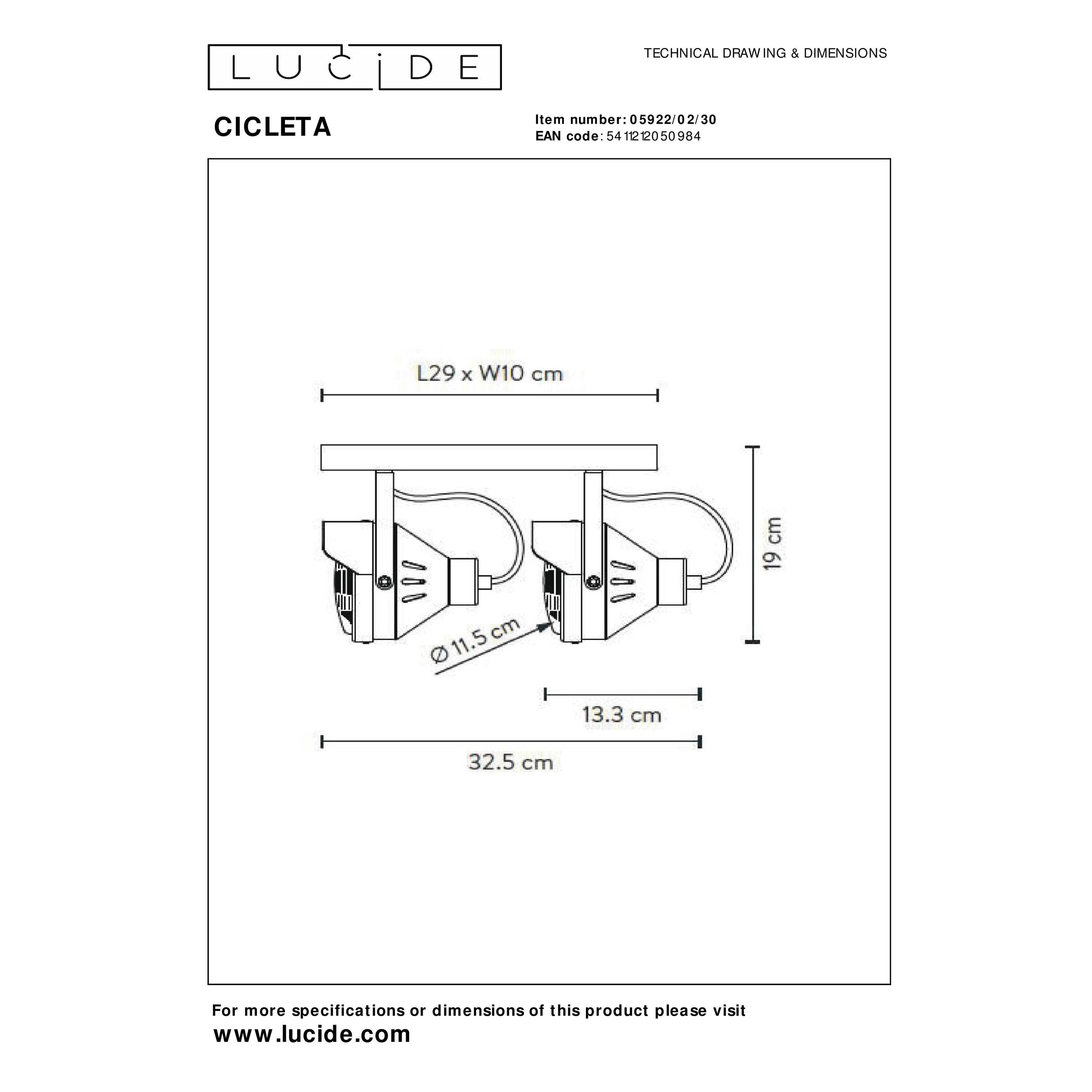 Double trouble of twee keer zoveel plezier? Deze plafondspot genaamd Cicleta is zonder twijfel het tweede. De industriële spotjes zijn volledig richtbaar, zodat je zelf in de verf zet wat je wil. De elegante connectie van de spots aan de bevestigingsplaat houden alle aandacht op het speelse ontwerp van de lichtpunten zelf. Het reliëf in de bolle afdekking, het charmante afschermpkapje aan de bovenkant van de spot en het subtiele snoer: Cicleta combineert het allemaal in stijlvolle verlichting. Unieke productkenmerken: • Geschikt voor toepassing met LED lichtbronnen • Deze lamp is kantelbaar (verticaal) • Eenvoudig aan te sluiten op een dimmer (excl.) • vervaardigd uit hoogwaardig staal Belangrijke productkenmerken: • Verbruik: 2x35W / 230V / Dimbaar (excl.) • Afmetingen: L.32,5 x B.13,5 x H.19 cm • 2 Jaar garantie op het armatuur / Passende lichtbron is EAN: 5411212490667 Waarom Lucide verlichting kopen? Lucide ontwikkelt en produceert sinds haar oprichting in 1992 hoogwaardige en trend zettende lichtoplossingen. Deze 2 elementen zijn de basis voor het toonaangevend assortiment van het in Antwerpen gevestigde bedrijf. Een team van Lucide designers, aangevuld met freelance ontwerpers, ontwikkelen dagelijks tal van nieuwe producten. Innovatieve materiaalkeuze, vormgeving en kleurtoepassing in combinatie met de meest actuele lichttechnologie stelt Lucide daarbij continue centraal.