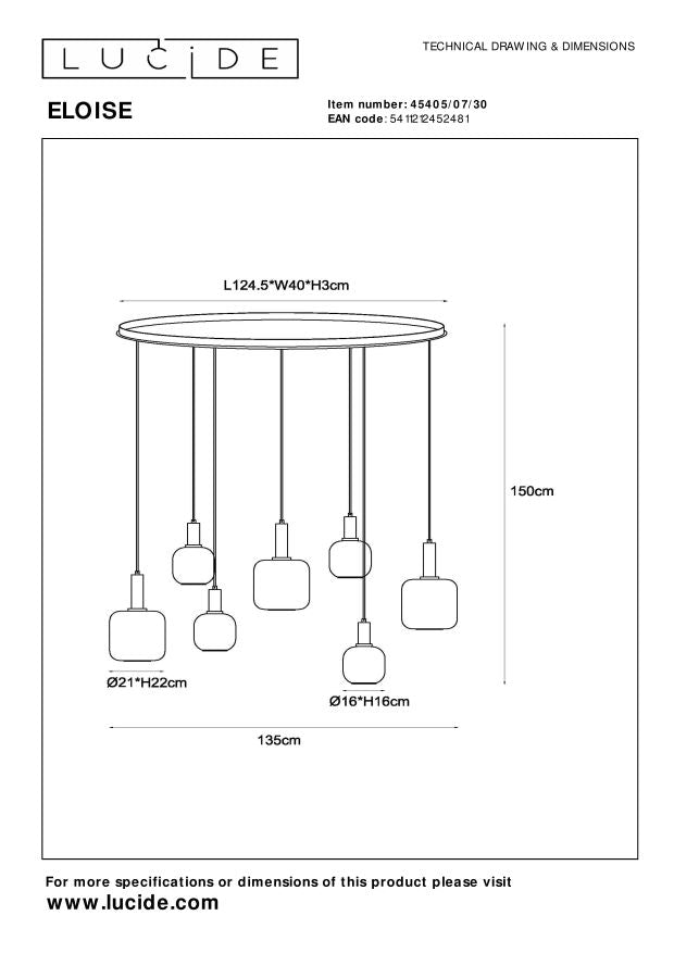 Elegant en extravagant: Eloise zoekt de balans met maar liefst 7 pendels in gefumeerd glas. De lampen hangen op gelijke hoogte of speels ongelijk in een cirkel op de metalen bevestigingsplaat. Elke hanglamp heeft een diameter van 21 centimeter, is vervaardigd uit hoogwaardig glas en is in hoogte verstelbaar. Tel dat bij de aansluiting op een externe dimmer en je zet deze hanglamp met gemak naar je hand. Intiem of uitgelaten? Vertrouw op Eloise om een snuifje drama toe te voegen aan je woon- of slaapkamer. Unieke productkenmerken: • Geschikt voor toepassing met LED lichtbronnen • Deze lamp is in hoogte verstelbaar • Eenvoudig aan te sluiten op een dimmer (excl.) • Vervaardigd uit hoogwaardig glas Belangrijke productkenmerken: • Verbruik: 7x40W / 230V / Dimbaar (lichtbronnen niet inbegrepen) • Afmetingen: L.150 x B.50 x H.150 cm • 5 Jaar garantie op het armatuur / Passende lichtbron is EAN: 5411212491152 Waarom kiezen voor Lucide verlichting? Lucide staat voor trendsettend design, vakmanschap en betrouwbaarheid. Als Belgisch familiebedrijf met ruim drie decennia aan expertise ontwerpen wij hoogwaardige verlichting die elke ruimte – binnen én buiten – verrijkt en transformeert. Onze veelzijdige collectie omvat duurzame armaturen en energiezuinige lichtbronnen, zorgvuldig ontworpen door onze eigen experts en geproduceerd volgens de strengste CE-normen. Met ons uitgebreide assortiment bieden we jou altijd een geschikte lichtoplossing, ongeacht stijl of ruimte. Zo verlichten we niet enkel jouw leefruimte maar ook jouw keuzeproces in de zoektocht naar kwalitatieve betaalbare verlichting. Bij Lucide combineren we innovatie met vakmanschap, voor verlichting die niet alleen sfeer toevoegt, maar van ieder huis een thuis maakt.