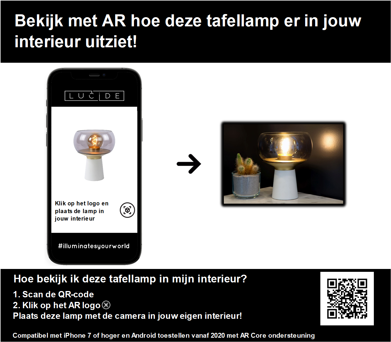 Richt de camera van je mobiele telefoon of tablet op de QR-code. Klik de link aan die in beeld verschijnt en het product wordt virtueel in je eigen huis geplaatst. Zo weet je zeker of het bij je past.