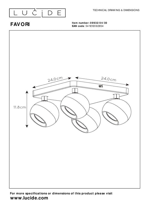 Je kunstwerk belichten en tegelijk zien waar je loopt? Het kan. Met de viervoudige Favori opbouwspot. De charmante, afgeplatte bollen spots draaien en keren zich in alle mogelijke richtingen. Bovendien koppel je deze plafondspot makkelijk op een externe dimmer. Ja, Favori laat je werkelijk alle hoeken van de kamer zien. Toch blijft deze spot compact met zijn 24 op 24 centimeter en net geen 12 centimeter hoogte. Door zijn dimfunctie creëer je in alle eenvoud de lichtsterkte naar wens en volgens je gemoed. Unieke productkenmerken: • Geschikt voor toepassing met LED lichtbronnen • Deze lamp is draaibaar en kantelbaar • Eenvoudig aan te sluiten op een dimmer (excl.) • Vervaardigd uit hoogwaardig metaal Belangrijke productkenmerken: • Verbruik: 4x5W / 230V / Dimbaar (excl.) • Afmetingen: L.24 x B.24 x H.11,8 cm • 2 Jaar garantie op het armatuur / Passende lichtbron is EAN: 5411212491237 Waarom Lucide verlichting kopen? Lucide ontwikkelt en produceert sinds haar oprichting in 1992 hoogwaardige en trend zettende lichtoplossingen. Deze 2 elementen zijn de basis voor het toonaangevend assortiment van het in Antwerpen gevestigde bedrijf. Een team van Lucide designers, aangevuld met freelance ontwerpers, ontwikkelen dagelijks tal van nieuwe producten. Innovatieve materiaalkeuze, vormgeving en kleurtoepassing in combinatie met de meest actuele lichttechnologie stelt Lucide daarbij continue centraal.