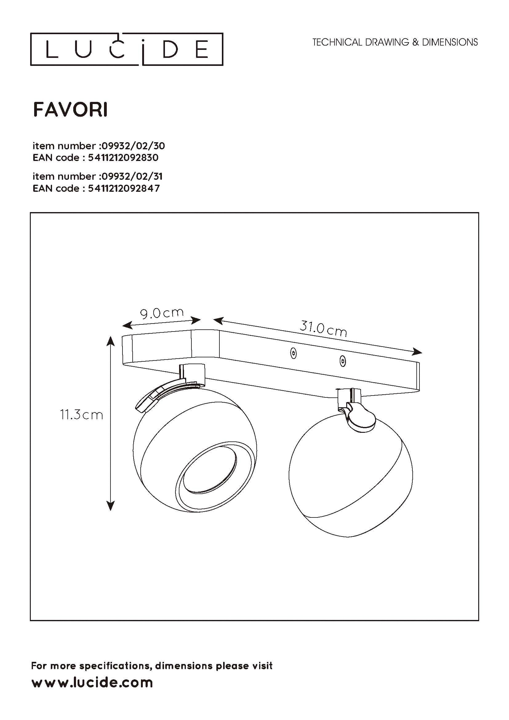 Favori, dat is 'spot on', in tweevoud. De twee elegante, bolvormige spots hechten zich vast aan een rechthoekige plafondplaat. Toch zijn ze uiterst wendbaar. Zo heb jij altijd en overal het licht hoe jij het wil. Extra krachtig door ze samen te richten, speels door ze af te wenden. De dubbele dimbare opbouwspot voelt zich in zijn nopjes in je woonkamer boven een commode, in de gang of zelfs in de slaapkamer. Favori is 9 centimeter breed, 31 centimeter lang en iets meer dan 11 centimeter hoog. Unieke productkenmerken: • Geschikt voor toepassing met LED lichtbronnen • Deze lamp is draaibaar en kantelbaar • Eenvoudig aan te sluiten op een dimmer (excl.) • Vervaardigd uit hoogwaardig metaal Belangrijke productkenmerken: • Verbruik: 2x5W / 230V / Dimbaar (lichtbronnen niet inbegrepen) • Afmetingen: L.31 x B.9 x H.11,3 cm • 2 Jaar garantie op het armatuur / Passende lichtbron is EAN: 5411212491237 Waarom kiezen voor Lucide verlichting? Lucide staat voor trendsettend design, vakmanschap en betrouwbaarheid. Als Belgisch familiebedrijf met ruim drie decennia aan expertise ontwerpen wij hoogwaardige verlichting die elke ruimte – binnen én buiten – verrijkt en transformeert. Onze veelzijdige collectie omvat duurzame armaturen en energiezuinige lichtbronnen, zorgvuldig ontworpen door onze eigen experts en geproduceerd volgens de strengste CE-normen. Met ons uitgebreide assortiment bieden we jou altijd een geschikte lichtoplossing, ongeacht stijl of ruimte. Zo verlichten we niet enkel jouw leefruimte maar ook jouw keuzeproces in de zoektocht naar kwalitatieve betaalbare verlichting. Bij Lucide combineren we innovatie met vakmanschap, voor verlichting die niet alleen sfeer toevoegt, maar van ieder huis een thuis maakt.