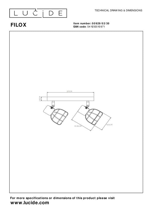 Van de hal door de woonkamer naar de keuken, of de trap op naar je slaapkamer of bureau. Filox is een plafondlamp met 2 lichtbronnen die je in zowat iedere ruimte gezelschap houdt. Het strakke metalen raster dat de lampenkap vormt, biedt een moderne toets in een retro design. Je kantelt en draait de lichtbronnen naar de plek waar je het licht van Filox het meeste nodig hebt. Deze plafondverlichting sluit je eenvoudig aan op een dimmer, voor de perfecte sfeer op ieder tijdstip van de dag. Unieke productkenmerken: • Geschikt voor toepassing met LED lichtbronnen • Deze lamp is draaibaar en kantelbaar • Eenvoudig aan te sluiten op een dimmer (excl.) • Vervaardigd uit hoogwaardig metaal Belangrijke productkenmerken: • Verbruik: 2x40W / 230V / Dimbaar (excl.) • Afmetingen: L.27 x B.10 x H.17 cm • 2 Jaar garantie op het armatuur / Passende lichtbron is EAN: 5411212491343 Waarom Lucide verlichting kopen? Lucide ontwikkelt en produceert sinds haar oprichting in 1992 hoogwaardige en trend zettende lichtoplossingen. Deze 2 elementen zijn de basis voor het toonaangevend assortiment van het in Antwerpen gevestigde bedrijf. Een team van Lucide designers, aangevuld met freelance ontwerpers, ontwikkelen dagelijks tal van nieuwe producten. Innovatieve materiaalkeuze, vormgeving en kleurtoepassing in combinatie met de meest actuele lichttechnologie stelt Lucide daarbij continue centraal.