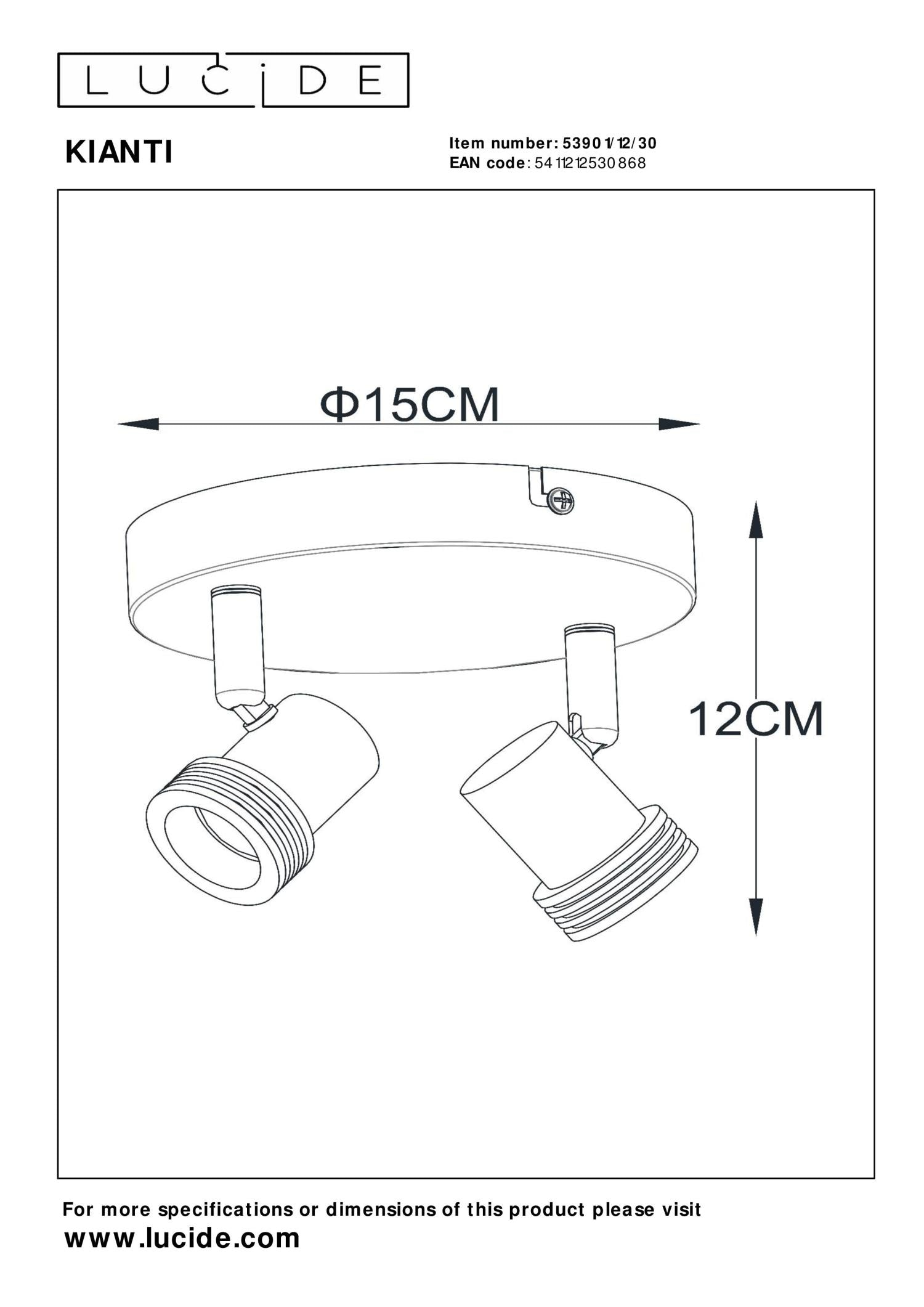 Verhoog je woning met de Lucide KIANTI Plafondspot, een perfecte combinatie van moderne elegantie en functionaliteit. Gemaakt van hoogwaardige materialen, heeft de KIANTI een strak, minimalistisch design dat naadloos in eigentijdse interieurs past. De verstelbare spot zorgt voor veelzijdige verlichting, ideaal voor het benadrukken van je favoriete decor of het creëren van een gezellige sfeer. Of het nu in de woonkamer, keuken of gang is, deze innovatieve plafondlamp voegt een luxe uitstraling toe aan elke ruimte. Transformeer je huis met de KIANTI: stijl en schittering in perfecte harmonie! Unieke productkenmerken: • Geschikt voor toepassing met LED lichtbronnen • Eenvoudig aan te sluiten op een dimmer (excl.) • Vervaardigd uit hoogwaardig metaal Belangrijke productkenmerken: • Verbruik: 2x50W / 230V / Dimbaar (lichtbronnen niet inbegrepen) • Afmetingen: Ø15 cm \ H.12 cm • 2 Jaar garantie op het armatuur / Passende lichtbron is EAN: 5411212490643 Waarom kiezen voor Lucide verlichting? Lucide staat voor trendsettend design, vakmanschap en betrouwbaarheid. Als Belgisch familiebedrijf met ruim drie decennia aan expertise ontwerpen wij hoogwaardige verlichting die elke ruimte – binnen én buiten – verrijkt en transformeert. Onze veelzijdige collectie omvat duurzame armaturen en energiezuinige lichtbronnen, zorgvuldig ontworpen door onze eigen experts en geproduceerd volgens de strengste CE-normen. Met ons uitgebreide assortiment bieden we jou altijd een geschikte lichtoplossing, ongeacht stijl of ruimte. Zo verlichten we niet enkel jouw leefruimte maar ook jouw keuzeproces in de zoektocht naar kwalitatieve betaalbare verlichting. Bij Lucide combineren we innovatie met vakmanschap, voor verlichting die niet alleen sfeer toevoegt, maar van ieder huis een thuis maakt.