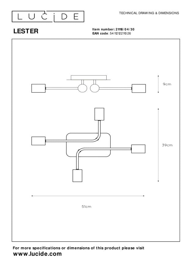 Met Lester kan je alle kanten op. Letterlijk. Deze plafonnière van hoogwaardig metaal heeft vier lichtpunten, een in elke windrichting. De strakke bevestigingsplaat en de elegante, minimalistische vormgeving maken Lester een moderne toevoeging voor in je keuken, woonkamer of slaapkamer. Met filamentlampen komt zijn creatieve design het best tot uiting. Je sluit plafondlamp Lester eenvoudig aan op een dimmer. Zo creëer je in een handomdraai de perfecte sfeer. Dat is 360° plezier. Unieke productkenmerken: • Geschikt voor toepassing met LED lichtbronnen • Eenvoudig aan te sluiten op een dimmer (excl.) • Vervaardigd uit hoogwaardig metaal Belangrijke productkenmerken: • Verbruik: 4x40W / 230V / Dimbaar (lichtbronnen niet inbegrepen) • Afmetingen: L.51 x B.39 x H.9 cm • 2 Jaar garantie op het armatuur / Passende lichtbron is EAN: 5411212491060 Waarom kiezen voor Lucide verlichting? Lucide staat voor trendsettend design, vakmanschap en betrouwbaarheid. Als Belgisch familiebedrijf met ruim drie decennia aan expertise ontwerpen wij hoogwaardige verlichting die elke ruimte – binnen én buiten – verrijkt en transformeert. Onze veelzijdige collectie omvat duurzame armaturen en energiezuinige lichtbronnen, zorgvuldig ontworpen door onze eigen experts en geproduceerd volgens de strengste CE-normen. Met ons uitgebreide assortiment bieden we jou altijd een geschikte lichtoplossing, ongeacht stijl of ruimte. Zo verlichten we niet enkel jouw leefruimte maar ook jouw keuzeproces in de zoektocht naar kwalitatieve betaalbare verlichting. Bij Lucide combineren we innovatie met vakmanschap, voor verlichting die niet alleen sfeer toevoegt, maar van ieder huis een thuis maakt.