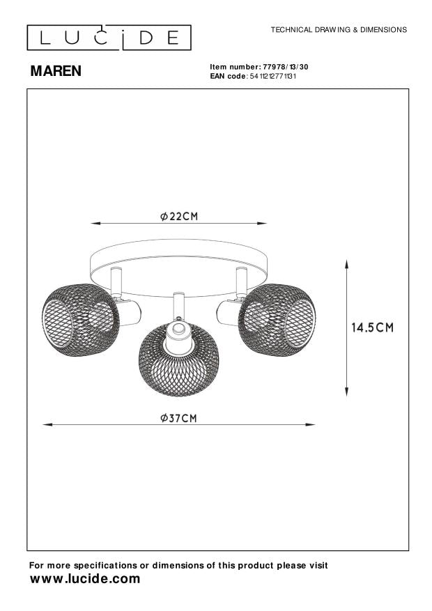 Dat de heilige drievuldigheid niet altijd een religieuze context heeft, bewijst plafondspot Maren. Zijn drie lichtpunten zijn netjes verspreid over de cirkelvormige bevestigingsplaat. Elk van de fittingen heeft een omhulsel van metalen gaaswerk, in een afgeronde koker. De lichtbundels stuur je eenvoudig door de drie armen, onafhankelijk van elkaar, te draaien en te kantelen. Een retro blikvanger met flexibele mogelijkheden dus. Zeker als je Maren ook nog eens aansluit op een dimmer. Unieke productkenmerken: • Geschikt voor toepassing met LED lichtbronnen • Deze lamp is draaibaar en kantelbaar • Eenvoudig aan te sluiten op een dimmer (excl.) • Vervaardigd uit hoogwaardig metaal Belangrijke productkenmerken: • Verbruik: 3x25W / 230V / Dimbaar (lichtbronnen niet inbegrepen) • Afmetingen: Ø37 cm \ H.14,5 cm • 2 Jaar garantie op het armatuur / Passende lichtbron is EAN: 5411212491343 Waarom kiezen voor Lucide verlichting? Lucide staat voor trendsettend design, vakmanschap en betrouwbaarheid. Als Belgisch familiebedrijf met ruim drie decennia aan expertise ontwerpen wij hoogwaardige verlichting die elke ruimte – binnen én buiten – verrijkt en transformeert. Onze veelzijdige collectie omvat duurzame armaturen en energiezuinige lichtbronnen, zorgvuldig ontworpen door onze eigen experts en geproduceerd volgens de strengste CE-normen. Met ons uitgebreide assortiment bieden we jou altijd een geschikte lichtoplossing, ongeacht stijl of ruimte. Zo verlichten we niet enkel jouw leefruimte maar ook jouw keuzeproces in de zoektocht naar kwalitatieve betaalbare verlichting. Bij Lucide combineren we innovatie met vakmanschap, voor verlichting die niet alleen sfeer toevoegt, maar van ieder huis een thuis maakt.