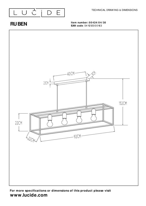 Deze hanglamp, genaamd Ruben, is een absolute eyecatcher in je interieur. De strakke lamp met vier lichtbronnen valt op door de fitting in messing. Het stijlvolle, metalen frame van Ruben maakt dat de lamp stijlvol boven je eettafel of keukeneiland past. De hoogte van de lamp bepaal je zelf. Je past de lengte van de snoeren eenvoudig aan voor je Ruben aan het plafond bevestigt. Kies een ledlamp met warm, wit licht voor nog meer sfeer. Ook eenvoudig aansluiten op een dimmer is mogelijk. Unieke productkenmerken: • Geschikt voor toepassing met LED lichtbronnen • Deze lamp is in hoogte verstelbaar • Eenvoudig aan te sluiten op een dimmer (excl.) • Vervaardigd uit hoogwaardig metaal Belangrijke productkenmerken: • Verbruik: 4x40W / 230V / Dimbaar (lichtbronnen niet inbegrepen) • Afmetingen: L.92 x B.22 x H.150 cm • 2 Jaar garantie op het armatuur / Passende lichtbron is EAN: 5411212491046 Waarom kiezen voor Lucide verlichting? Lucide staat voor trendsettend design, vakmanschap en betrouwbaarheid. Als Belgisch familiebedrijf met ruim drie decennia aan expertise ontwerpen wij hoogwaardige verlichting die elke ruimte – binnen én buiten – verrijkt en transformeert. Onze veelzijdige collectie omvat duurzame armaturen en energiezuinige lichtbronnen, zorgvuldig ontworpen door onze eigen experts en geproduceerd volgens de strengste CE-normen. Met ons uitgebreide assortiment bieden we jou altijd een geschikte lichtoplossing, ongeacht stijl of ruimte. Zo verlichten we niet enkel jouw leefruimte maar ook jouw keuzeproces in de zoektocht naar kwalitatieve betaalbare verlichting. Bij Lucide combineren we innovatie met vakmanschap, voor verlichting die niet alleen sfeer toevoegt, maar van ieder huis een thuis maakt.
