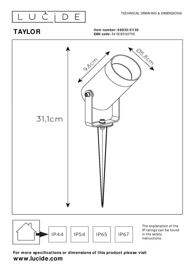 Niets zo aangenaam als 's avonds thuiskomen in een warm bad van zacht licht. Taylor voelt zich in zijn nopjes met zijn pootje in het gras of op zijn sokkel gericht naar je gevel of oprijlaan. Deze grondspie is ontworpen voor alle weeromstandigheden buiten en laat zich niet snel kennen. In totale lengte komt de lamp tot zo'n 31,1 centimeter. De lichtbron zit in een aluminium koker van bijna 10 centimeter lang en een diameter van net geen 6 centimeter. Unieke productkenmerken: • Geschikt voor toepassing met LED lichtbron • Deze lamp is draaibaar en kantelbaar • Eenvoudig aan te sluiten op een wandschakelaar (excl.) • Vervaardigd uit hoogwaardig aluminium Belangrijke productkenmerken: • Speciaal ontworpen voor langdurig en betrouwbaar buitengebruik (Conform IP65) • Verbruik: 1x50W / 230V / (lichtbron niet inbegrepen) • Afmetingen: Ø10 cm \ H.26 cm • 2 Jaar garantie op het armatuur / Passende lichtbron is EAN: 5411212490643 Waarom kiezen voor Lucide verlichting? Lucide staat voor trendsettend design, vakmanschap en betrouwbaarheid. Als Belgisch familiebedrijf met ruim drie decennia aan expertise ontwerpen wij hoogwaardige verlichting die elke ruimte – binnen én buiten – verrijkt en transformeert. Onze veelzijdige collectie omvat duurzame armaturen en energiezuinige lichtbronnen, zorgvuldig ontworpen door onze eigen experts en geproduceerd volgens de strengste CE-normen. Met ons uitgebreide assortiment bieden we jou altijd een geschikte lichtoplossing, ongeacht stijl of ruimte. Zo verlichten we niet enkel jouw leefruimte maar ook jouw keuzeproces in de zoektocht naar kwalitatieve betaalbare verlichting. Bij Lucide combineren we innovatie met vakmanschap, voor verlichting die niet alleen sfeer toevoegt, maar van ieder huis een thuis maakt.