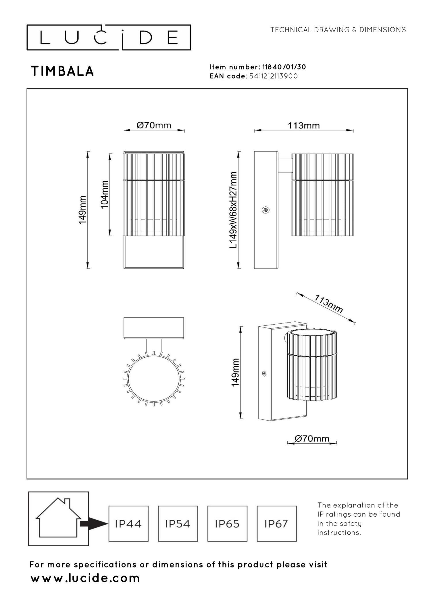 Strak, betrouwbaar en stijlvol, de Lucide TIMBALA is een veelzijdige wandlamp voor buiten die perfect aansluit bij moderne gevels, tuinmuren of entreepartijen. Deze compacte wandspot is vervaardigd uit hoogwaardig aluminium met een zwarte, matte poedercoating en biedt downlight-verlichting via een GU10-fitting (max. 40W, dimbaar via externe dimmer). Dankzij de IP44-classificatie is TIMBALA bestand tegen regen en vocht, waardoor hij uitermate geschikt is voor langdurig gebruik buitenshuis. Met een breedte van 7 cm, een diepte van 11,3 cm en een hoogte van 14,9 cm combineert deze spot efficiëntie met elegantie. Kies voor functioneel buitenlicht met een minimalistisch design. Unieke productkenmerken: • Geschikt voor toepassing met LED lichtbron • Eenvoudig aan te sluiten op een dimmer (excl.) • Vervaardigd uit hoogwaardig aluminium Belangrijke productkenmerken: • Speciaal ontworpen voor langdurig en betrouwbaar buitengebruik (Conform IP44) • Verbruik: 1x7W / 230V / Dimbaar (lichtbron niet inbegrepen) • Afmetingen: L.11,3 x B.7 x H.14,9 cm • 2 Jaar garantie op het armatuur / Passende lichtbron is EAN: 5411212490643 Waarom kiezen voor Lucide verlichting? Lucide staat voor trendsettend design, vakmanschap en betrouwbaarheid. Als Belgisch familiebedrijf met ruim drie decennia aan expertise ontwerpen wij hoogwaardige verlichting die elke ruimte – binnen én buiten – verrijkt en transformeert. Onze veelzijdige collectie omvat duurzame armaturen en energiezuinige lichtbronnen, zorgvuldig ontworpen door onze eigen experts en geproduceerd volgens de strengste CE-normen. Met ons uitgebreide assortiment bieden we jou altijd een geschikte lichtoplossing, ongeacht stijl of ruimte. Zo verlichten we niet enkel jouw leefruimte maar ook jouw keuzeproces in de zoektocht naar kwalitatieve betaalbare verlichting. Bij Lucide combineren we innovatie met vakmanschap, voor verlichting die niet alleen sfeer toevoegt, maar van ieder huis een thuis maakt.