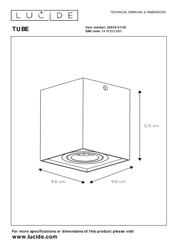 De opbouwspot Tube vierkant van Lucide is een, uit volledig aluminium vervaardigd armatuur en heeft hierdoor een zeer hoogwaardige uitstraling. Met een afmeting van 9.5cm x 9.6cm laat hij zich eenvoudig over een centraaldoos plaatsen. Dit artikel is bij uitstek geschikt als lichtpunt in een kleine hal of toilet. In serie geplaatst is de Tube ook perfect te gebruiken boven bijvoorbeeld een bar of keukenblad. Door zijn 360 graden draaibare en kantelbare spot is de Tube op ieder gewenst punt in de ruimte te richten. De Tube is voorzien van een GU10 hoogvolt fitting en wordt geleverd zonder lichtbron. Aan u de keus om er een mooie al dan niet dimbare GU10 LED spot of een traditionele dimbare GU10 halogeenspot in te gebruiken. De Tube is verkrijgbaar in de kleuren aluminium, zwart en wit. Unieke productkenmerken: • Geschikt voor toepassing met LED lichtbron • Deze lamp is draaibaar en kantelbaar • Eenvoudig aan te sluiten op een dimmer (excl.) • Vervaardigd uit hoogwaardig aluminium Belangrijke productkenmerken: • Verbruik: 1x50W / 230V / Dimbaar (lichtbron niet inbegrepen) • Afmetingen: L.9,6 x B.9,6 x H.12,5 cm • 2 Jaar garantie op het armatuur / Passende lichtbron is EAN: 5411212490643 Waarom kiezen voor Lucide verlichting? Lucide staat voor trendsettend design, vakmanschap en betrouwbaarheid. Als Belgisch familiebedrijf met ruim drie decennia aan expertise ontwerpen wij hoogwaardige verlichting die elke ruimte – binnen én buiten – verrijkt en transformeert. Onze veelzijdige collectie omvat duurzame armaturen en energiezuinige lichtbronnen, zorgvuldig ontworpen door onze eigen experts en geproduceerd volgens de strengste CE-normen. Met ons uitgebreide assortiment bieden we jou altijd een geschikte lichtoplossing, ongeacht stijl of ruimte. Zo verlichten we niet enkel jouw leefruimte maar ook jouw keuzeproces in de zoektocht naar kwalitatieve betaalbare verlichting. Bij Lucide combineren we innovatie met vakmanschap, voor verlichting die niet alleen sfeer toevoegt, maar van ieder huis een thuis maakt.