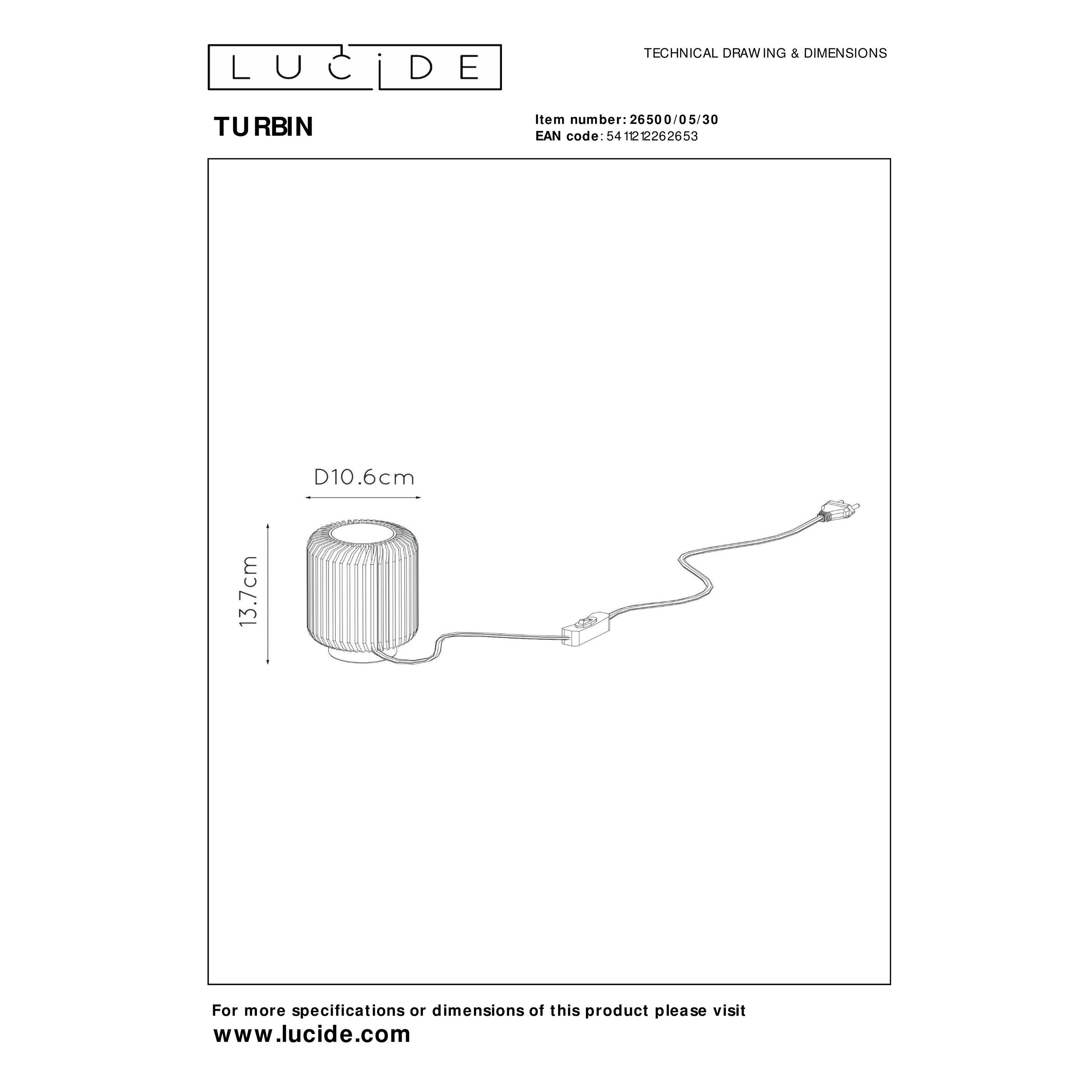 Met de sierlijkheid van een ronddraaiende prinses in haar beste baljurk golven de aluminium lamellen zich rond de geïntegreerde ledverlichting van Turbin. De schattige tafellamp is een moderne cilinder van amper meer dan 10 centimeter breed, lang en hoog. De geïntegreerde ledverlichting verspreidt het licht rondom, door de kieren van het aluminium omhulsel. Geheel in de lijn van zijn compact formaat, is de tafellamp makkelijk te installeren: je stopt enkel het snoer in het stopcontact en schakelt Turbin aan of uit met de knop op de lamp. Unieke productkenmerken: • Uitgerust met geïntegreerde LED lamp • Uitgerust met warm wit licht (3000K) • Bedienbaar via aan/uit schakelaar in het snoer • Vervaardigd uit hoogwaardig aluminium Belangrijke productkenmerken: • Verbruik: 1x5W / 230V / (Lichtbron inbegrepen) • Afmetingen: Ø10,6 cm \ H.13,7 cm • 3 Jaar garantie op het armatuur Waarom kiezen voor Lucide verlichting? Lucide staat voor trendsettend design, vakmanschap en betrouwbaarheid. Als Belgisch familiebedrijf met ruim drie decennia aan expertise ontwerpen wij hoogwaardige verlichting die elke ruimte – binnen én buiten – verrijkt en transformeert. Onze veelzijdige collectie omvat duurzame armaturen en energiezuinige lichtbronnen, zorgvuldig ontworpen door onze eigen experts en geproduceerd volgens de strengste CE-normen. Met ons uitgebreide assortiment bieden we jou altijd een geschikte lichtoplossing, ongeacht stijl of ruimte. Zo verlichten we niet enkel jouw leefruimte maar ook jouw keuzeproces in de zoektocht naar kwalitatieve betaalbare verlichting. Bij Lucide combineren we innovatie met vakmanschap, voor verlichting die niet alleen sfeer toevoegt, maar van ieder huis een thuis maakt.