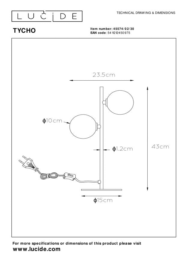 Tafellamp Tycho dankt zijn retro look onder meer aan de kwalitatieve materiaalkeuze: hoogwaardig staal en echt glas geven deze luxueuze lamp vorm. De twee lichtpunten zijn op verschillende hoogte bevestigd aan de strakke stalen voet. De volmaakte bollen zijn op 180° ten opzichte van elkaar gepositioneerd. Ondanks het hoogteverschil straalt Tycho zo een natuurlijk evenwicht uit. Vanuit de kern van de glazen bollen verspreiden de lampen hun aangename gloed in je hedendaags of landelijk interieur. Unieke productkenmerken: • Geschikt voor toepassing met LED lichtbronnen • Bedienbaar via aan/uit schakelaar in het snoer • Vervaardigd uit hoogwaardig staal Belangrijke productkenmerken: • Verbruik: 2x28W / 230V / (lichtbronnen niet inbegrepen) • Afmetingen: L.15 x B.23,5 x H.43 cm • 2 Jaar garantie op het armatuur / Passende lichtbron is EAN: 5411212491916 Waarom kiezen voor Lucide verlichting? Lucide staat voor trendsettend design, vakmanschap en betrouwbaarheid. Als Belgisch familiebedrijf met ruim drie decennia aan expertise ontwerpen wij hoogwaardige verlichting die elke ruimte – binnen én buiten – verrijkt en transformeert. Onze veelzijdige collectie omvat duurzame armaturen en energiezuinige lichtbronnen, zorgvuldig ontworpen door onze eigen experts en geproduceerd volgens de strengste CE-normen. Met ons uitgebreide assortiment bieden we jou altijd een geschikte lichtoplossing, ongeacht stijl of ruimte. Zo verlichten we niet enkel jouw leefruimte maar ook jouw keuzeproces in de zoektocht naar kwalitatieve betaalbare verlichting. Bij Lucide combineren we innovatie met vakmanschap, voor verlichting die niet alleen sfeer toevoegt, maar van ieder huis een thuis maakt.