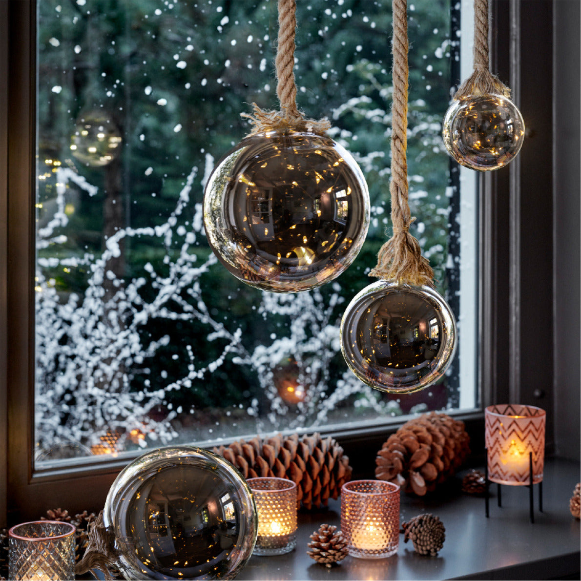Verlichte kerstbal van glas aan een touw van 100 cm. Gemaakt van glas en gehuld in een zilveren glans, voegt deze prachtige bal een vleugje glamour toe aan je feestelijke decor. Met 30 warm witte LED lampjes, en een diameter van 14 cm, brengt deze bal een zachte en uitnodigende gloed in je interieur. Met een steady functie en een timer van 6 uur kun je de verlichting eenvoudig aanpassen aan je behoeften. De IP-20 classificatie maakt deze kerstbal geschikt voor gebruik binnenshuis, en het zilveren kabelontwerp voegt een extra vleugje elegantie toe. Met een werktijd van 72 uur op 3 AA batterijen (niet inbegrepen) kun je langdurig genieten van de betoverende verlichting van deze kerstbal. Hang hem eenvoudig op aan het touw en geniet van de magische ambiance die hij geeft.