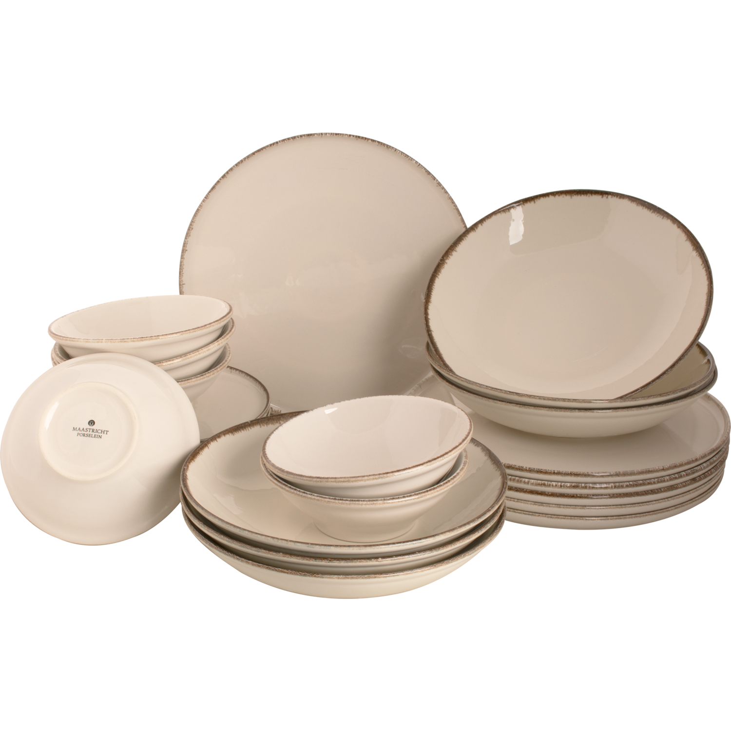 Belangrijkste kenmerken: · Inhoud set: 6 dinerborden 28 cm, 6 ontbijtborden 20 cm, 6 diepe borden 25 cm, 6 schalen 16 cm · Inhoudsmaat: 50 cl · Materiaal: Porselein · Aantal delen: 24-delig · Kleur: Offwhite met een bruine detaillering aan de rand · Merk: Maastricht Porselein · Vaatwasmachinebestendig: Ja · Hittebestendig: Ja, tot 300℃ Porselein Porselein is een kruising tussen glas en aardewerk. Porselein wordt op een hoge temperatuur van 1100℃ gebakken en is daarom erg geschikt voor dagelijks gebruik. Daarnaast kan het materiaal porselein gereinigd worden in de vaatwasmachine. Ook zuren-, geuren-, kleuren en zout zal je porseleinen servies niet aantasten.
