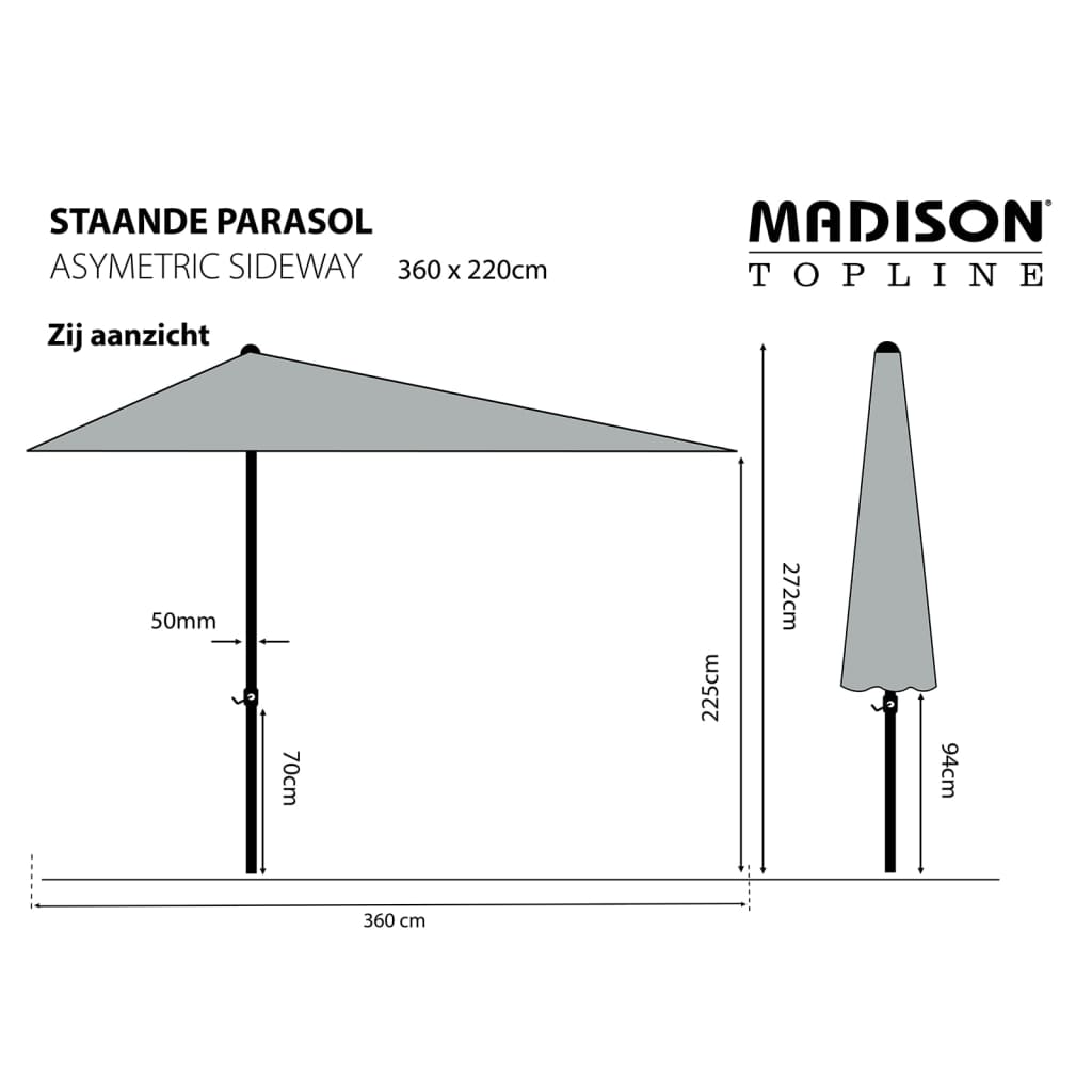 - Afmetingen parasol: 360 x 220 x 270 cm (L x B x H)