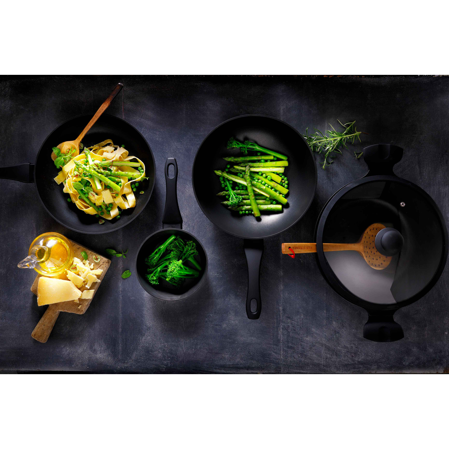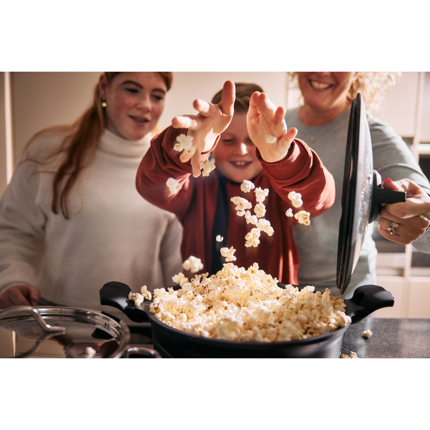 Belangrijkste kenmerken: · Product: 1 braadpan met deksel · Diameter: 28 cm · Inhoudsmaat: 7 liter · Materiaal: Aluminium met glazen deksel · Kleur: Zwart met transparant deksel · Vaatwasmachinebestendig: Nee · Warmtebronnen: Gas, elektrisch, keramisch, inductie