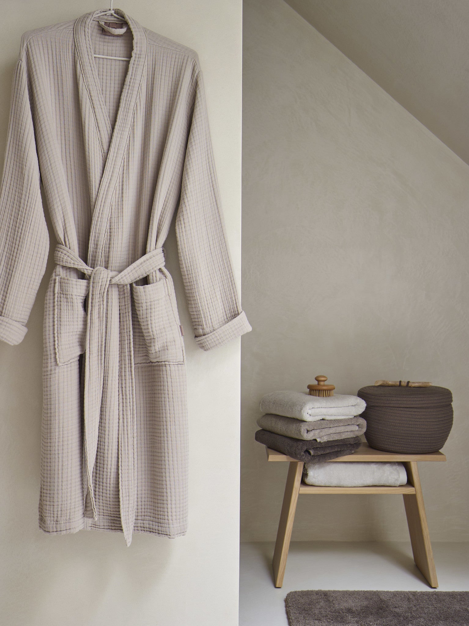 - De badjas is voorzien van diepe steekzakken, een ceintuur en een kimonokraag.