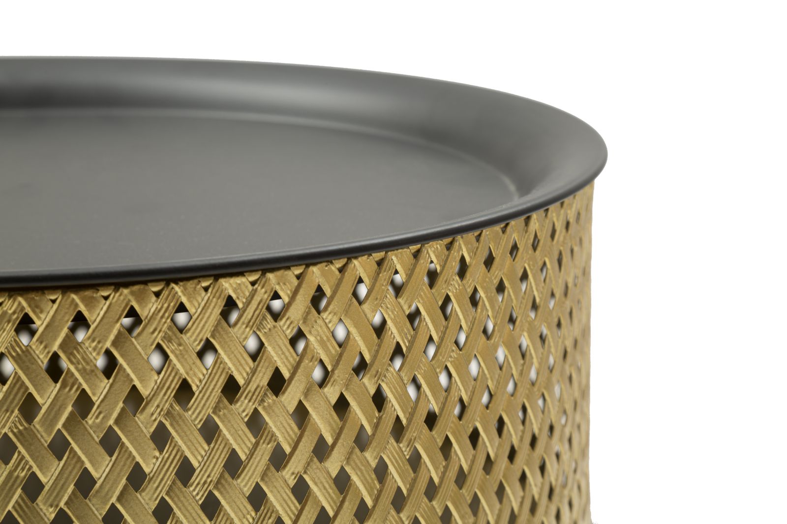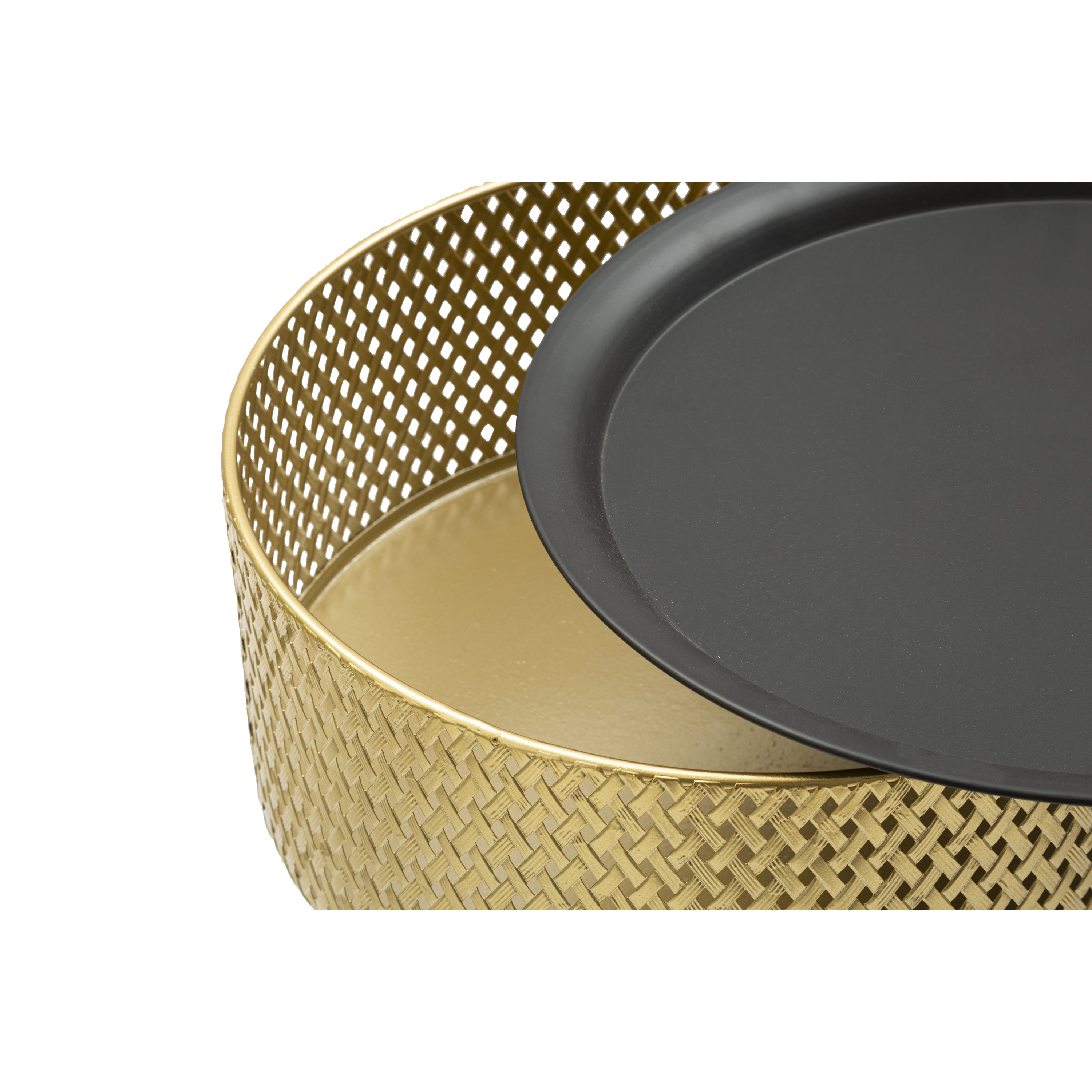 Ronde metalen tafel met zwarte poten en blad in metaal met elegant gesneden gouden frame. De bovenkant kan worden verwijderd om een praktisch handschoenenkastje te onthullen. Afmetingen Ø cm 40x65. Product om te monteren. Gebruik een vochtige doek of stoom om schoon te maken.