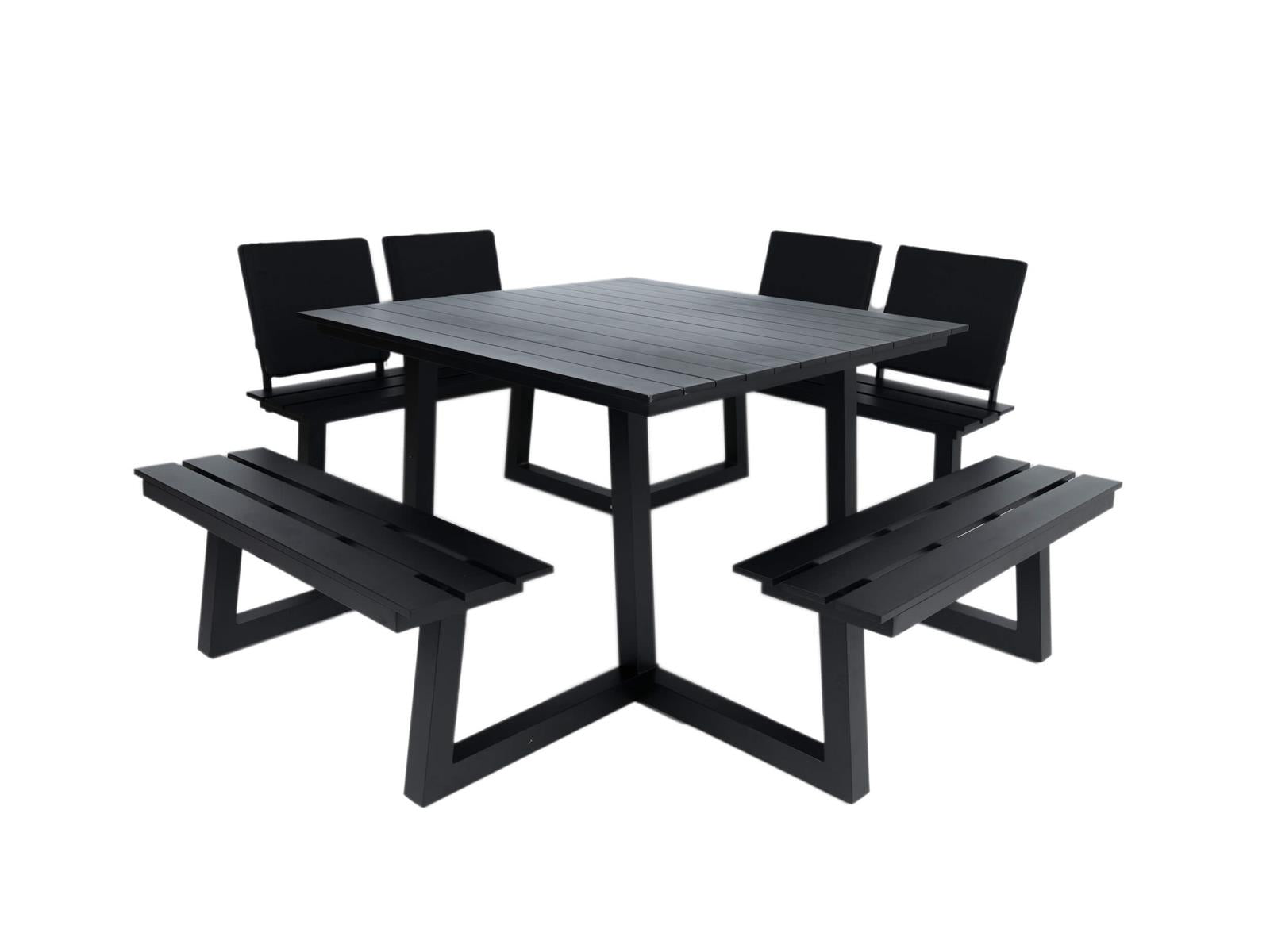 Materiaal De gehele zwarte vierkante picknicktafel is gemaakt uit 100% aluminium. In tegenstelling tot een 100% kunststof picknicktafel of een aluminium met kunststof picknicktafel zal deze picknicktafel nauwelijks vervormen, ook niet bij extreem wisselende weersomstandigheden.