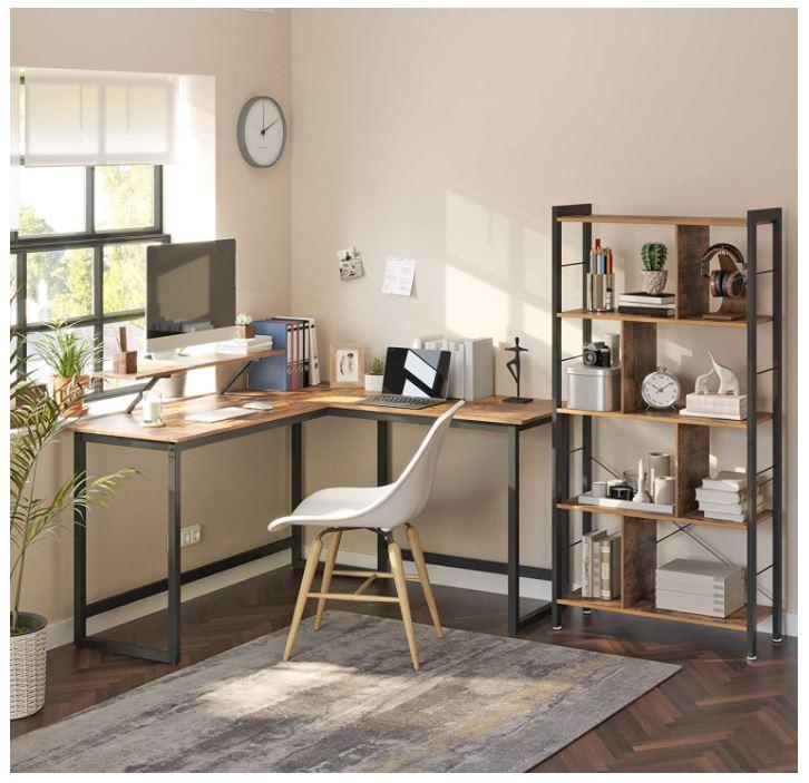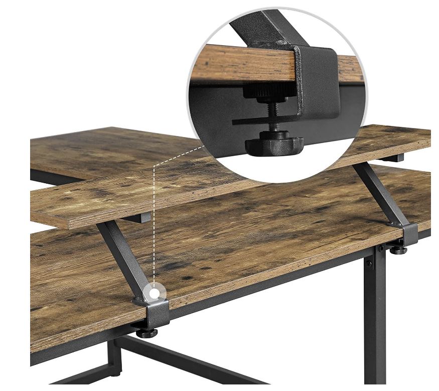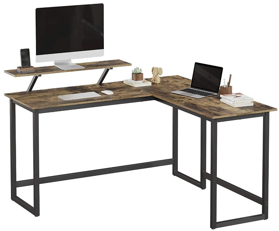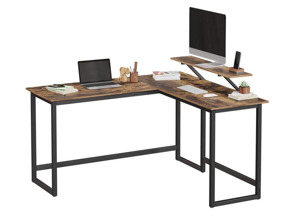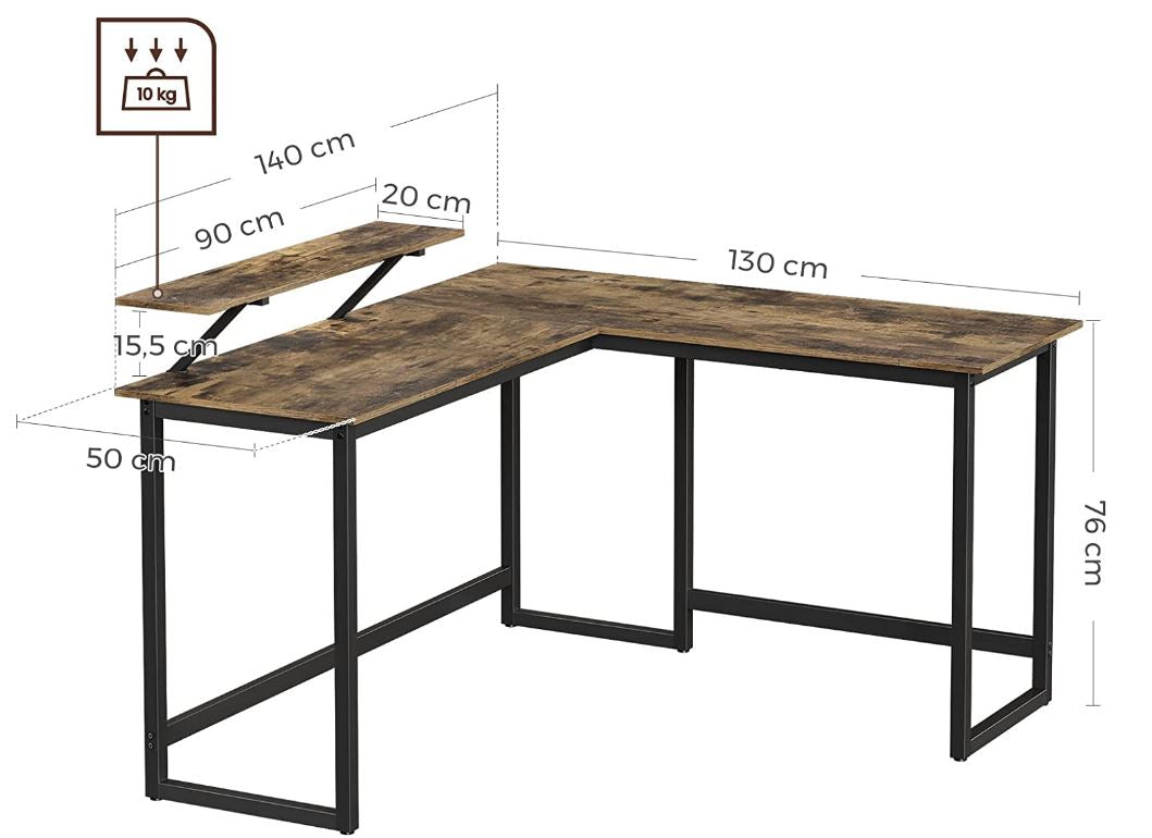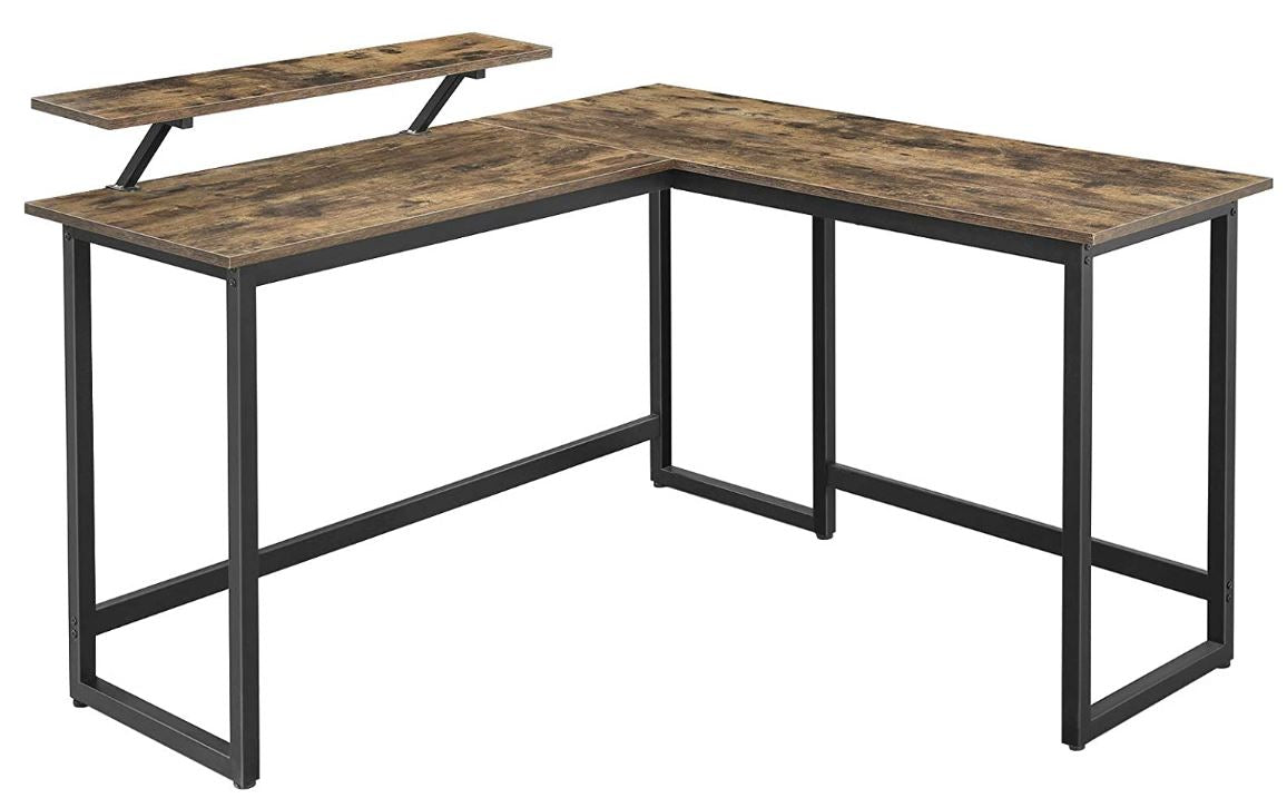 STABIEL EN VEEL OPBERGRUIMTE: Deze L-vormige computertafel combineert een stevig metalen frame met een aantrekkelijk vintage-look tafelblad. Hartstikke veel ruimte voor al je benodigdheden voor tijdens het werken of studeren.