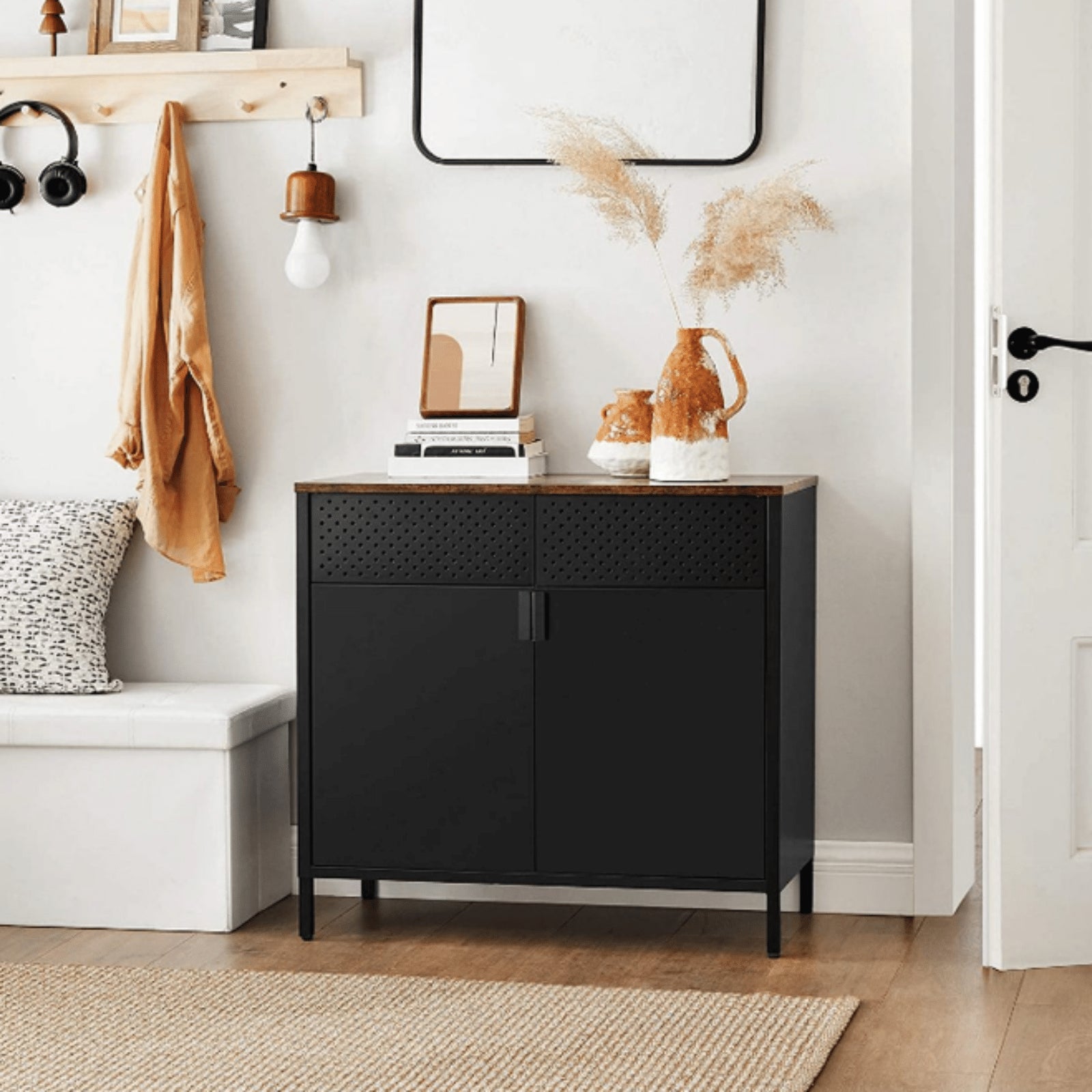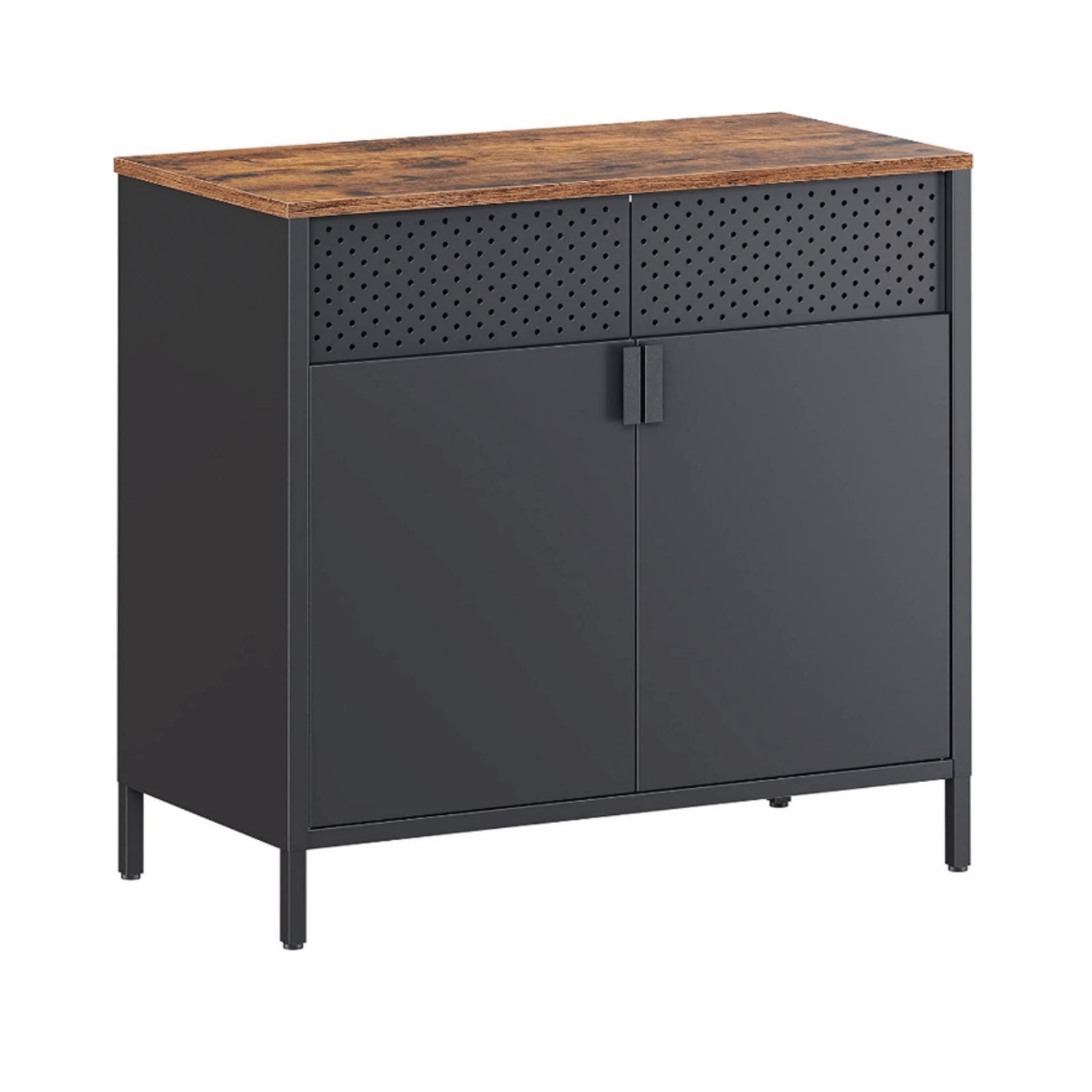 VOOR EEN STIJLVOL HUIS: Rustiek bruin houten blad, zwart metalen frame - deze lieve eenheid zorgt voor een karaktervolle industriële opbergkast JOUW ORGANISATIE, JOUW MANIER: Laat je decoraties zien op de rustieke top, maar hoe zit het met de kansen en de uiteinden die niet zo oogstrelend zijn? Open gewoon de deuren en verberg ze uit het zicht! En schaphoogte? Pas het naar boven of naar beneden aan, afhankelijk van uw behoeften STABIEL, KAN HET ZIJN: Het leven zit vol met veranderingen, maar er is één ding dat stabiel is: de opslagkast. Gemaakt van duurzame spaanplaat en een stevig stalen frame, zal het stevig aan uw zijde staan voor een lange levensduur AFMETINGEN: ?80 x 40 x 76 cm
