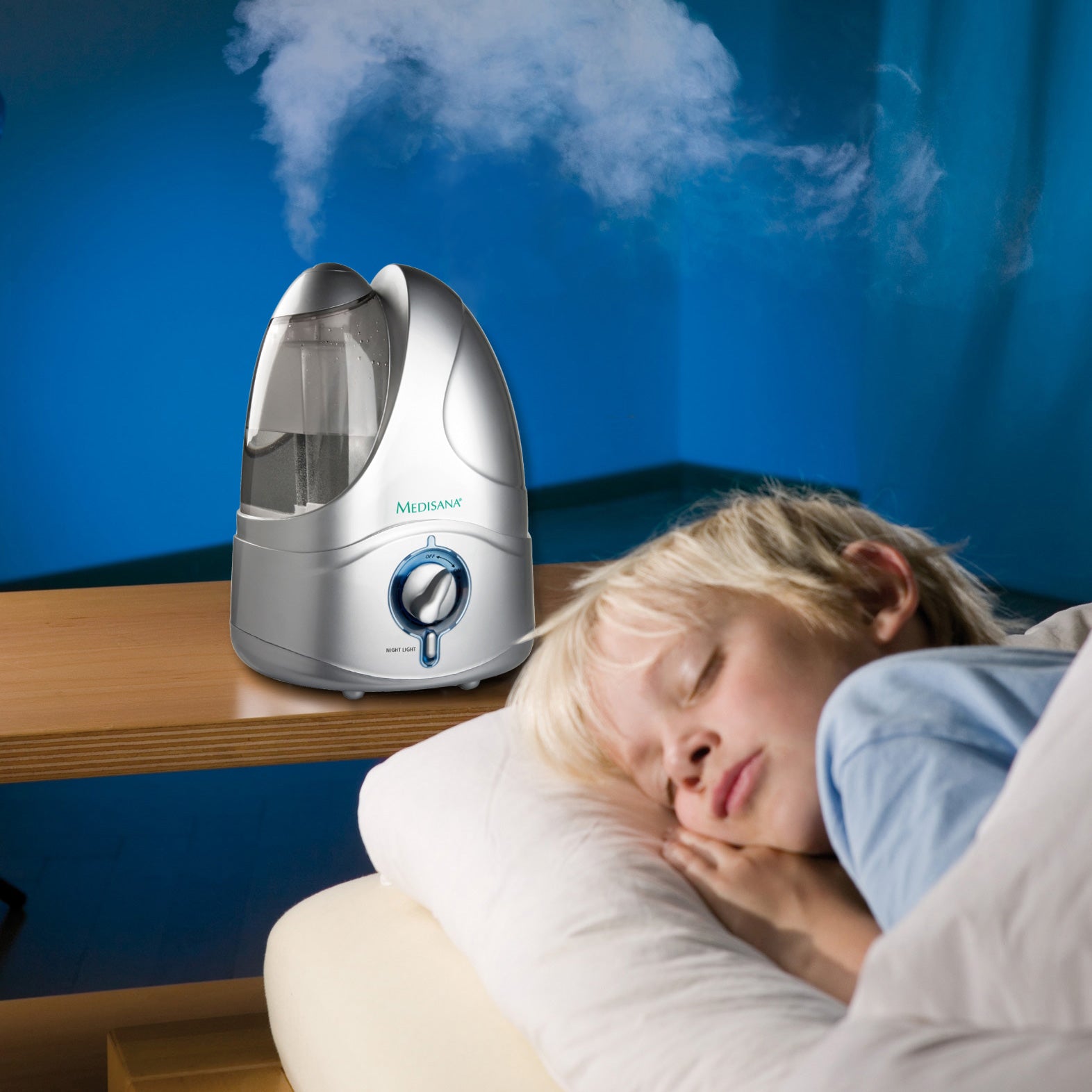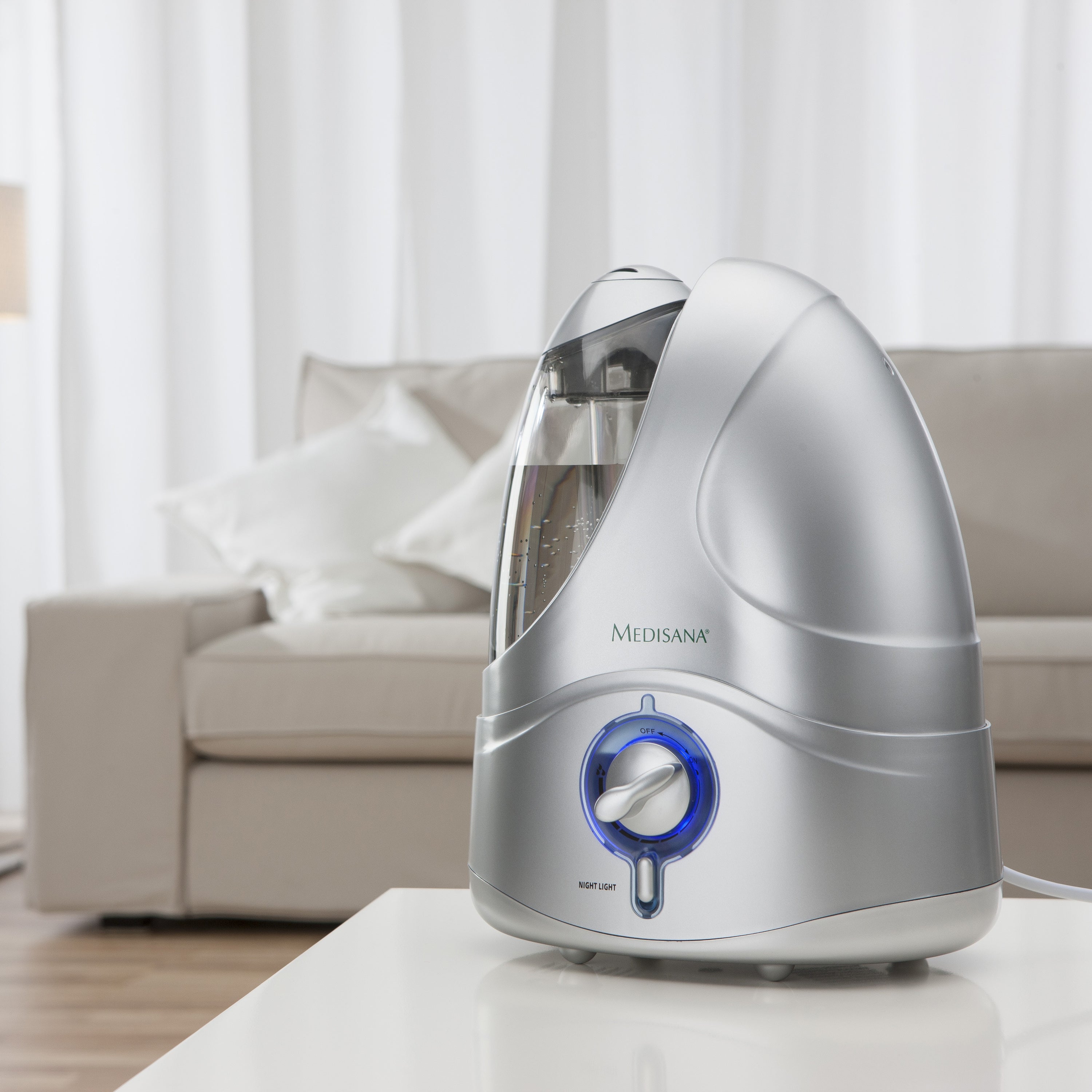 Vooral in de wintermaanden verhoogt te droge kamerlucht de vatbaarheid voor infecties en aandoeningen van de luchtwegen en dat leidt tot vermoeidheid en verminderde concentratie. Gezonde lucht zou een relatieve luchtvochtigheid van 40 tot 60 procent moeten hebben. Gebruik daarom de Medisana UHW Luchtbevochtiger om de lucht in uw huiskamer, slaapkamer of kantoor te bevochtigen. De geluidsarme en energiebesparende technologie van de Medisana luchtbevochtiger verandert water in zeer fijne nevel, die het vochtigheidsgehalte van de lucht verhoogt. Dit verbetert de luchtkwaliteit en voorkomt het uitdrogen van de slijmvliezen en de huid. Een luchtbevochtiger is vaak ook ideaal voor mensen met hooikoorts. Functies/Gebruik Medisana UHW: