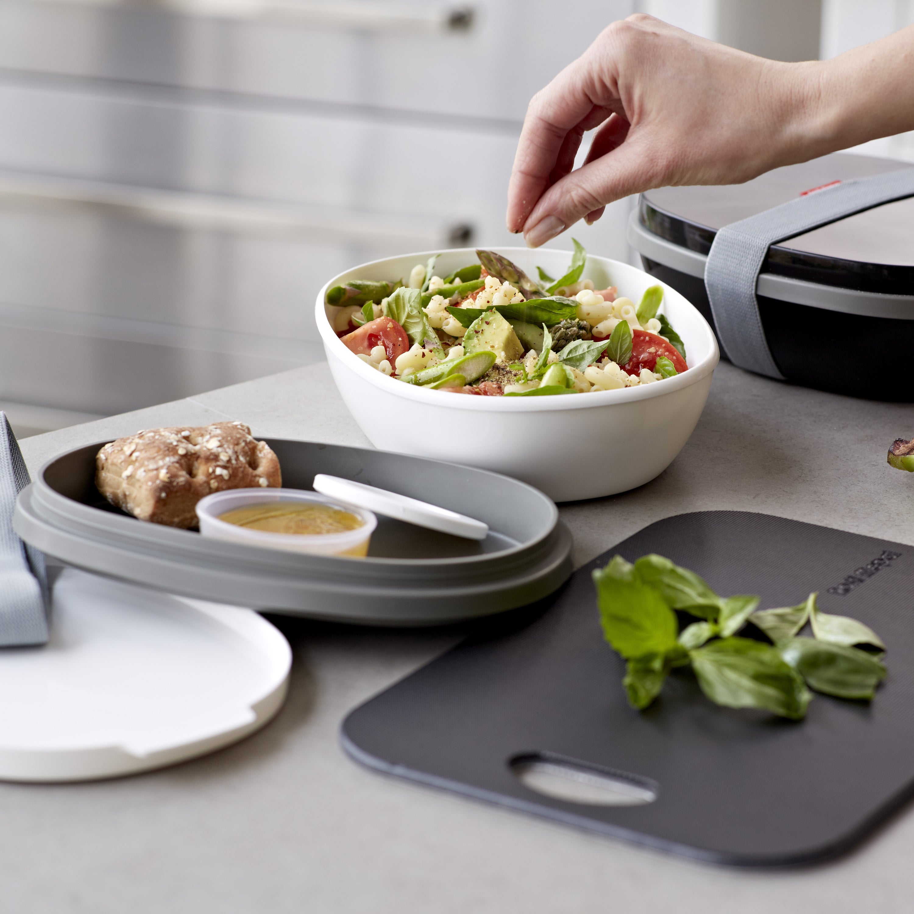 Duo lunchbox De Mepal Ellipse Duo lunchbox bestaat uit twee compartimenten. Zo kun je in het onderste deel bijvoorbeeld een salade meenemen en in het bovenste deel je bestek en een stukje brood. Er zit zelfs een klein extra bakje bij, voor dressing, croutons of pijnboompitjes. Eet je liever warm tussen de middag? Ook daar is over nagedacht: het onderste compartiment van de lunchbox kan gewoon in de magnetron!