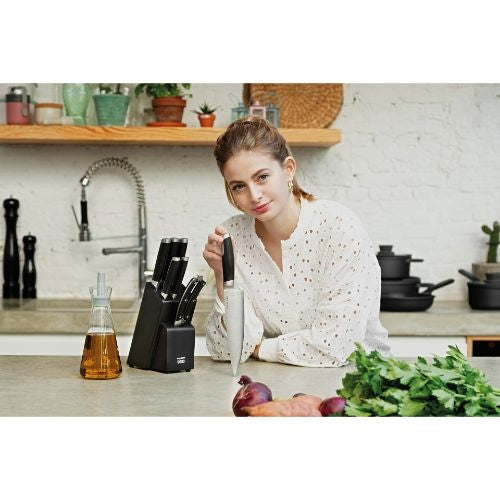 Dit 6-delige messenblok Graphite uit de bekende Leo Line van BergHOFF is een luxe toevoeging aan je keukensetting. Met zijn unieke zwart rubberen houten uitstraling zal hij meteen alle aandacht naar zich toe trekken. Het messenblok heeft een georganiseerde, ruimtebesparende opbergstandaard en de messen in de set hebben allemaal een roestvrijstalenlemmet. Ook hebben al de messen een ergonomisch handvat voor optimale controle tijdens gebruik. De set is uit te breiden met het bijpassende santokumes en de bijpassende gevogelteschaar om de set helemaal compleet te maken.