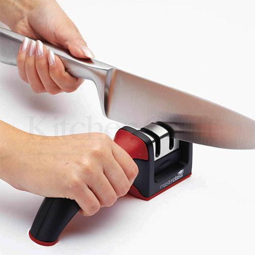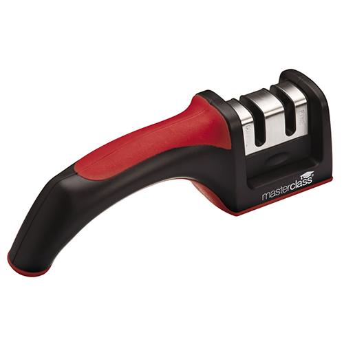 Messenslijper van Masterclass. Handzame messenslijper met twee gleuven: één van rvs voor het scherper maken van uw messen, en één van keramiek voor het precieze bijslijpen en polijsten. Met ergonomisch gevormd soft-grip handvat en non-slip onderkant. Houdt uw messen scherp door deze regelmatig te scherpen met deze messenslijper!