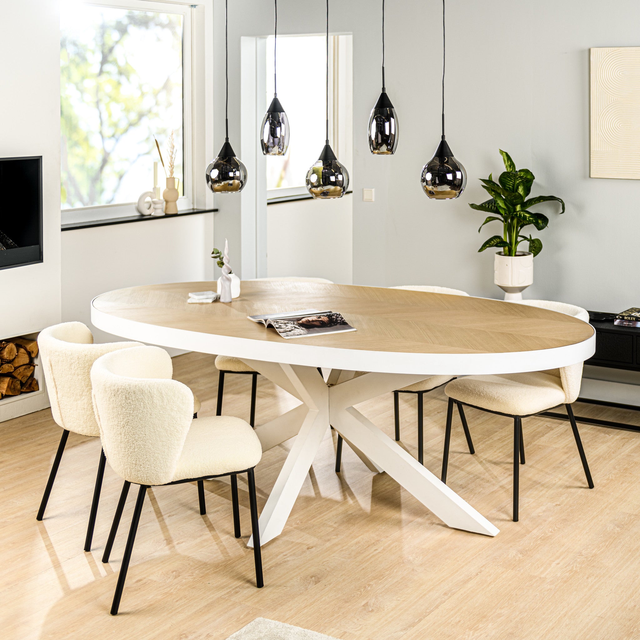 Metal white - Eettafel - ovaal - 230cm - eik fineer - stalen rand - kruispoten - wit Metal white ovale eettafel met eik fineer blad afgewerkt met een witte stalen rand en kruispoten De Metal white meubellijn geeft je interieur een eigen klassevolle uitstraling.