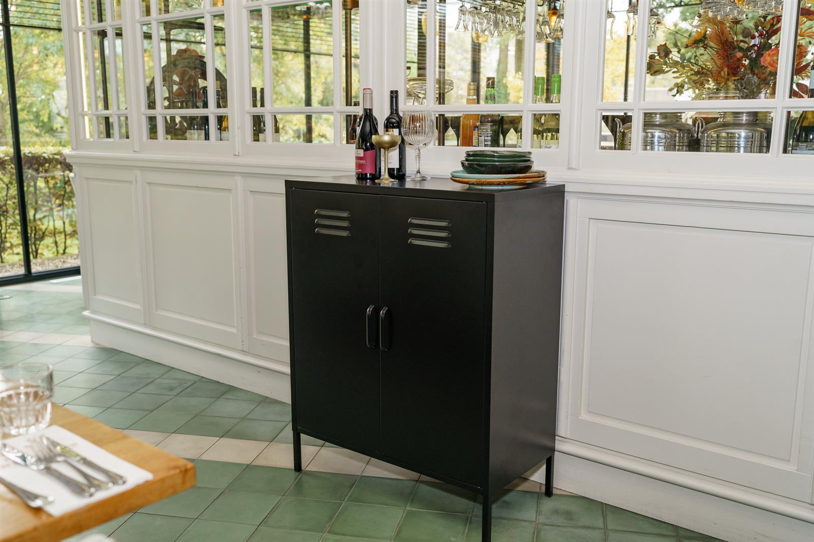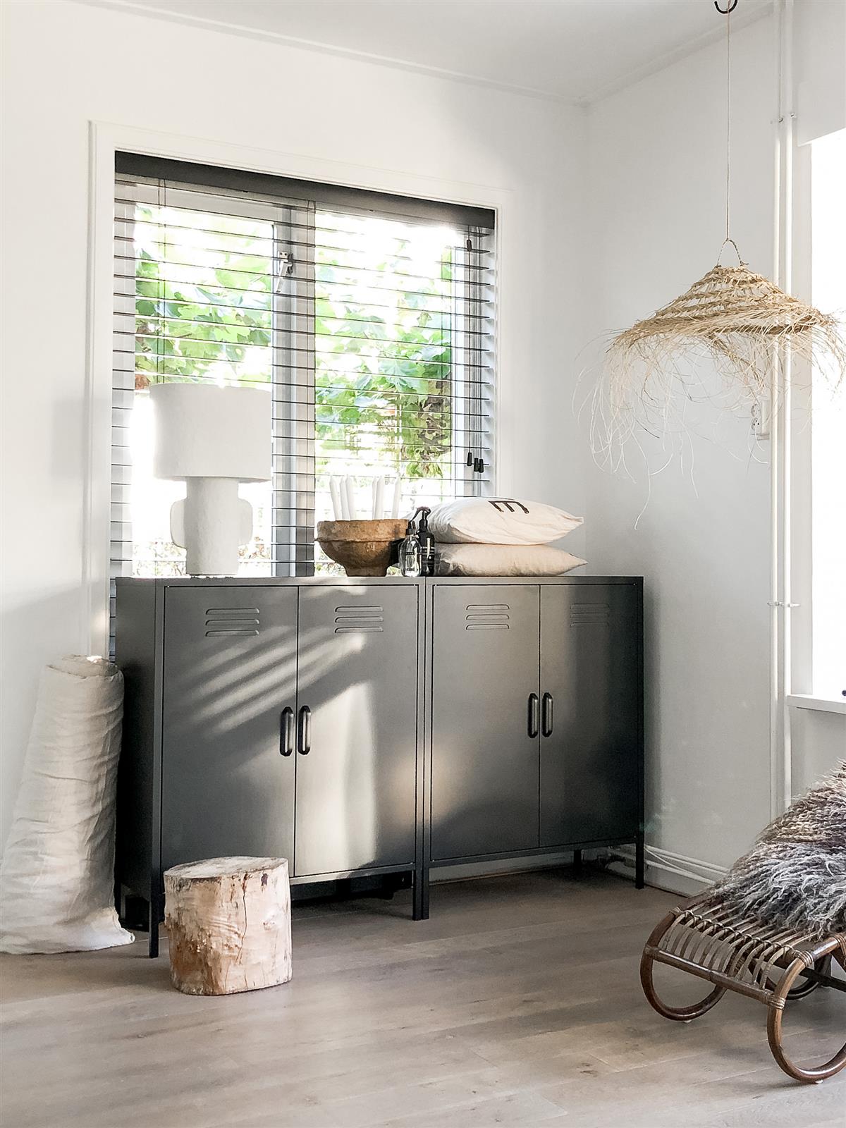 De lockerkast is enorm praktisch omdat je er veel spullen in kwijt kan en door zijn mooie kleur vrolijkt hij elk interieur op. De brede platte bovenkant van de kast biedt perfect de ruimte om je favoriete decoraties of planten neer te zetten. Nog een mooi vloerkleed eronder en het plaatje is compleet.
