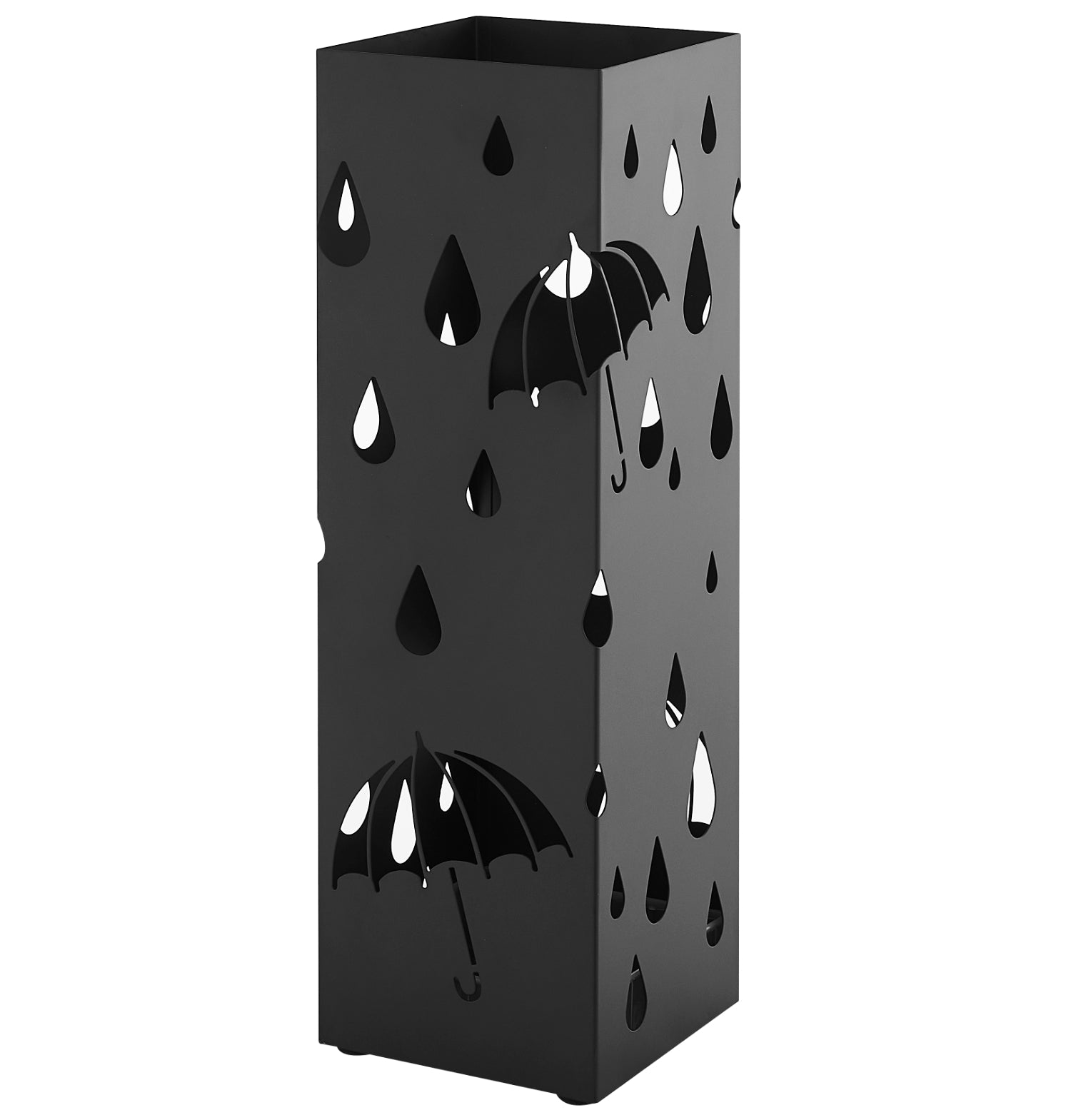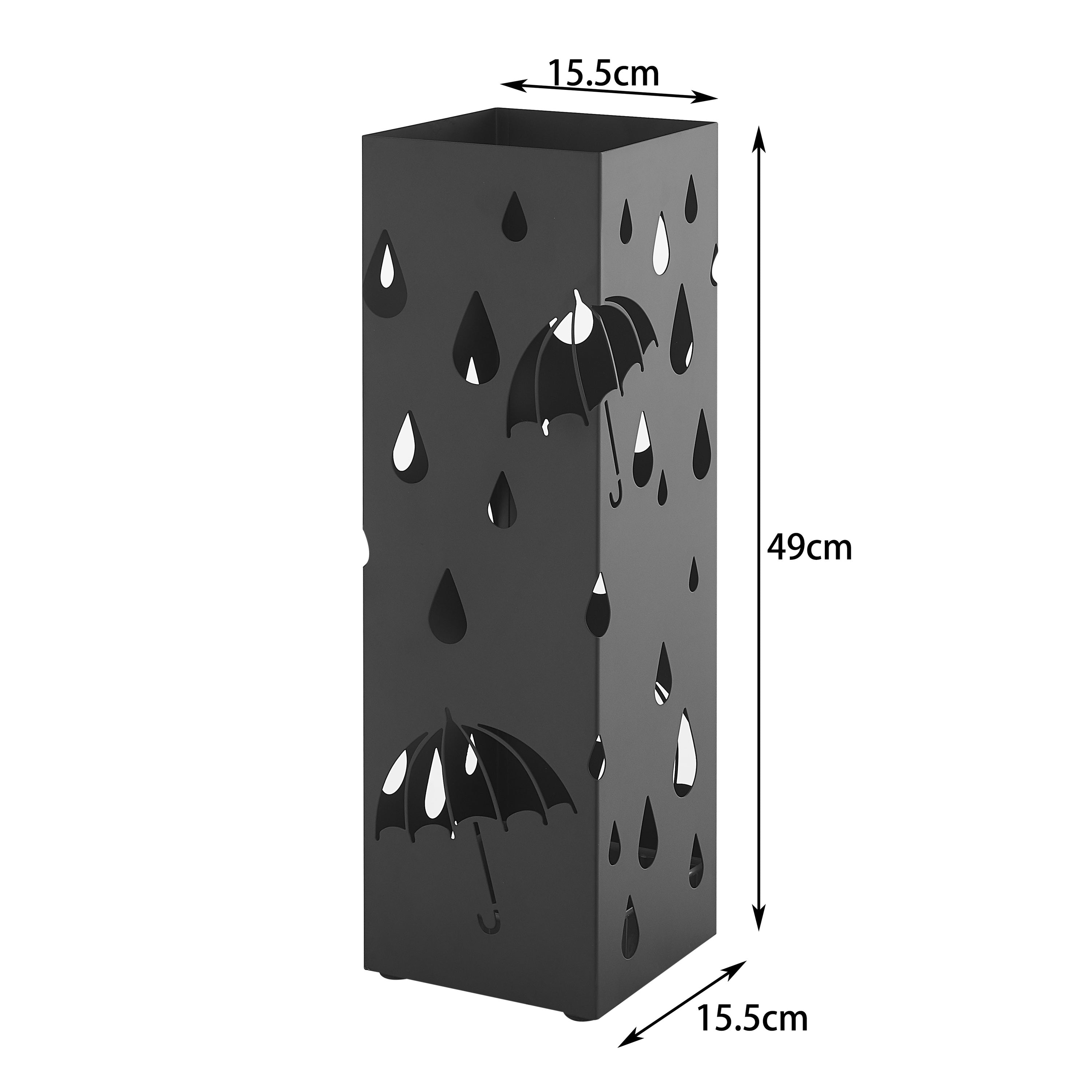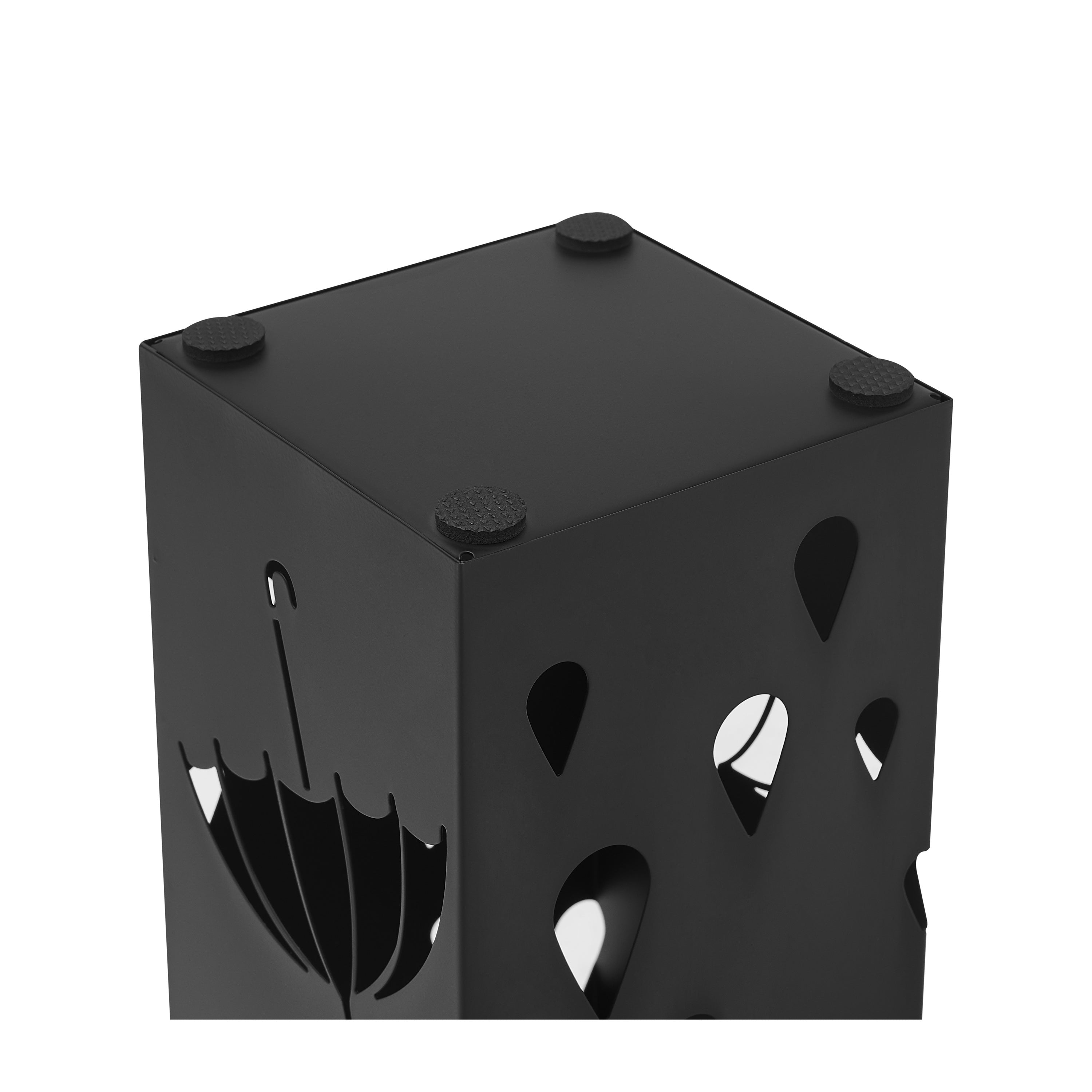 Deze rechthoekige, zwarte paraplubak combineert gebruiksgemak met een tof design. Door gebruik te maken van een plastic opvangbakje onderaan de paraplubak zal je vloer netjes blijven. Om krassen op de vloer tegen te gaan, werden eveneens 4 beschermingspads onderaan de parapluhouder voorzien. Specificaties: - Materiaal: Metaal - Afmetingen: 15.5 x 49 cm (diameter x hoogte) - Gewicht: 1.8 kg - Kleur: zwartLevering: - 1 x paraplubak