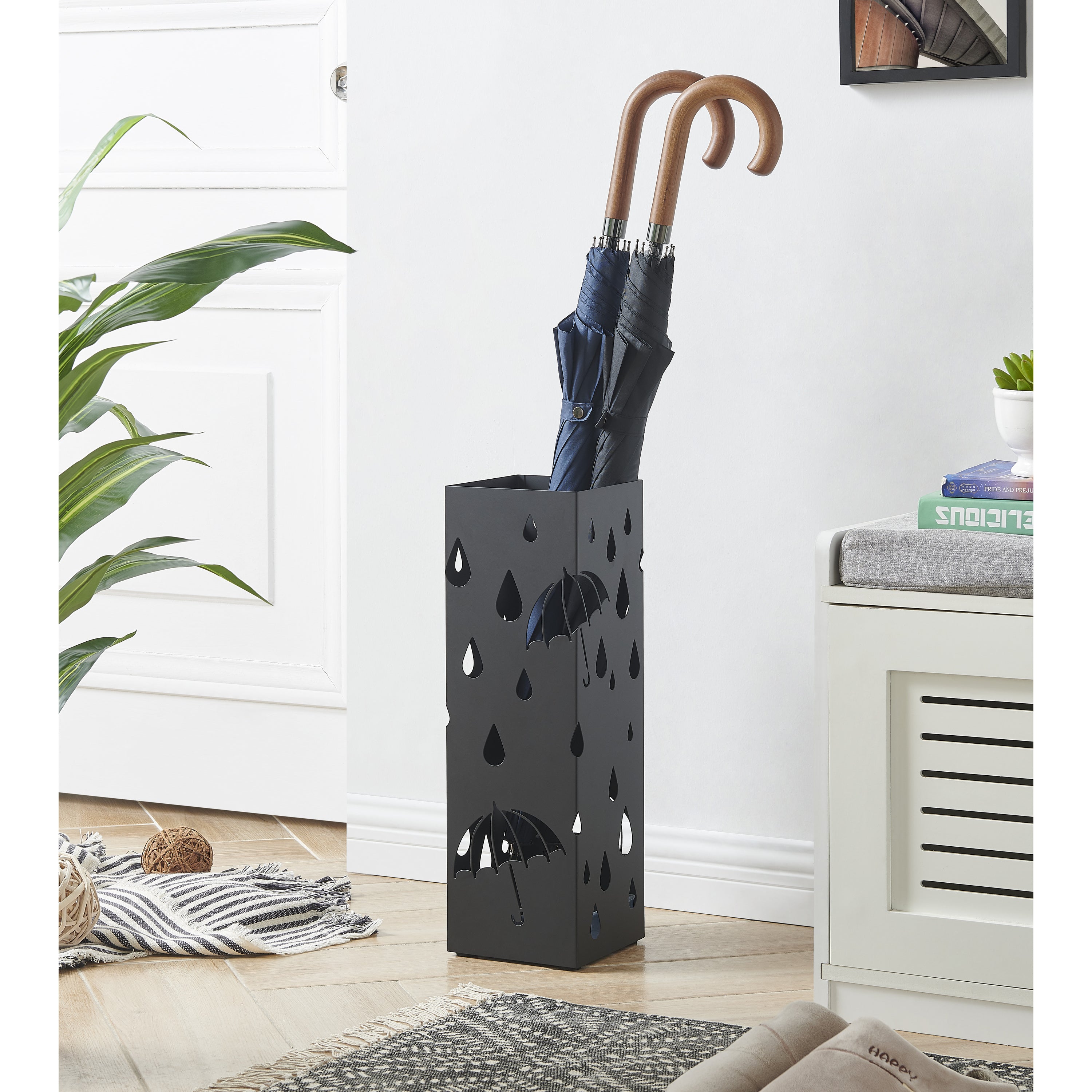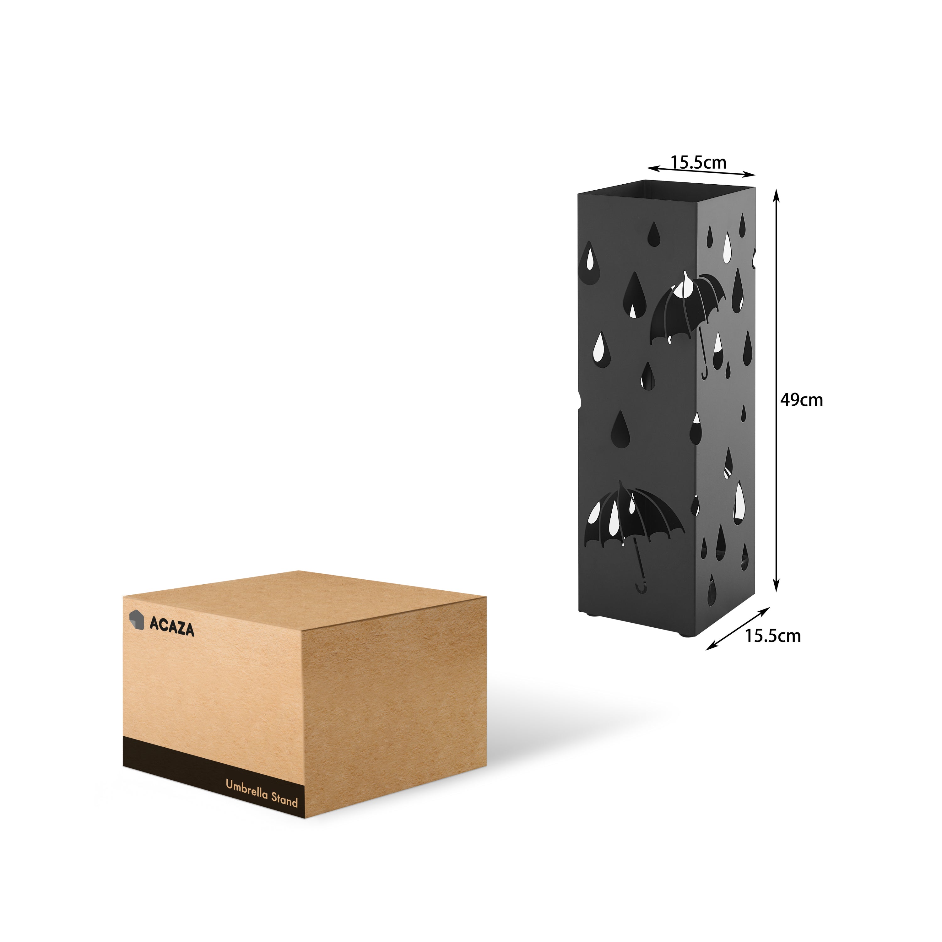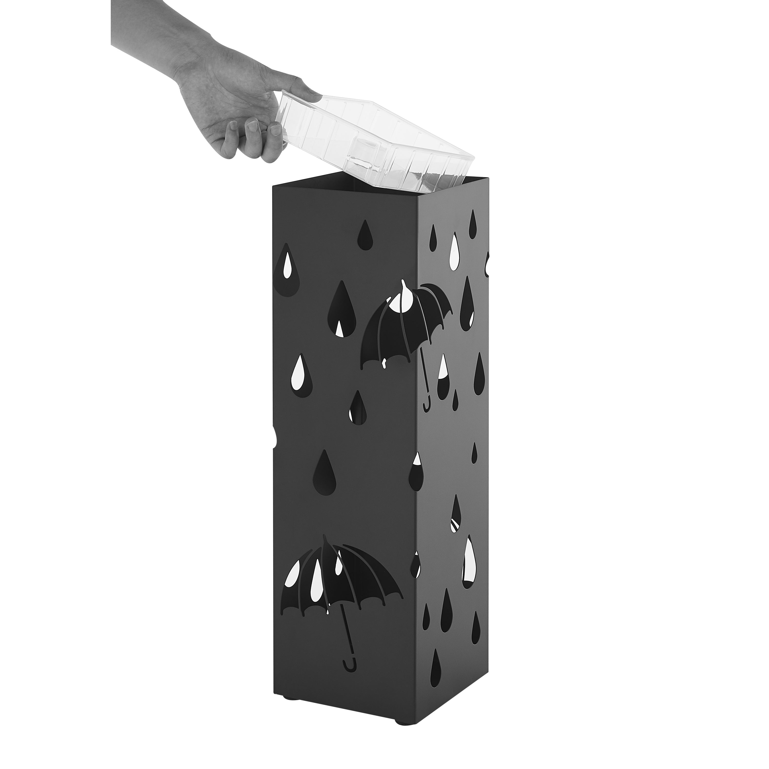 Deze rechthoekige, zwarte paraplubak combineert gebruiksgemak met een tof design. Door gebruik te maken van een plastic opvangbakje onderaan de paraplubak zal je vloer netjes blijven. Om krassen op de vloer tegen te gaan, werden eveneens 4 beschermingspads onderaan de parapluhouder voorzien. Specificaties: - Materiaal: Metaal - Afmetingen: 15.5 x 49 cm (diameter x hoogte) - Gewicht: 1.8 kg - Kleur: zwartLevering: - 1 x paraplubak