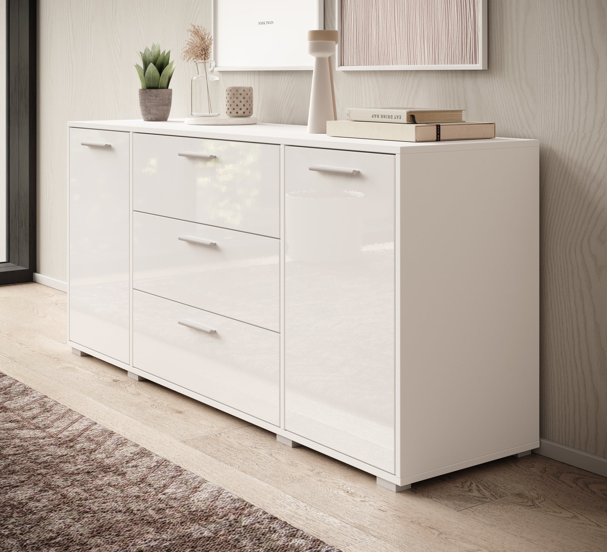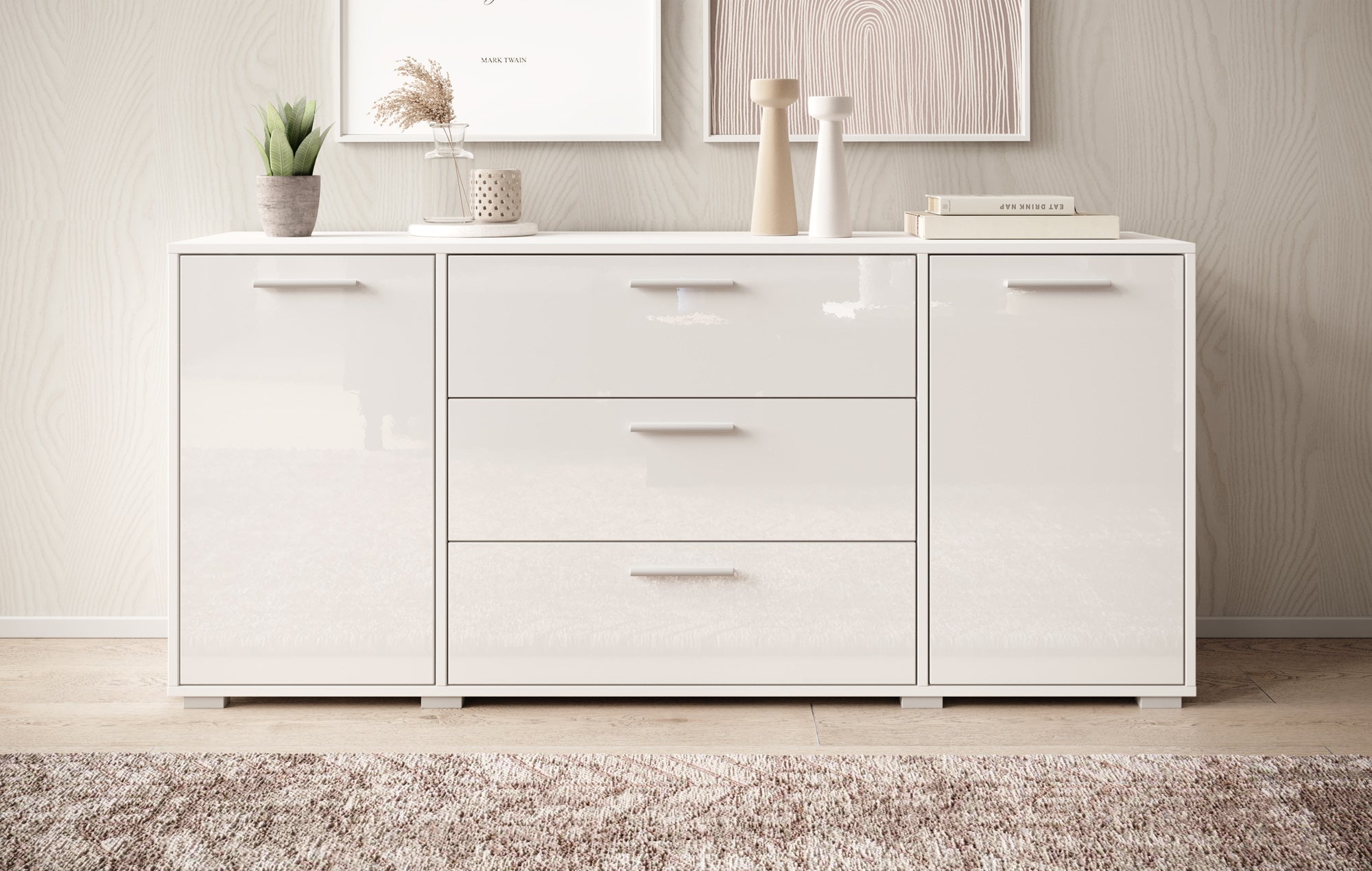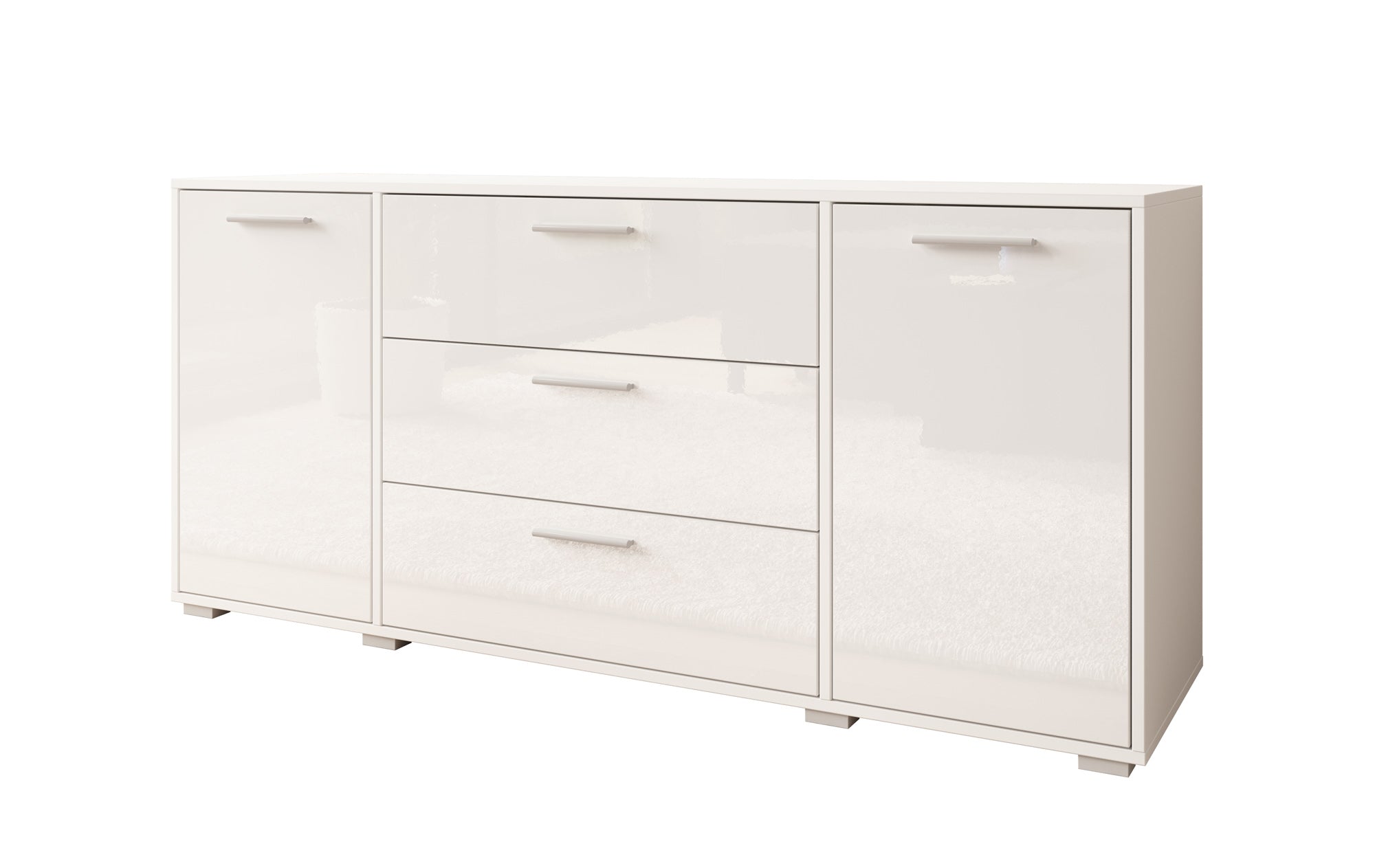 - Deuren en lades met zilverkleurige handgrepen