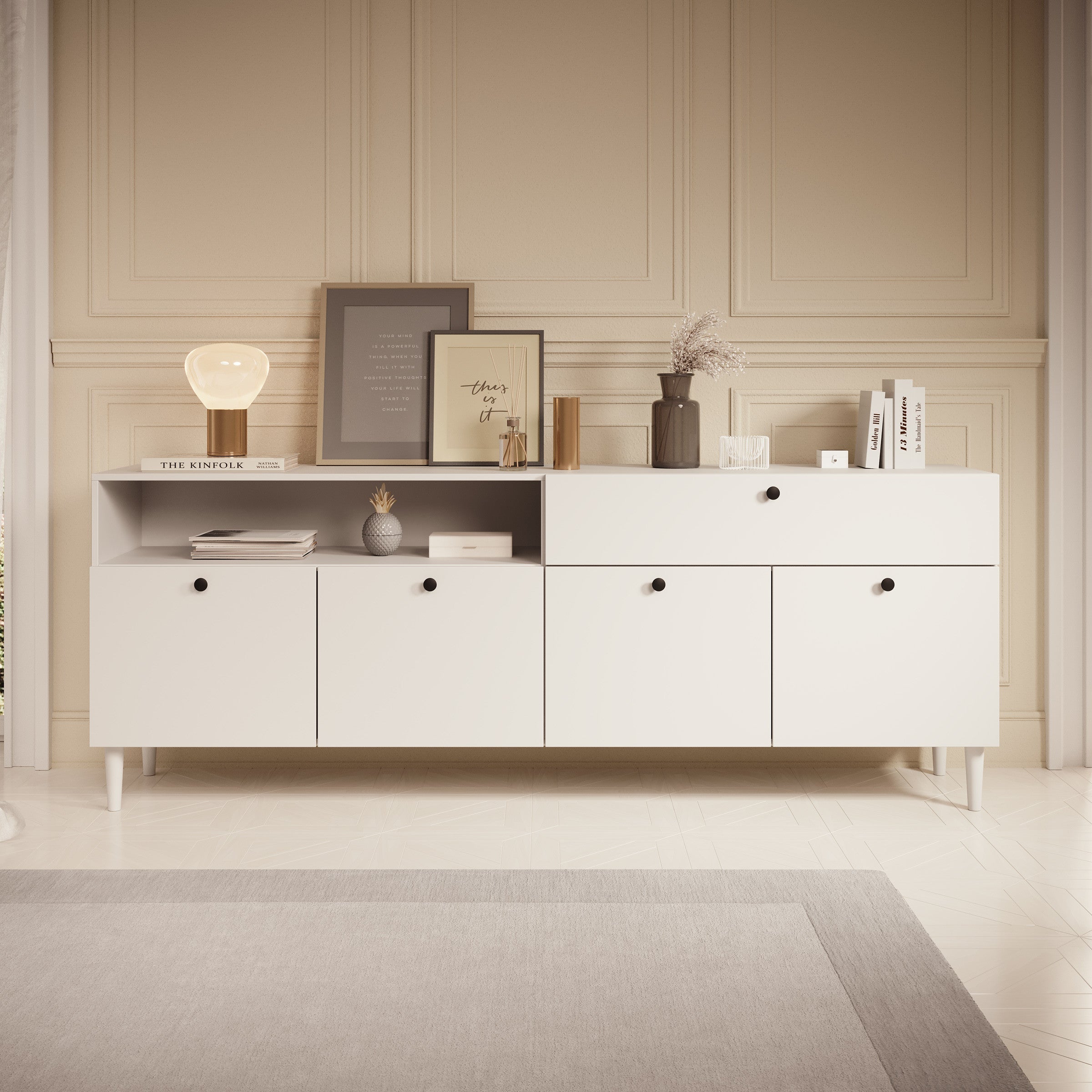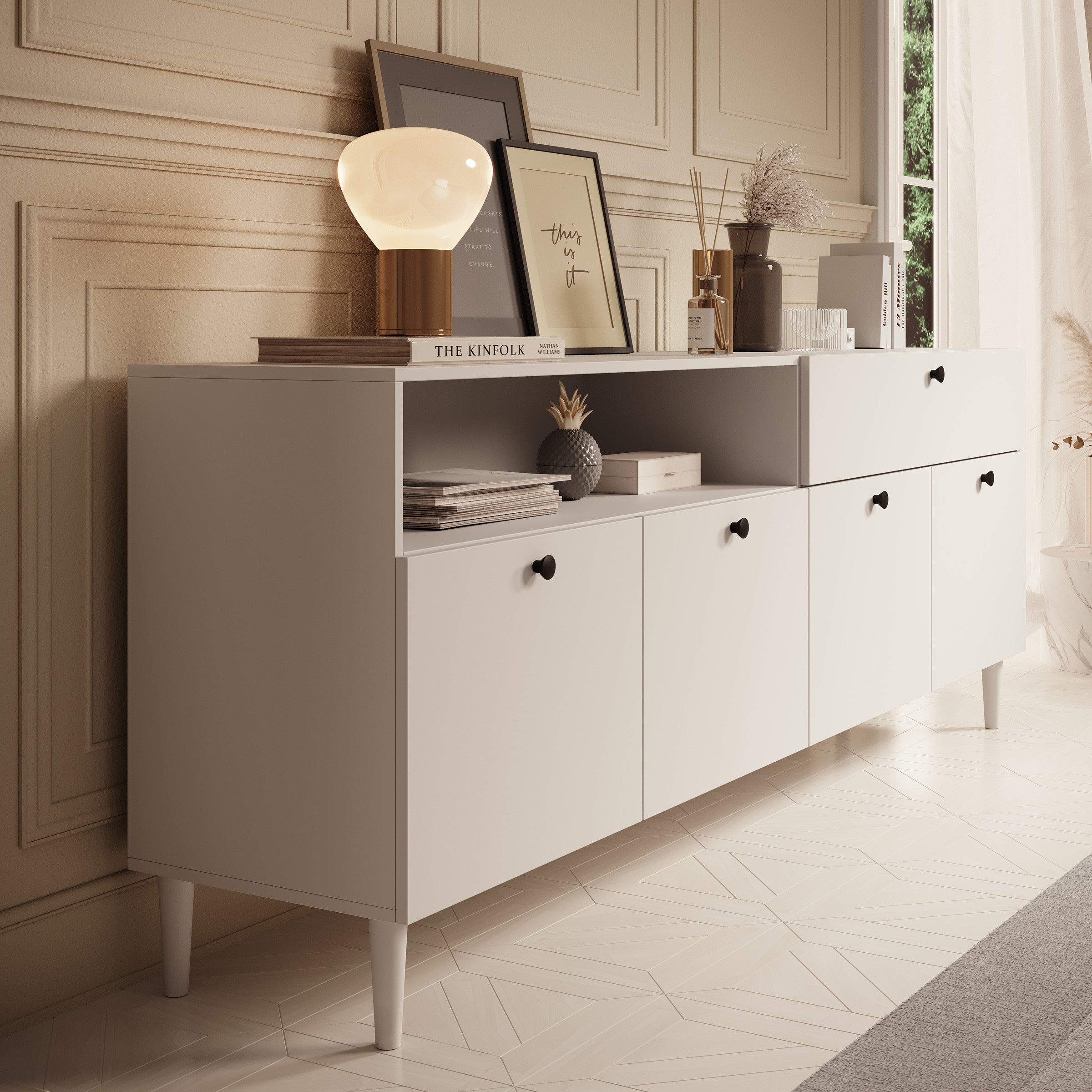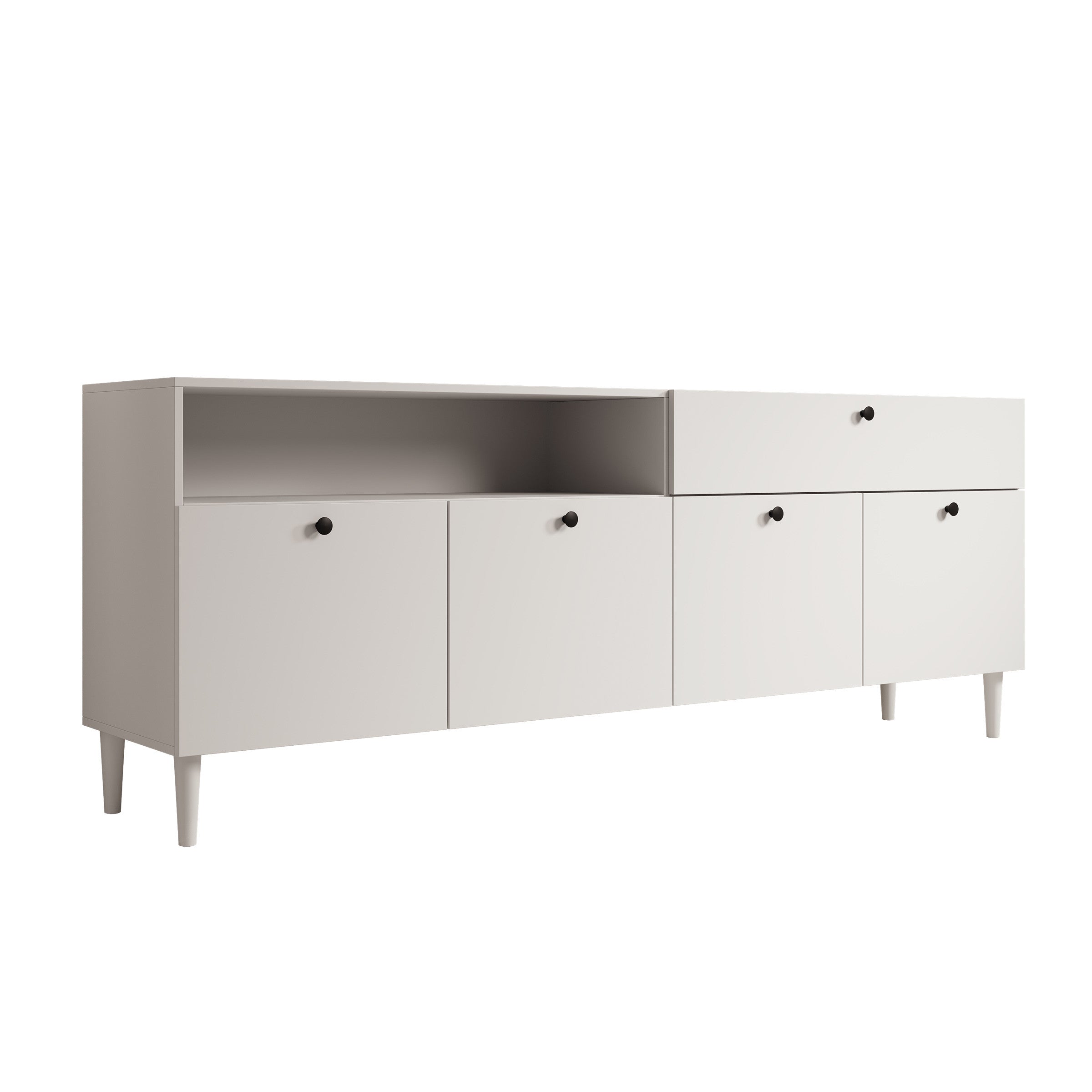 - Deuren en lade met zwarte knoppen