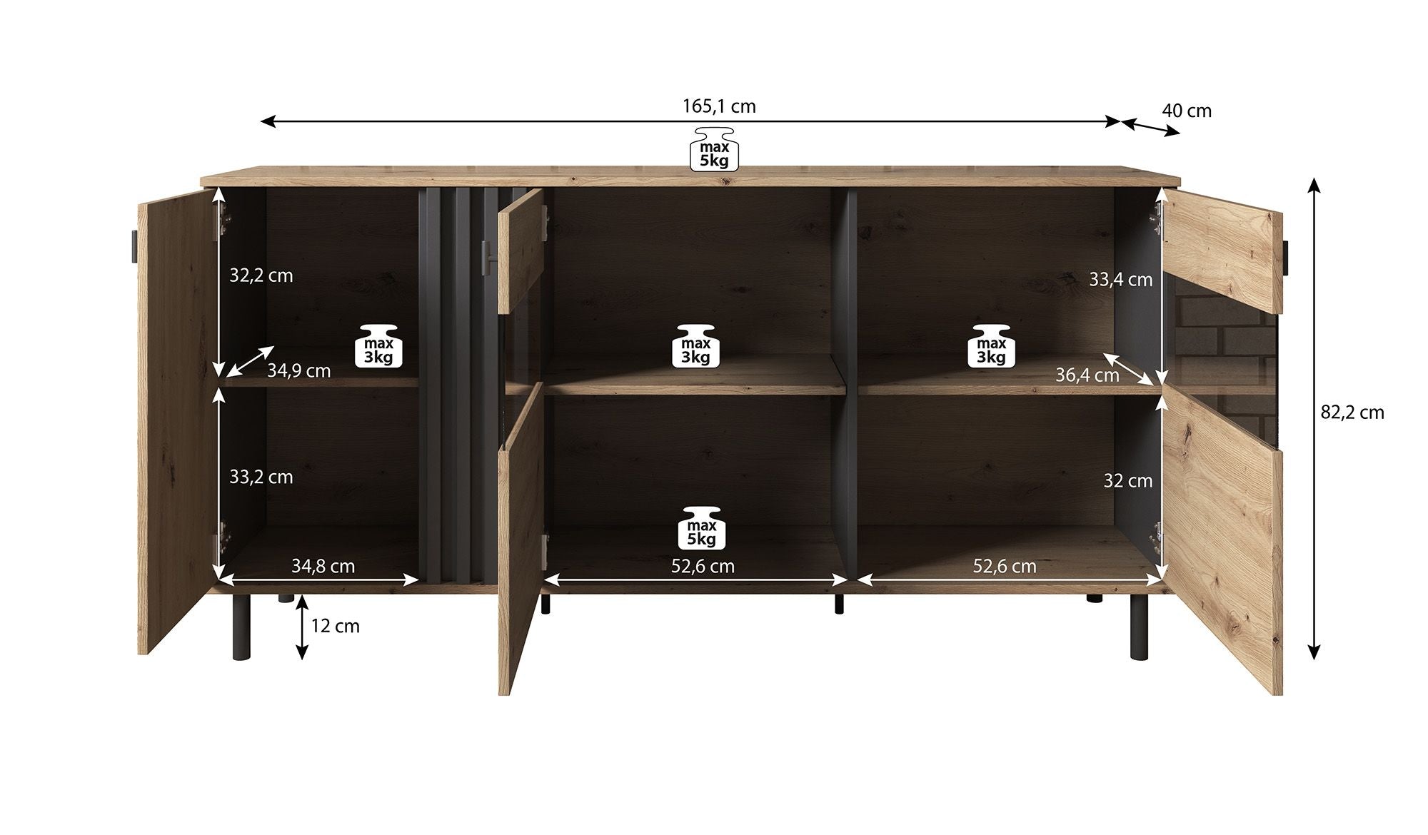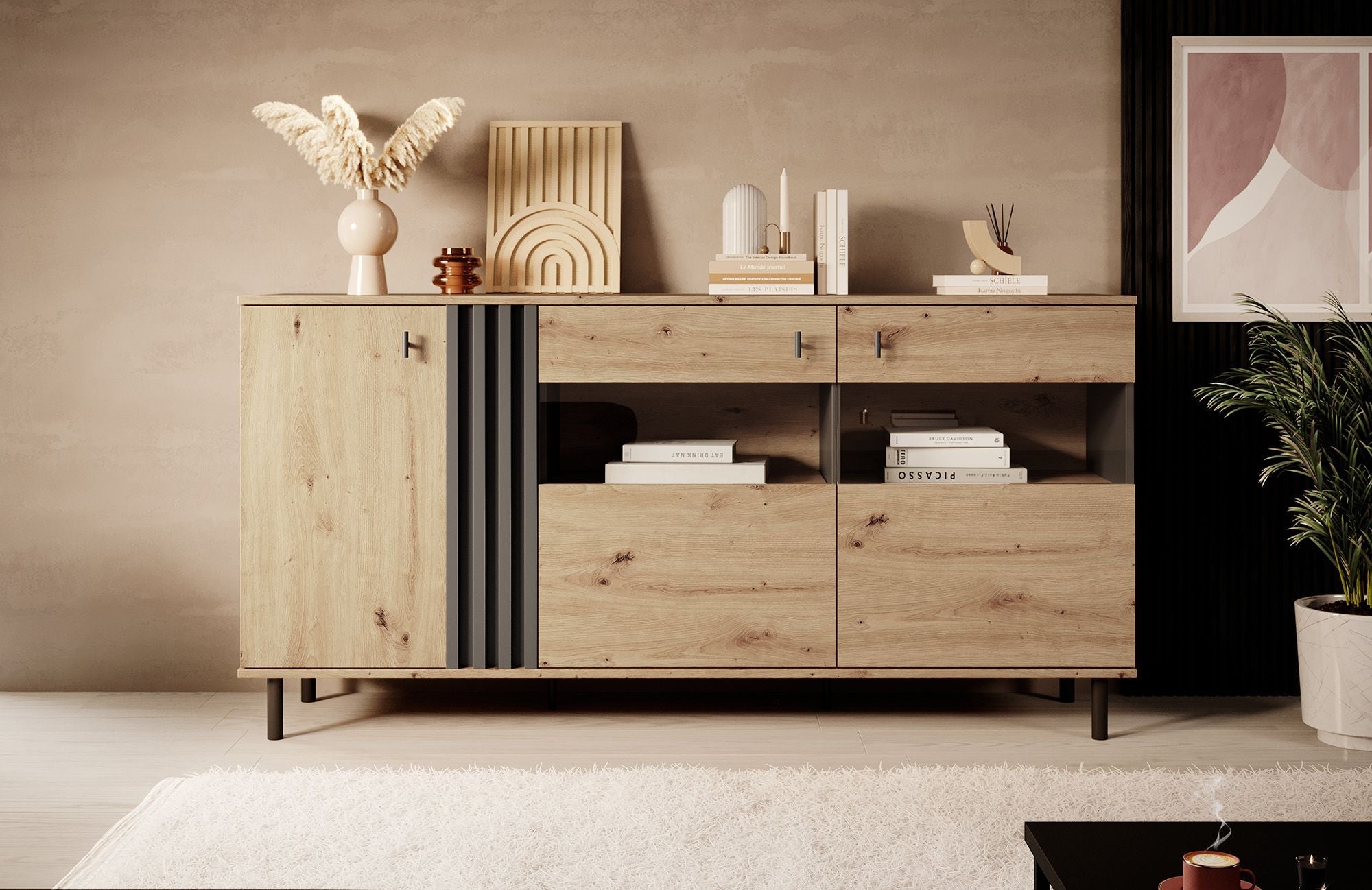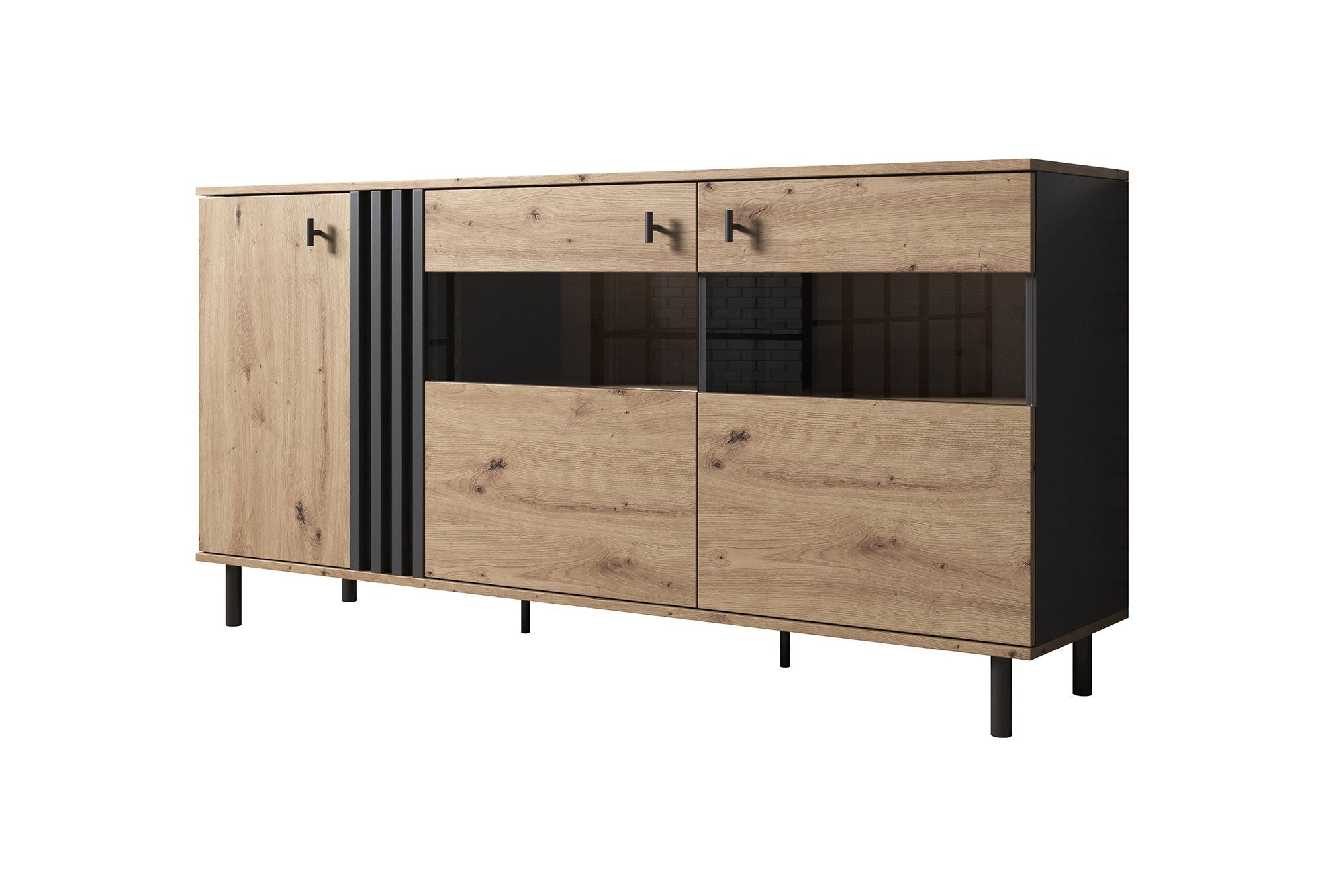 Meubella - Dressoir Marcos - Eiken - Antraciet - 165 cm - met glas