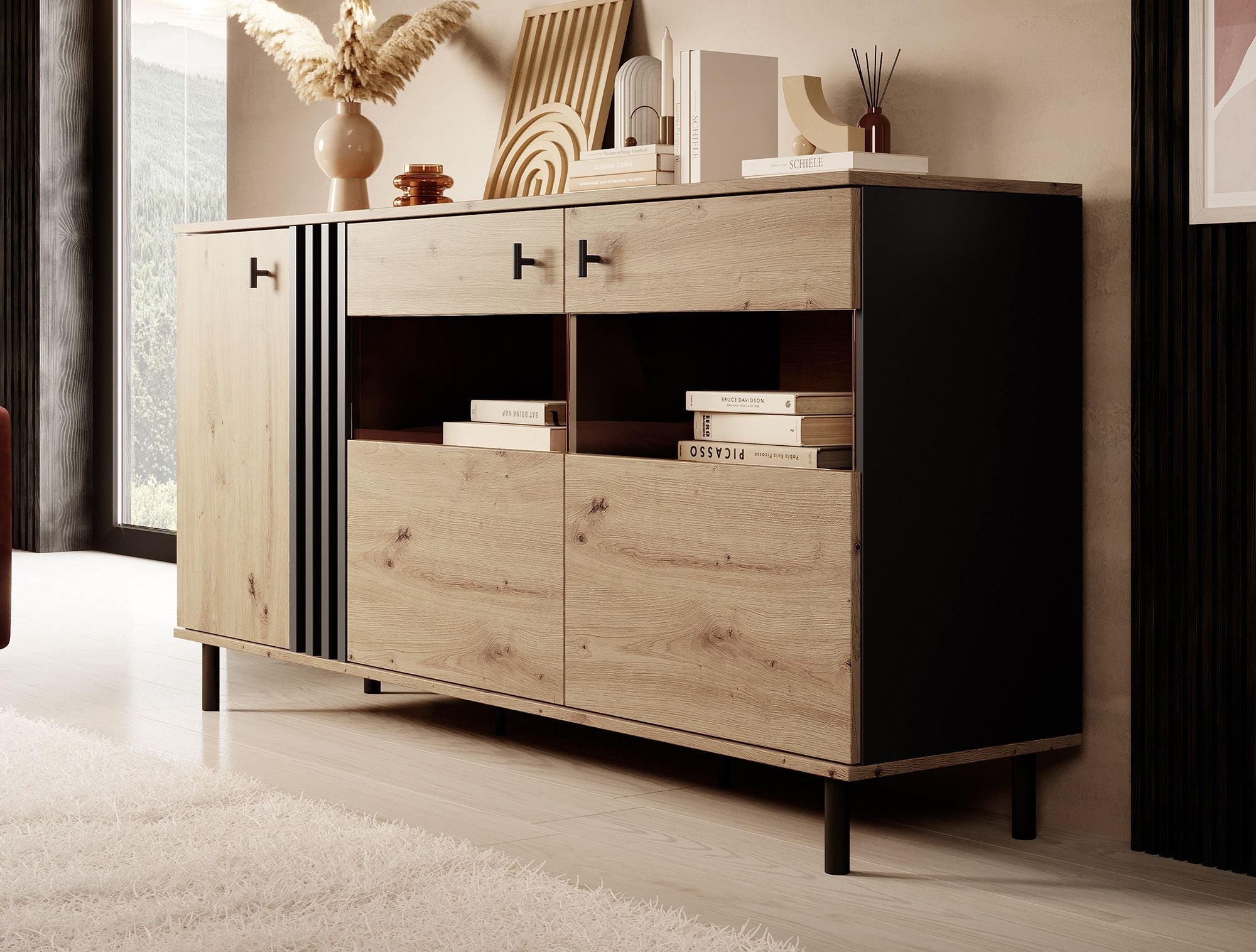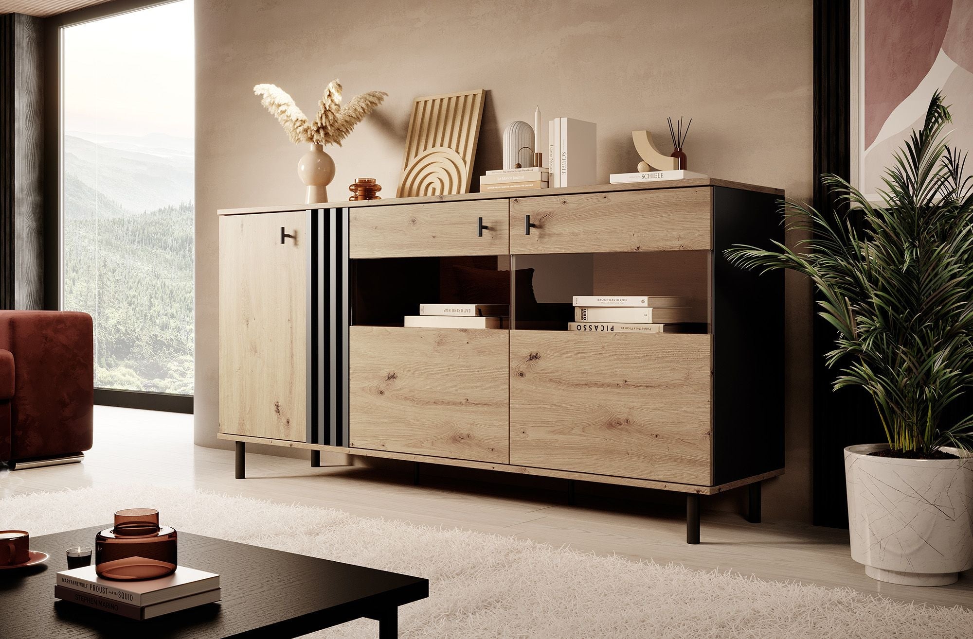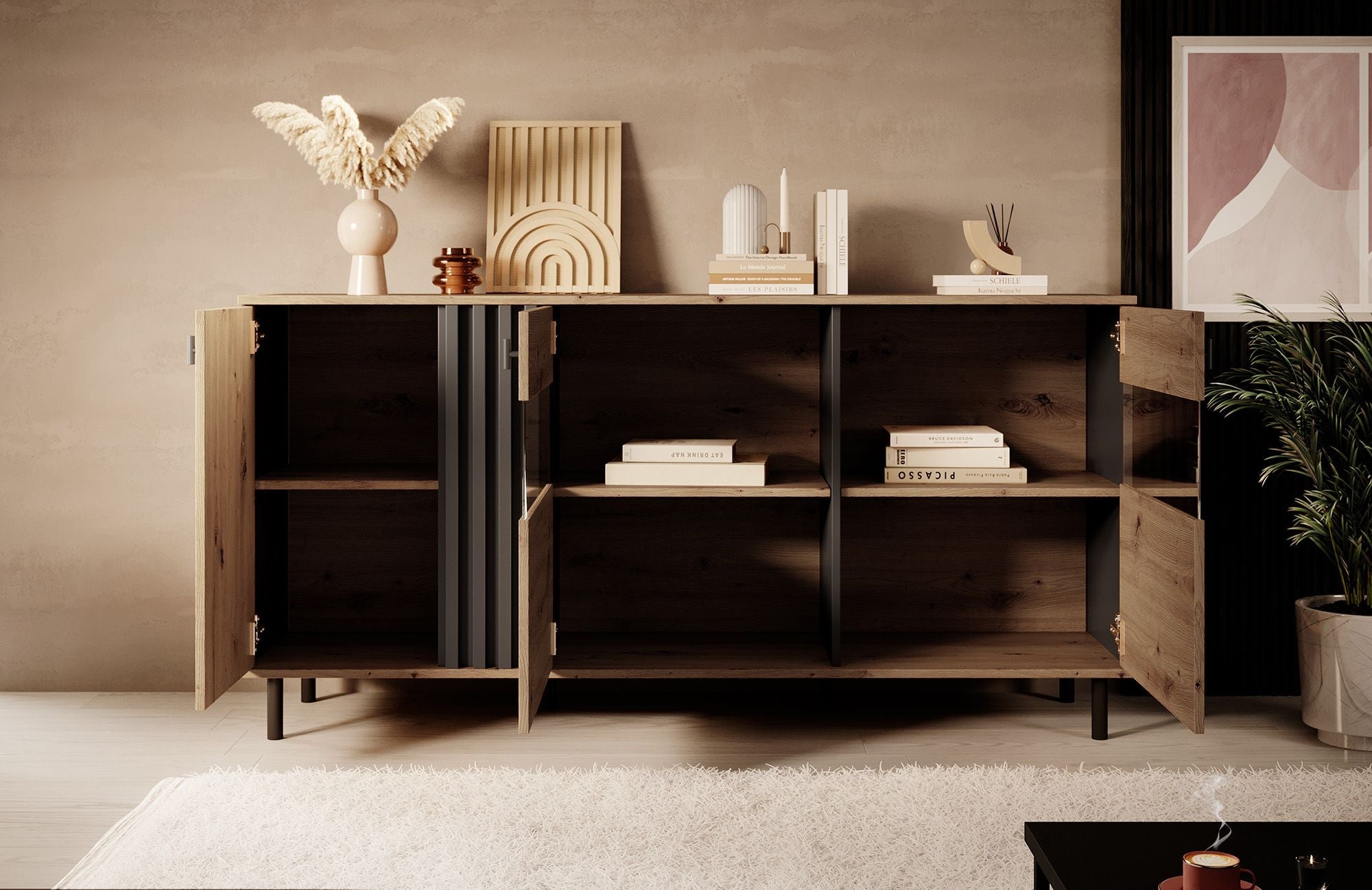 Meubella - Dressoir Marcos - Eiken - Antraciet - 165 cm - met glas