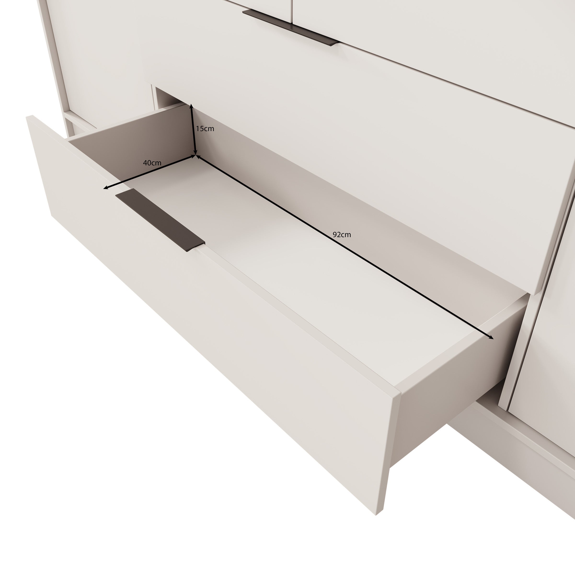 - Deuren en lades met zilverkleurige handgrepen