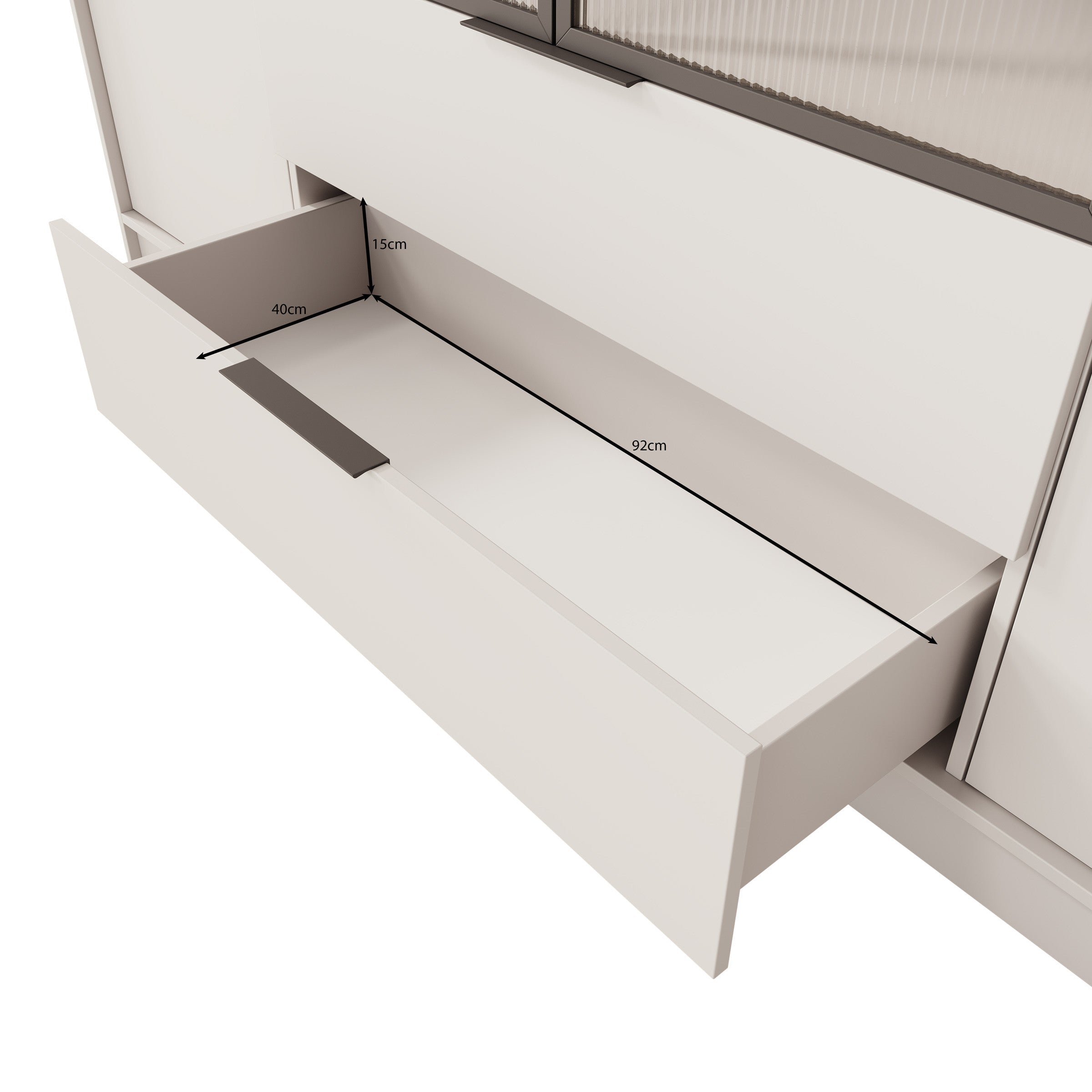 - Deuren en lades met zilverkleurige handgrepen