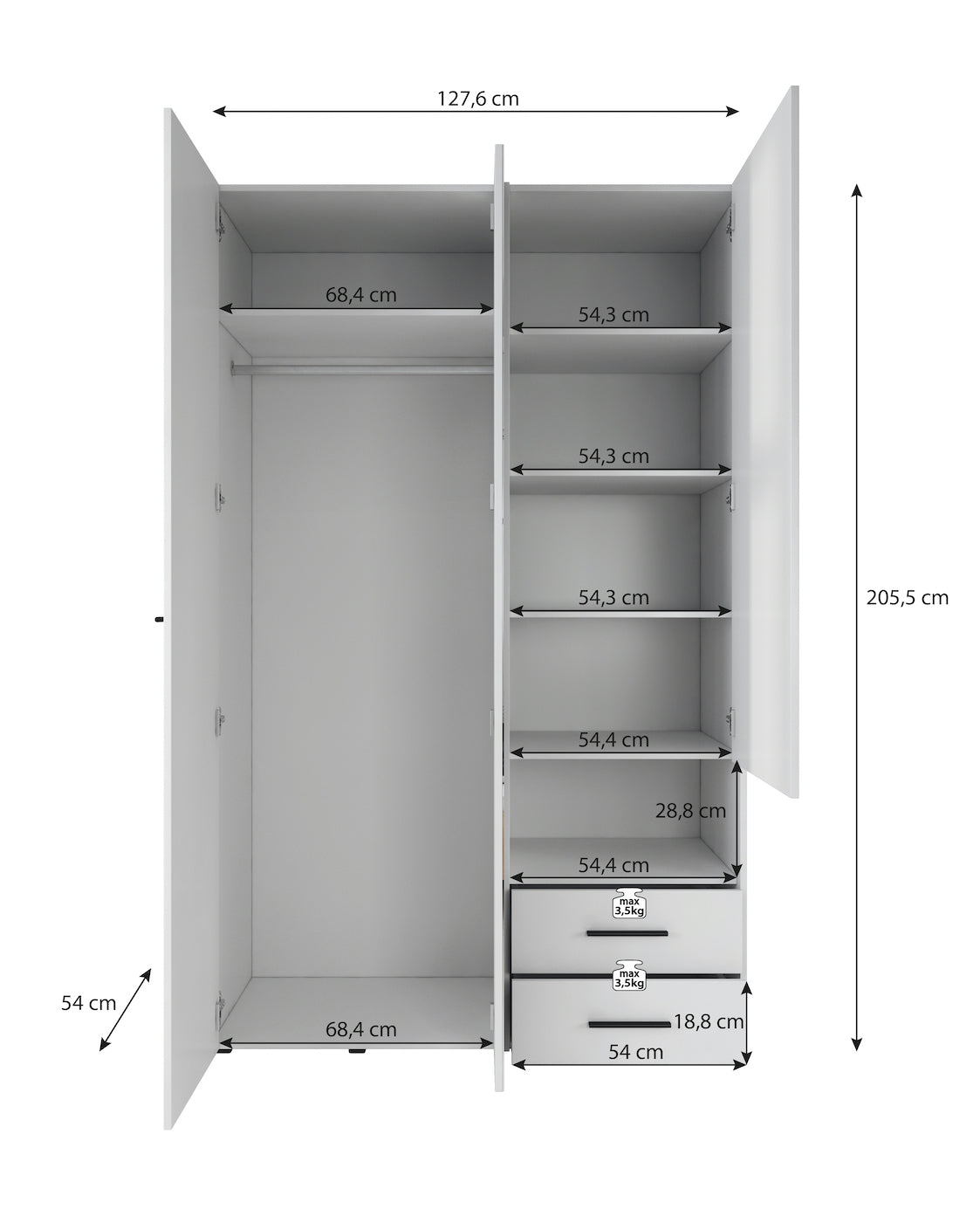 Meubella - Kledingkast Laura - Wit - 128 cm - Met spiegel