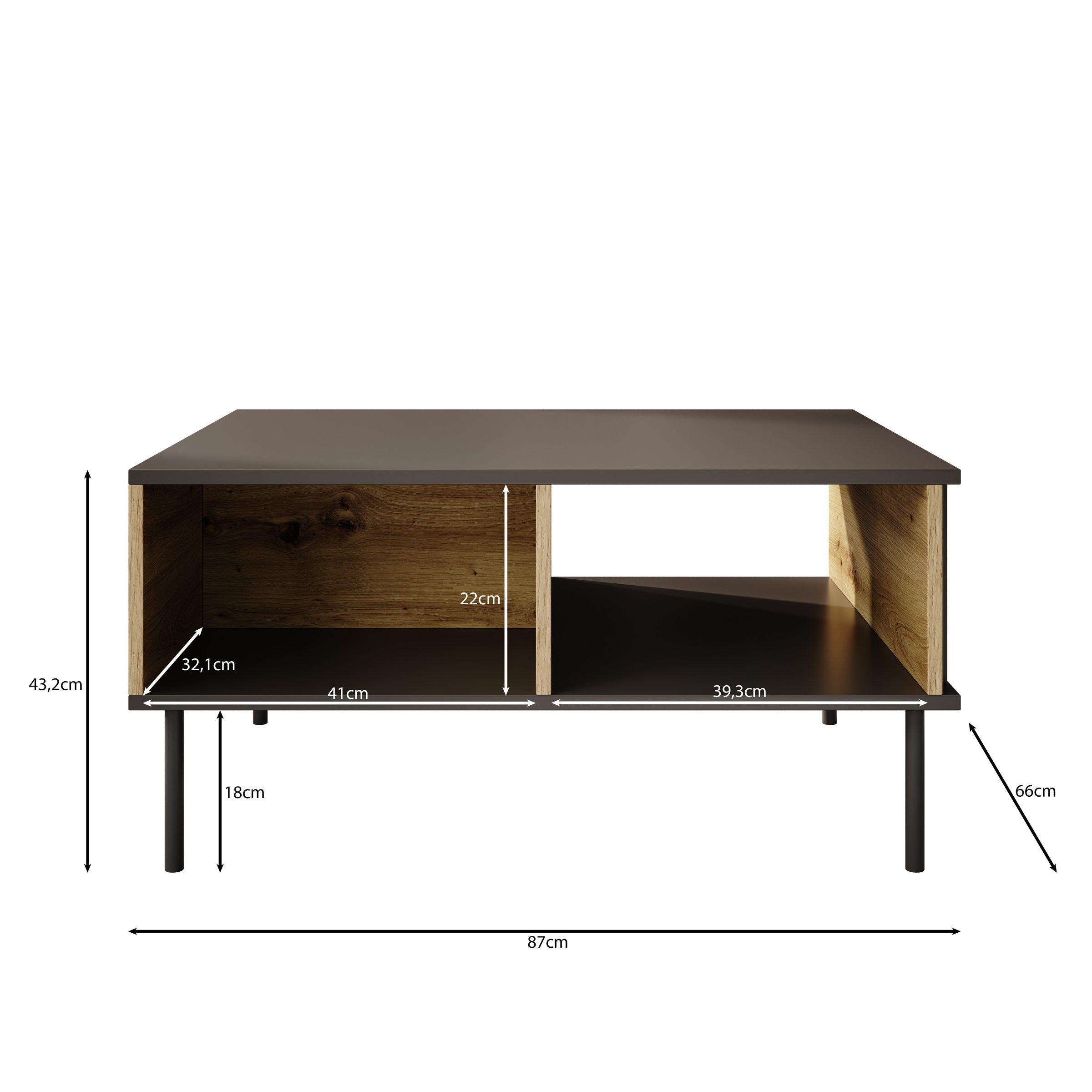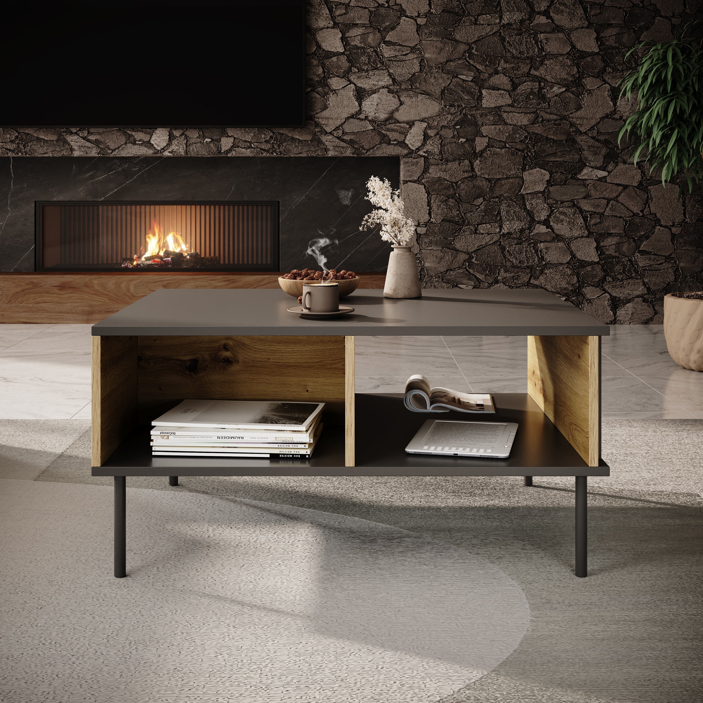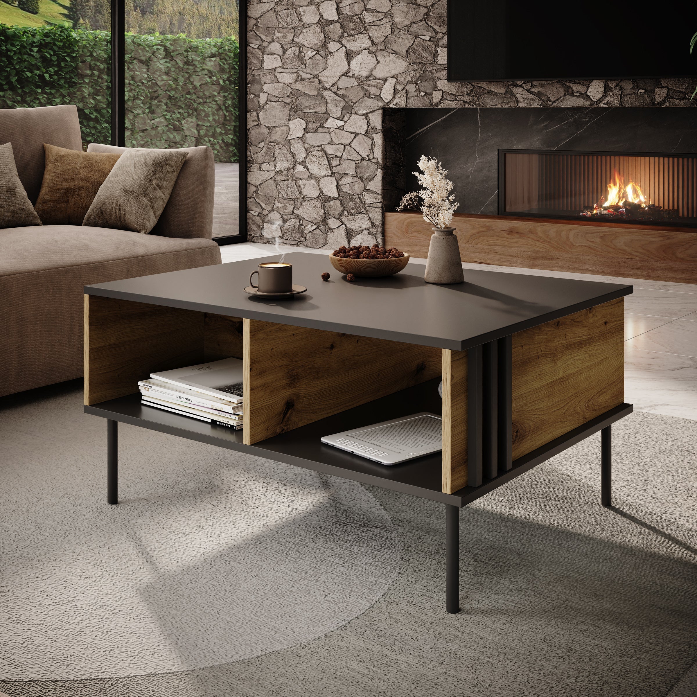 Salontafel Rogan is een rechthoekige tafel uitgevoerd met een moderne, industriële uitstraling. Onder het tafelblad zitten in totaal 3 opbergvakken. De tafel is uitgevoerd in de kleur eiken met zwart en staat op metalen poten.