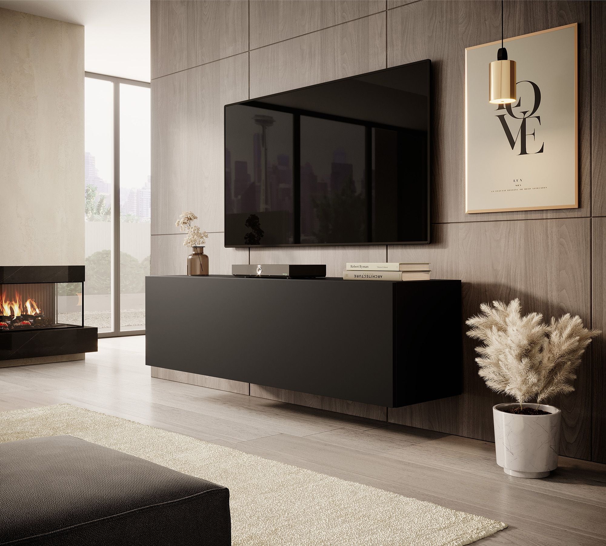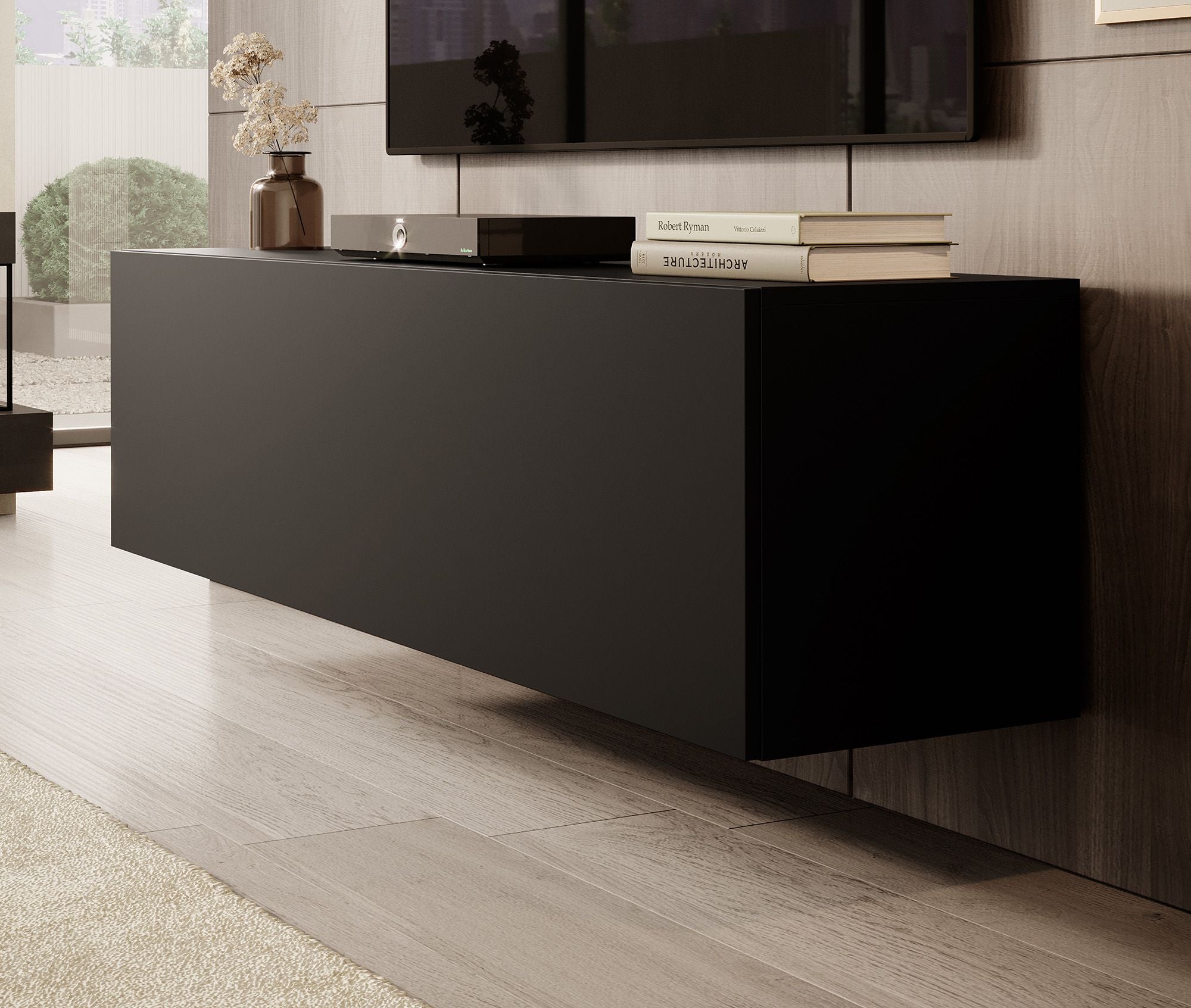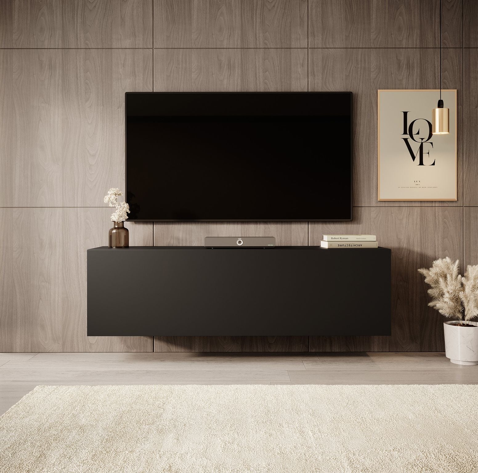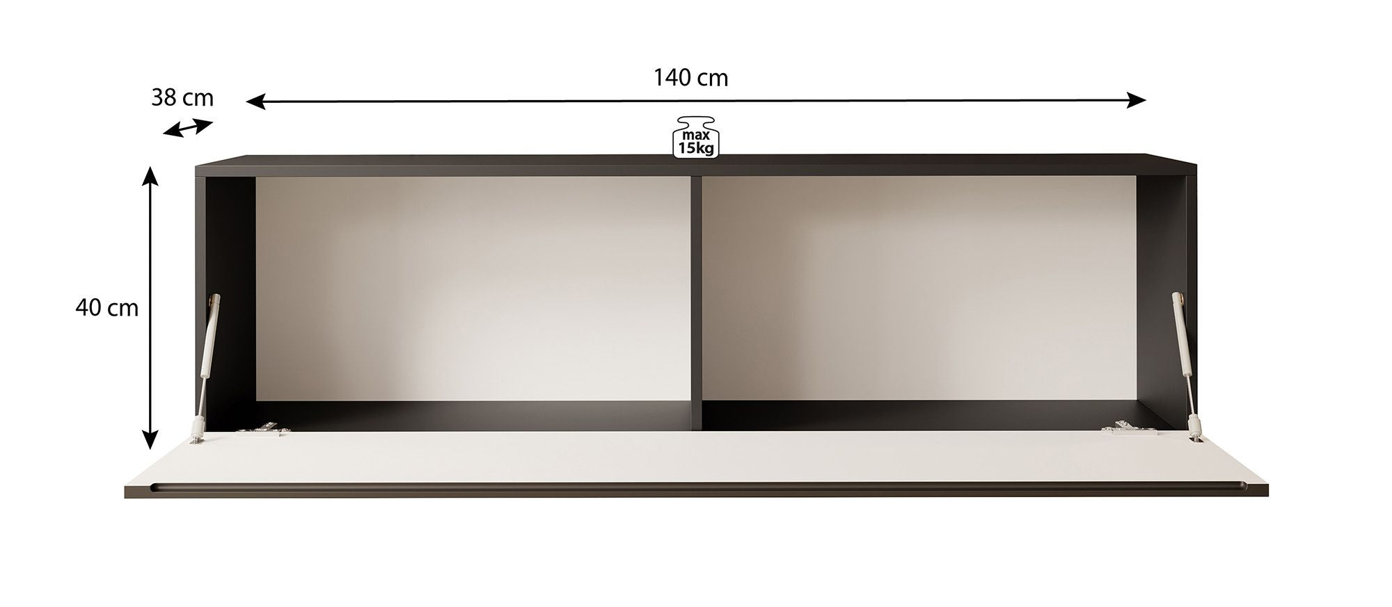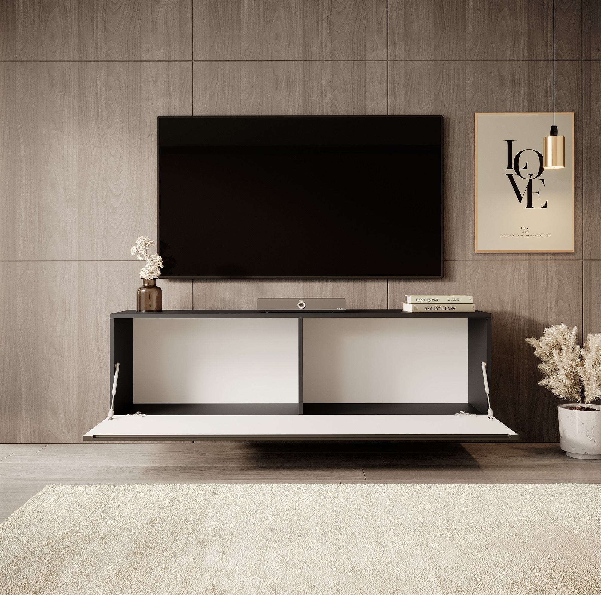 TV-Meubel Venica is gemaakt van een stevige spaanplaat constructie. Het tv-meubel beschikt over een greeploze klep die met een push-to-open systeem opent. In de binnenkant vind je 2 opbergvakken.