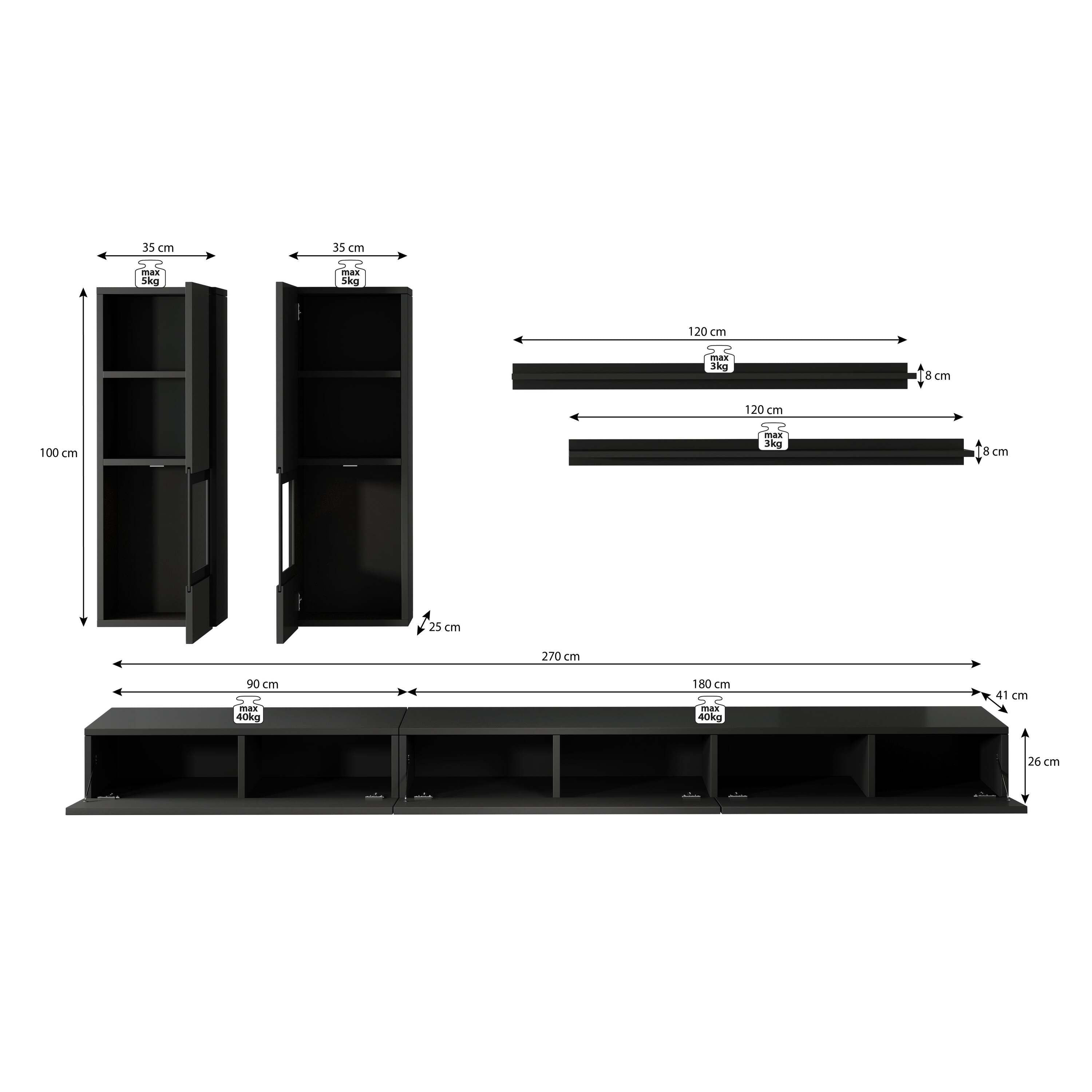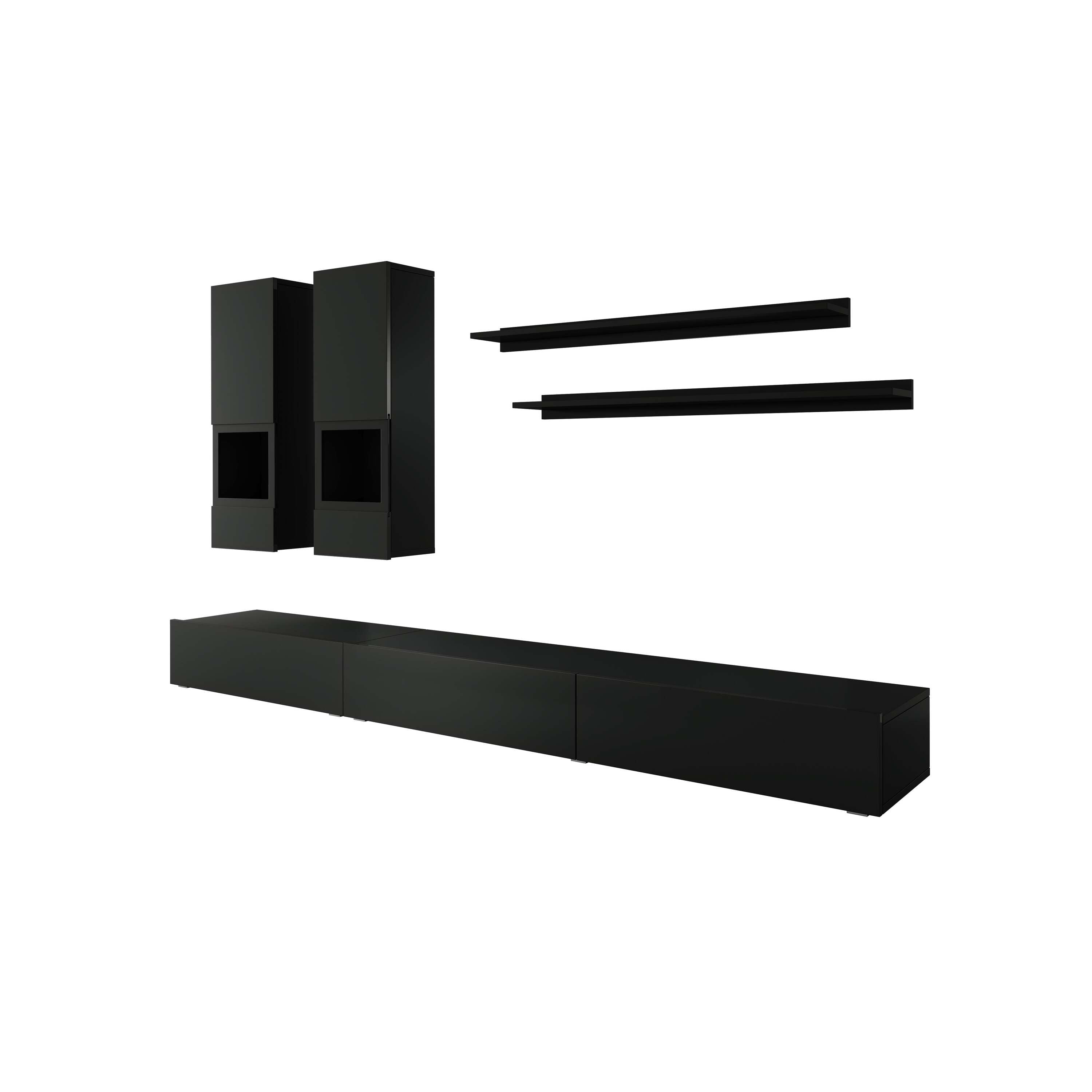 Wandmeubel Antrix bestaat uit een tv-meubel, 2 hangende wandkasten en 2 bijpassende wandplanken. Het tvmeubel staat op lage pootjes en heeft 3 greeploze kleppen. Het wandmeubel beschikt over 14 opbergvakken.