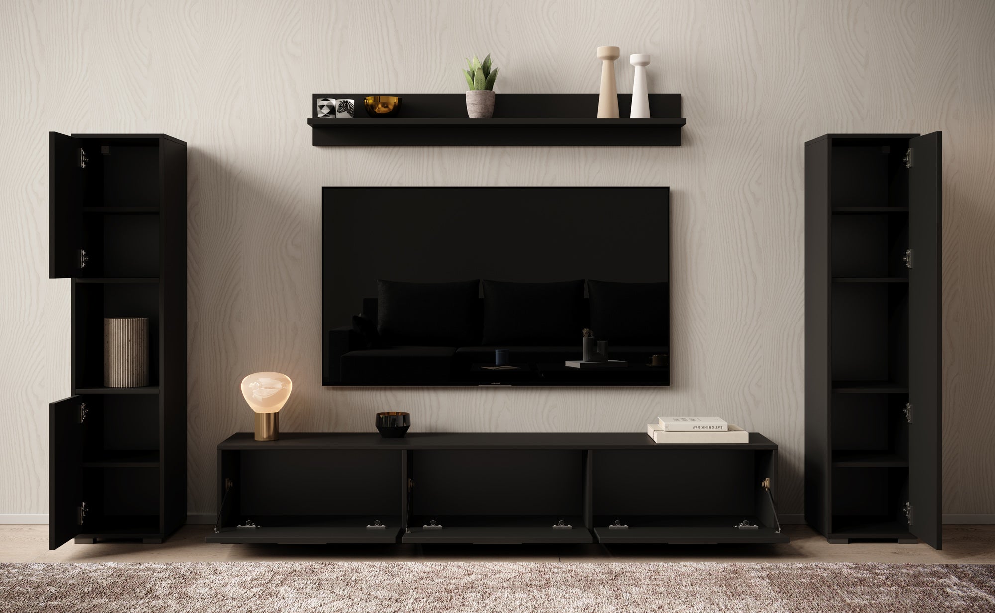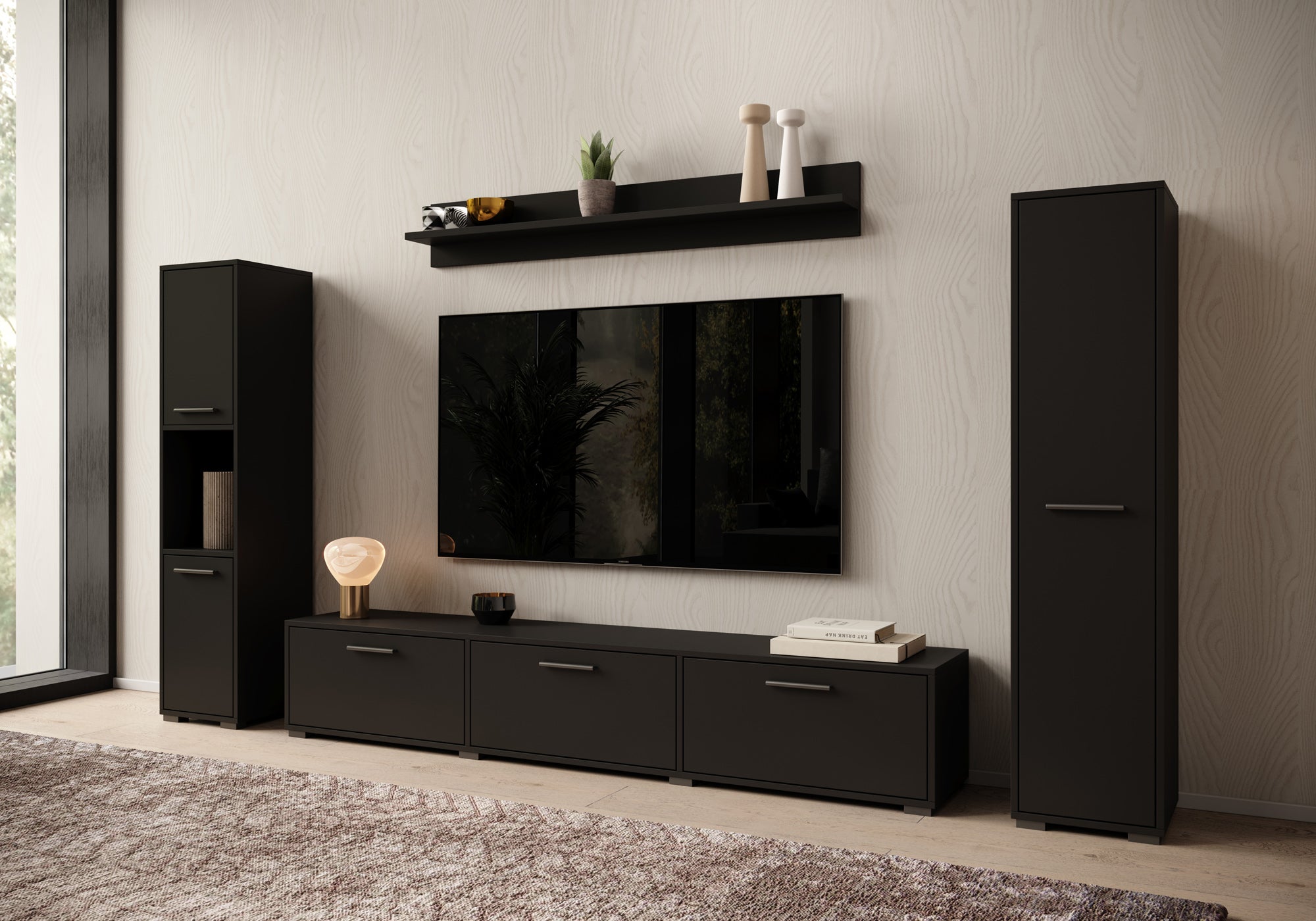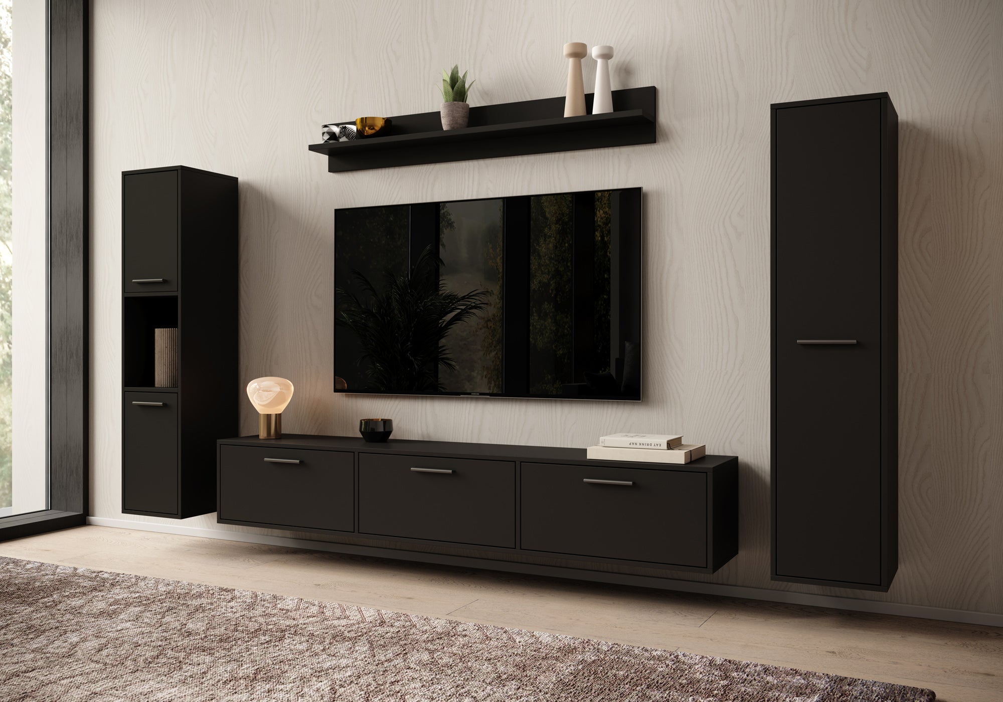 Wandmeubel Betty bestaat uit een tv-meubel, 2 opbergkasten en bijpassende wandplank. Dit model is zowel staand als hangend te monteren. De kast is uitgevoerd in de kleur zwart.