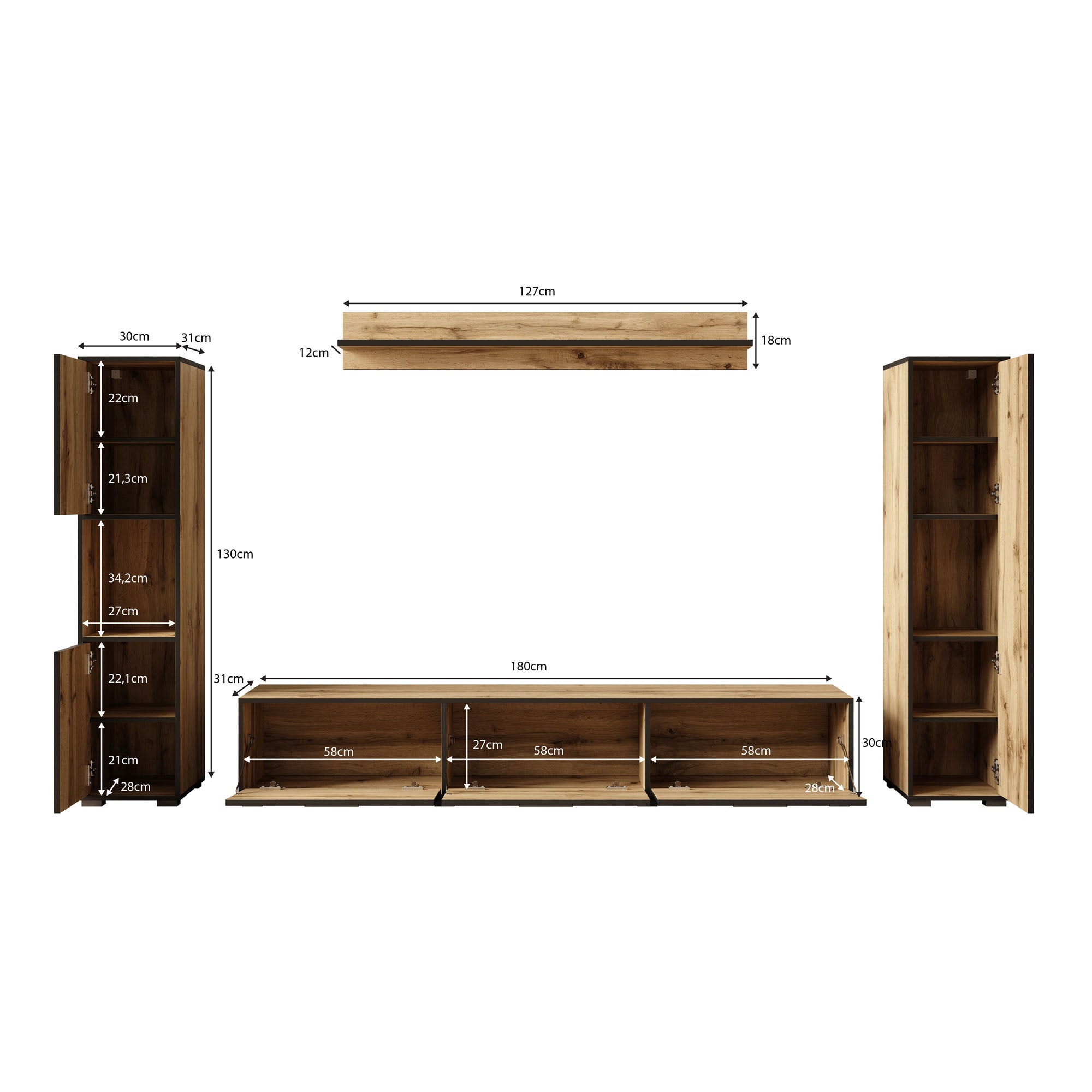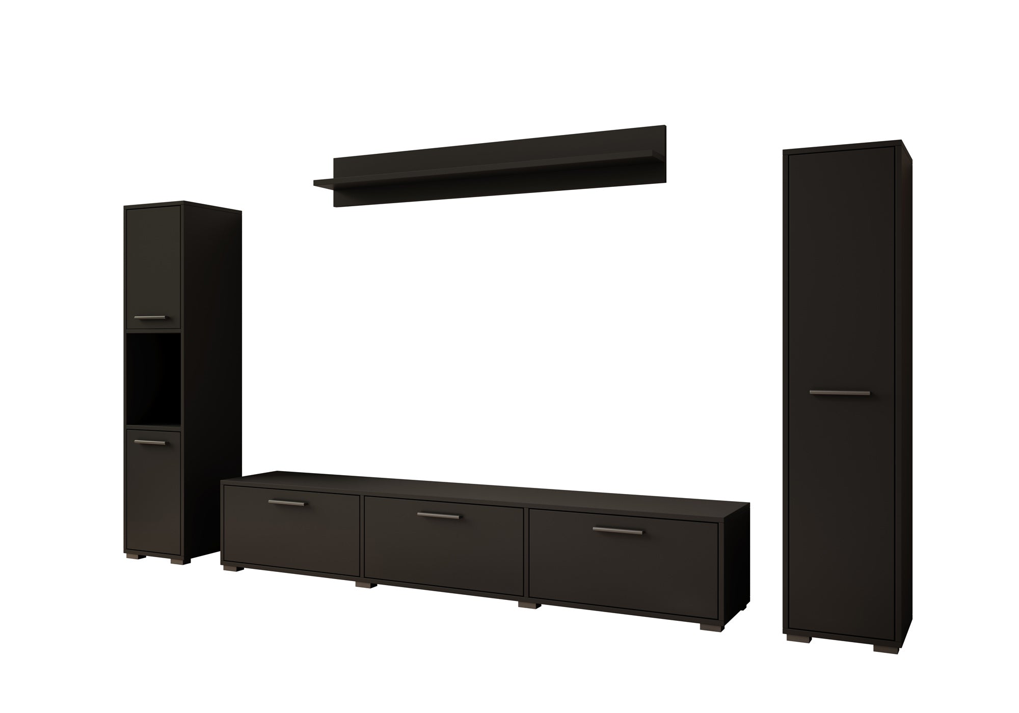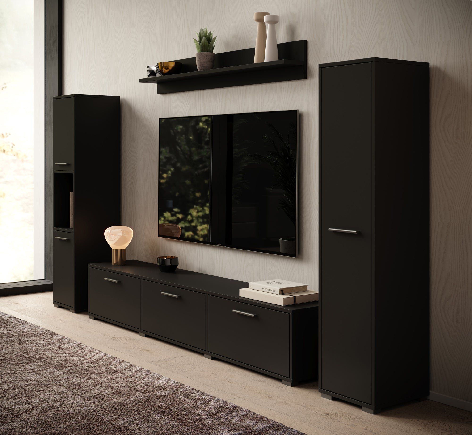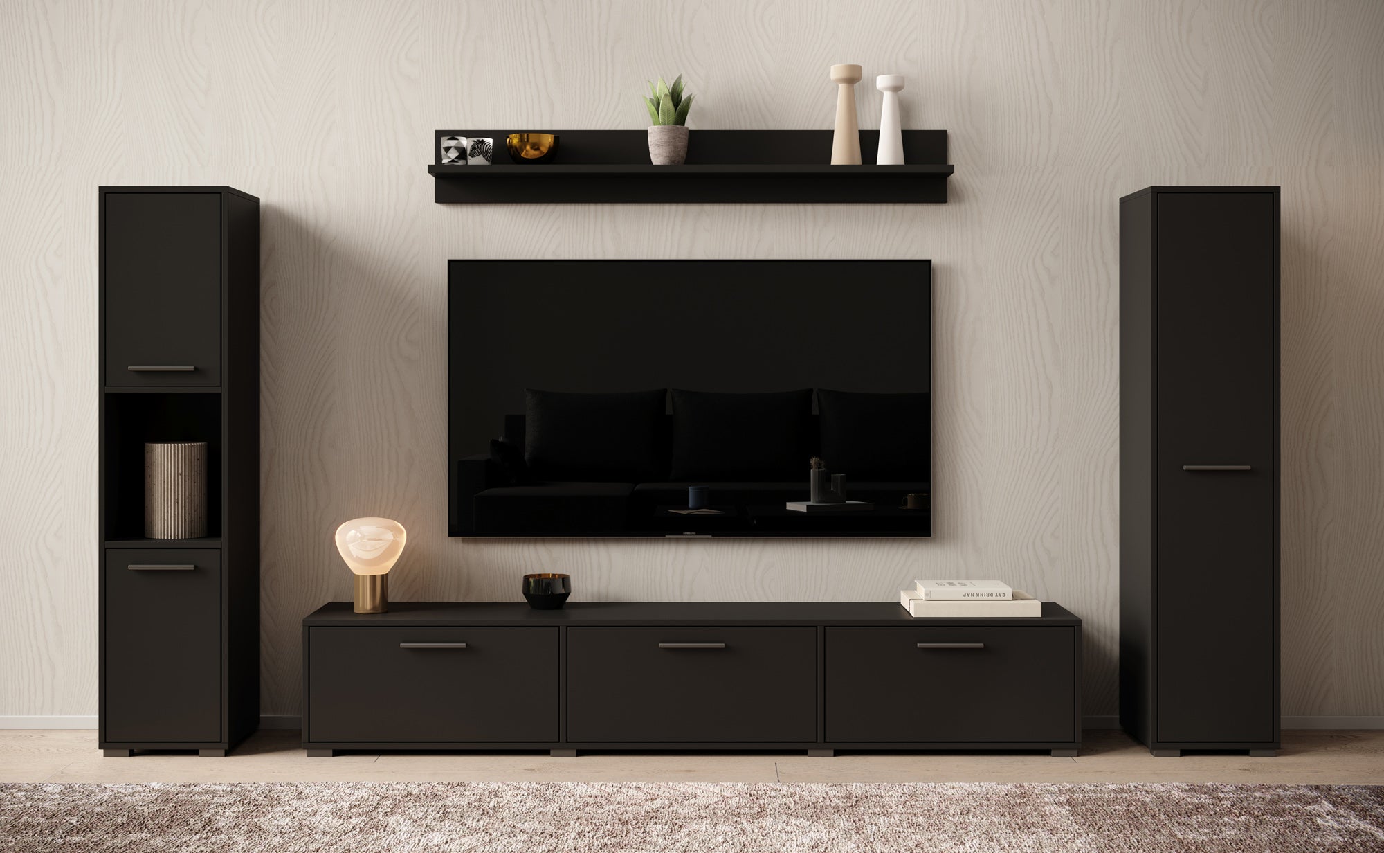 Wandmeubel Betty bestaat uit een tv-meubel, 2 opbergkasten en bijpassende wandplank. Dit model is zowel staand als hangend te monteren. De kast is uitgevoerd in de kleur zwart.