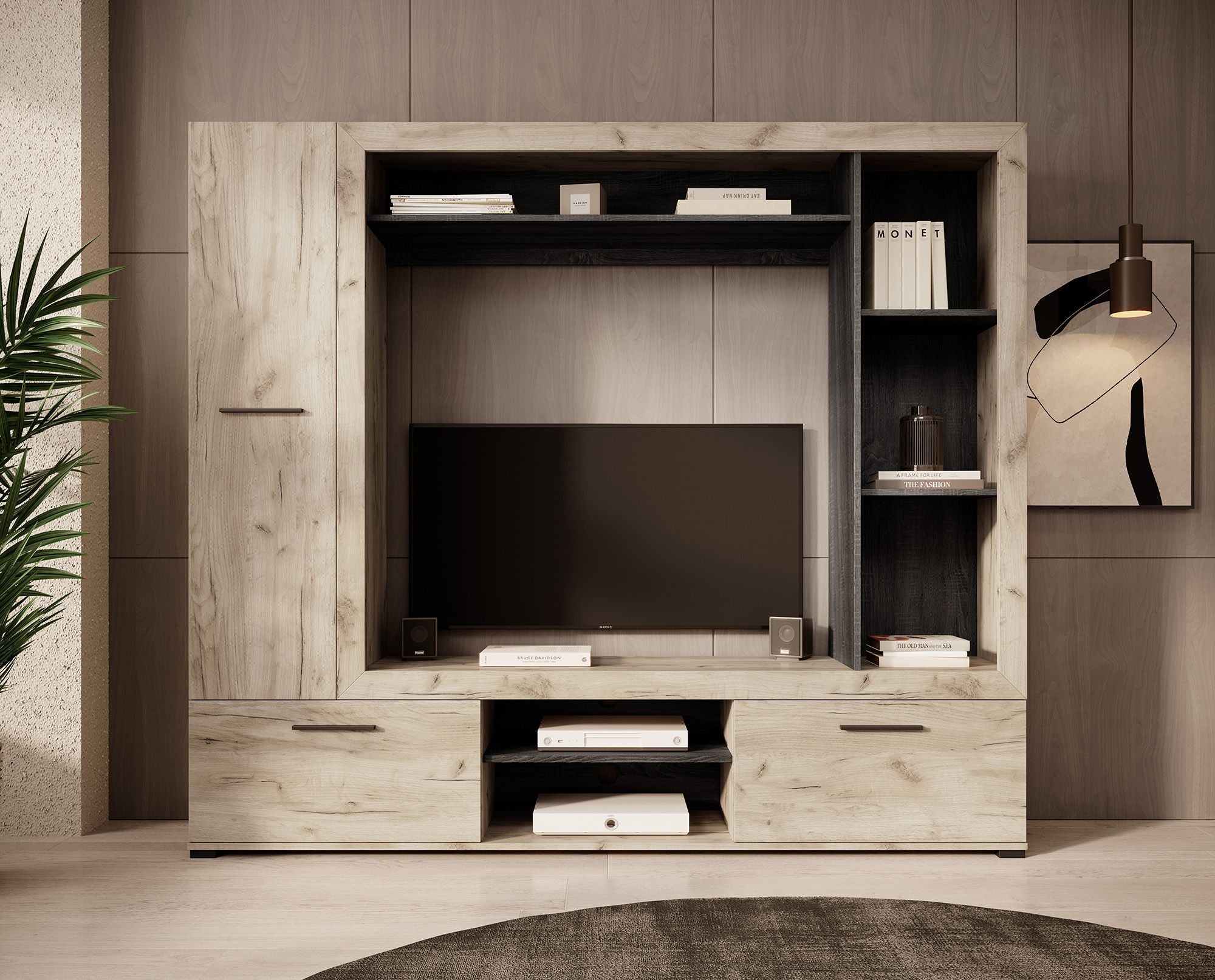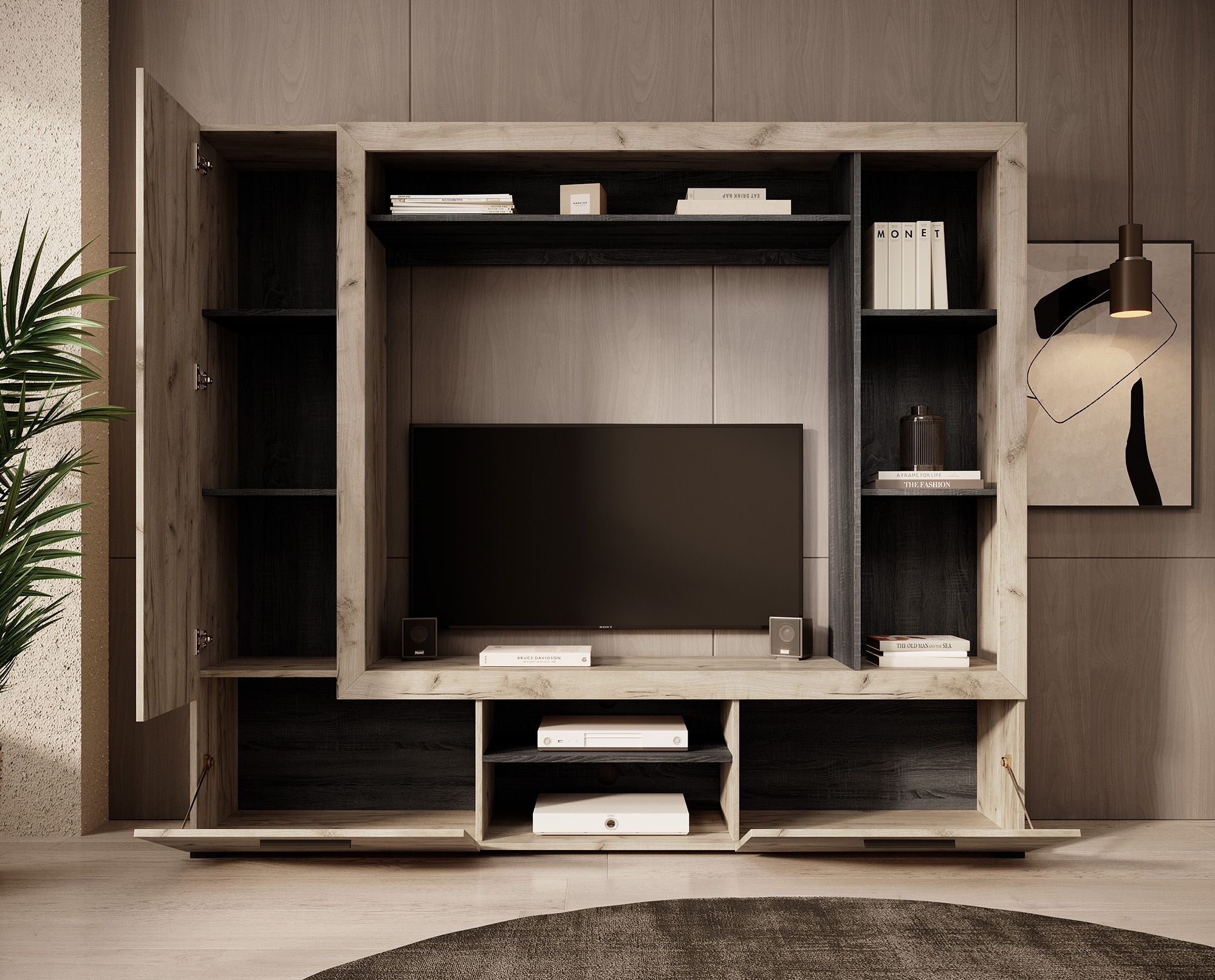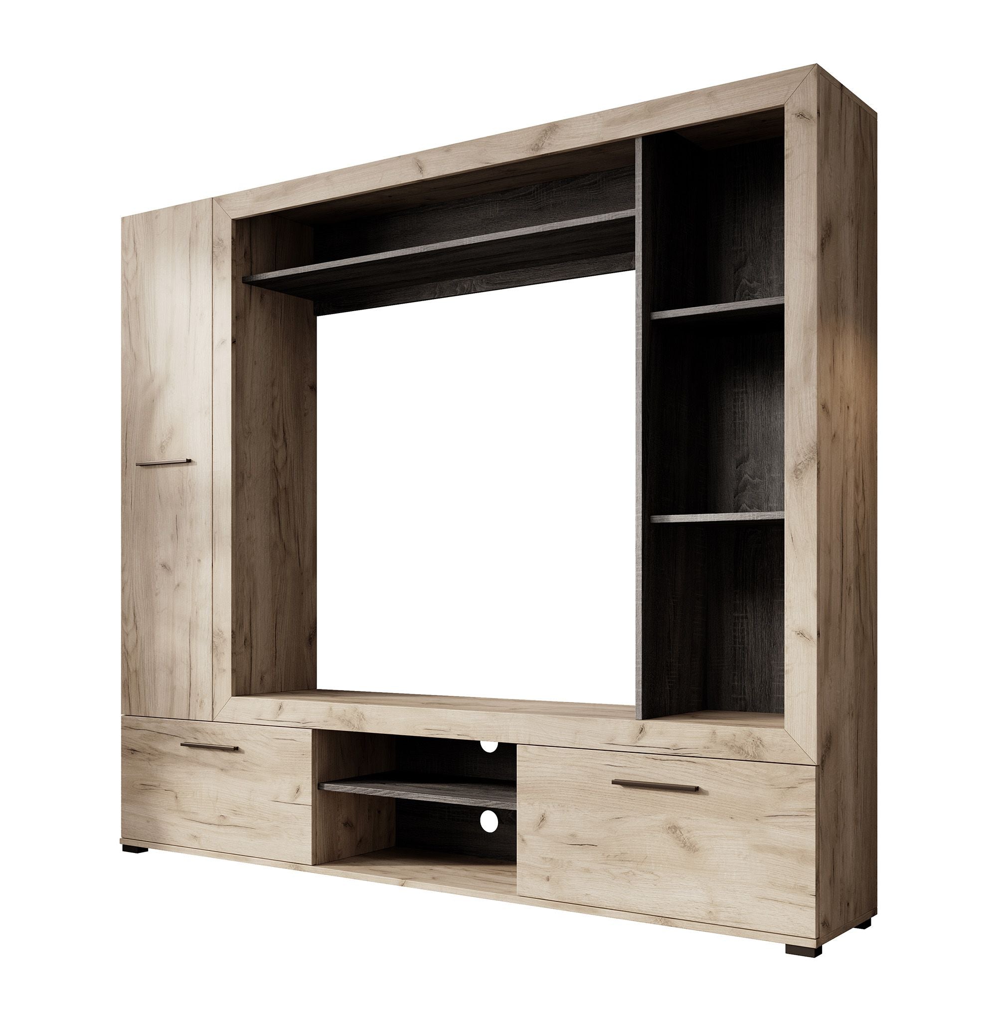 Meubella - Wandmeubel Loni - Grijs eiken - Zwart eiken