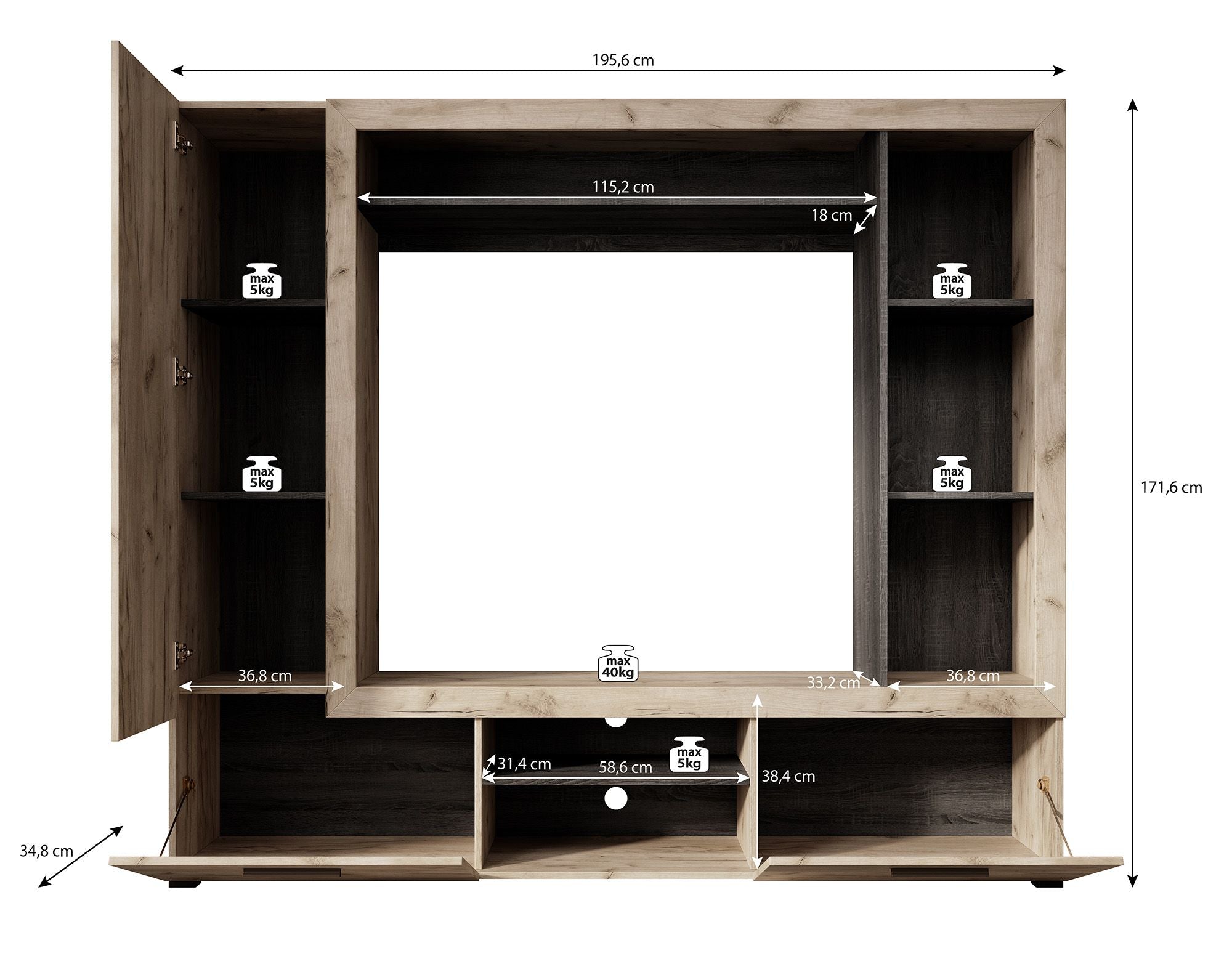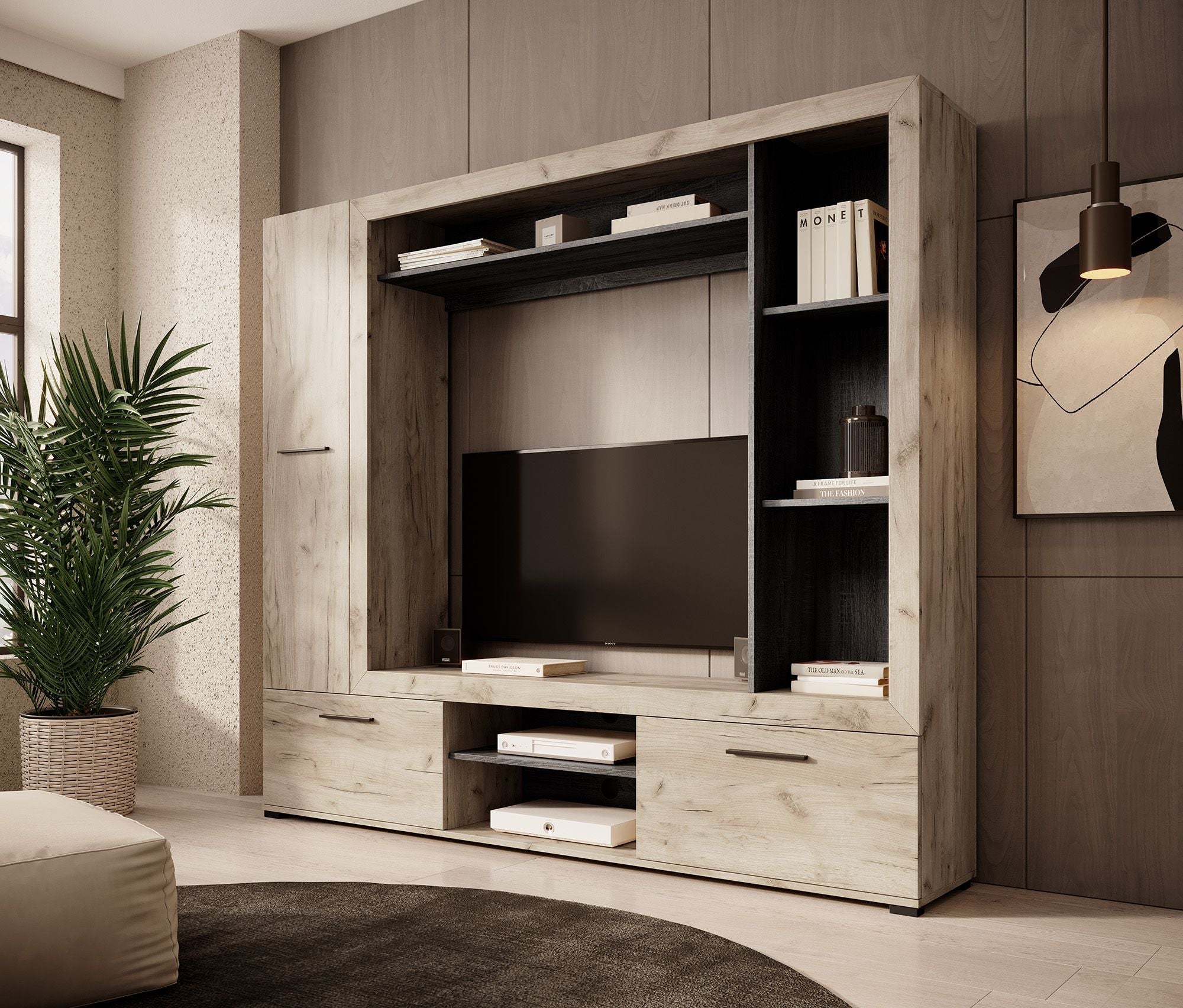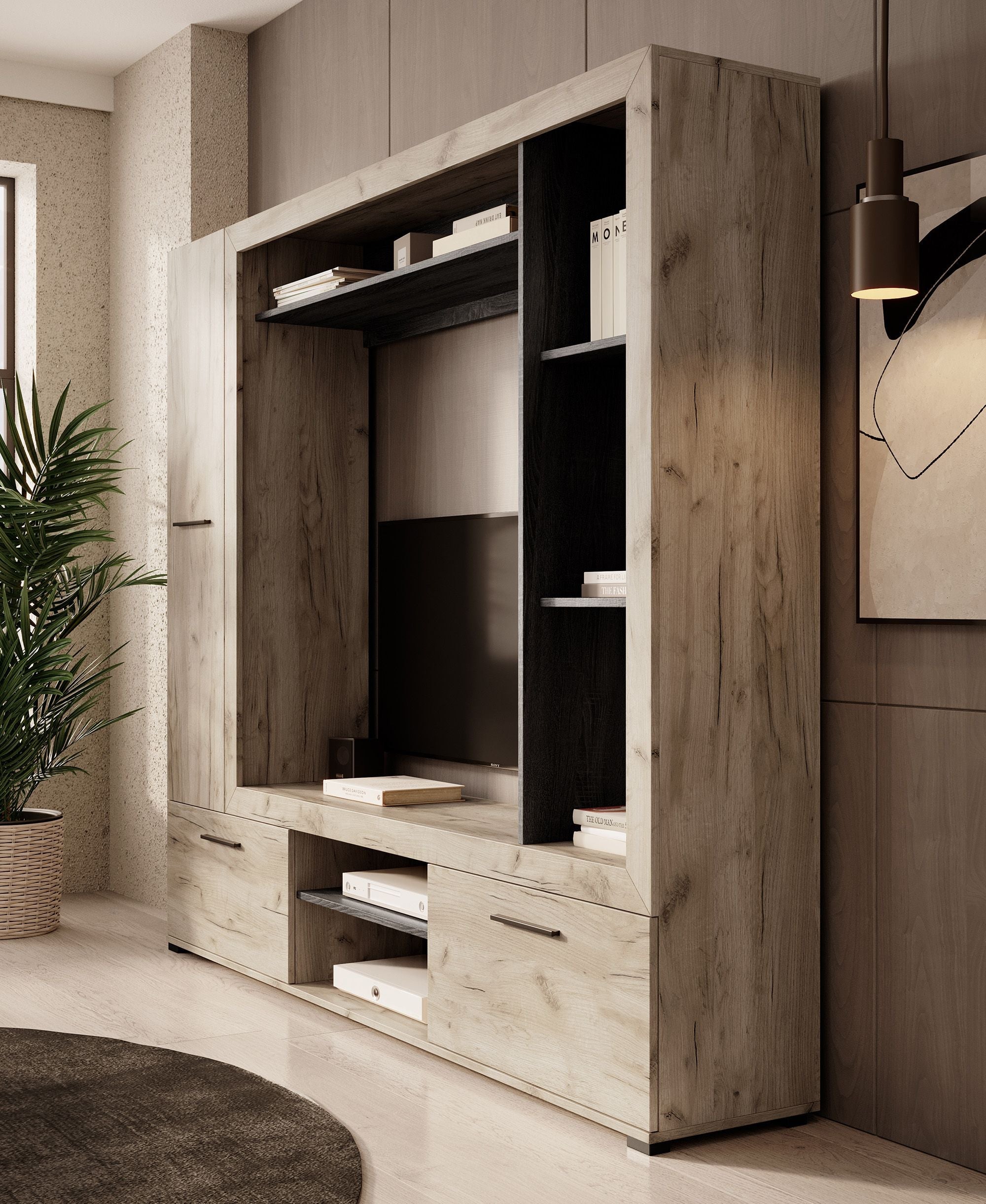 Meubella - Wandmeubel Loni - Grijs eiken - Zwart eiken
