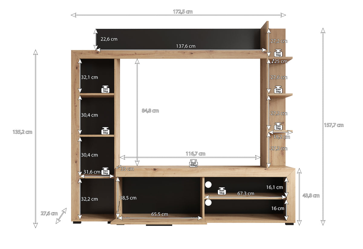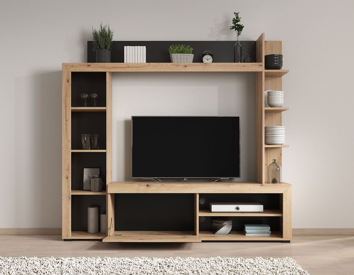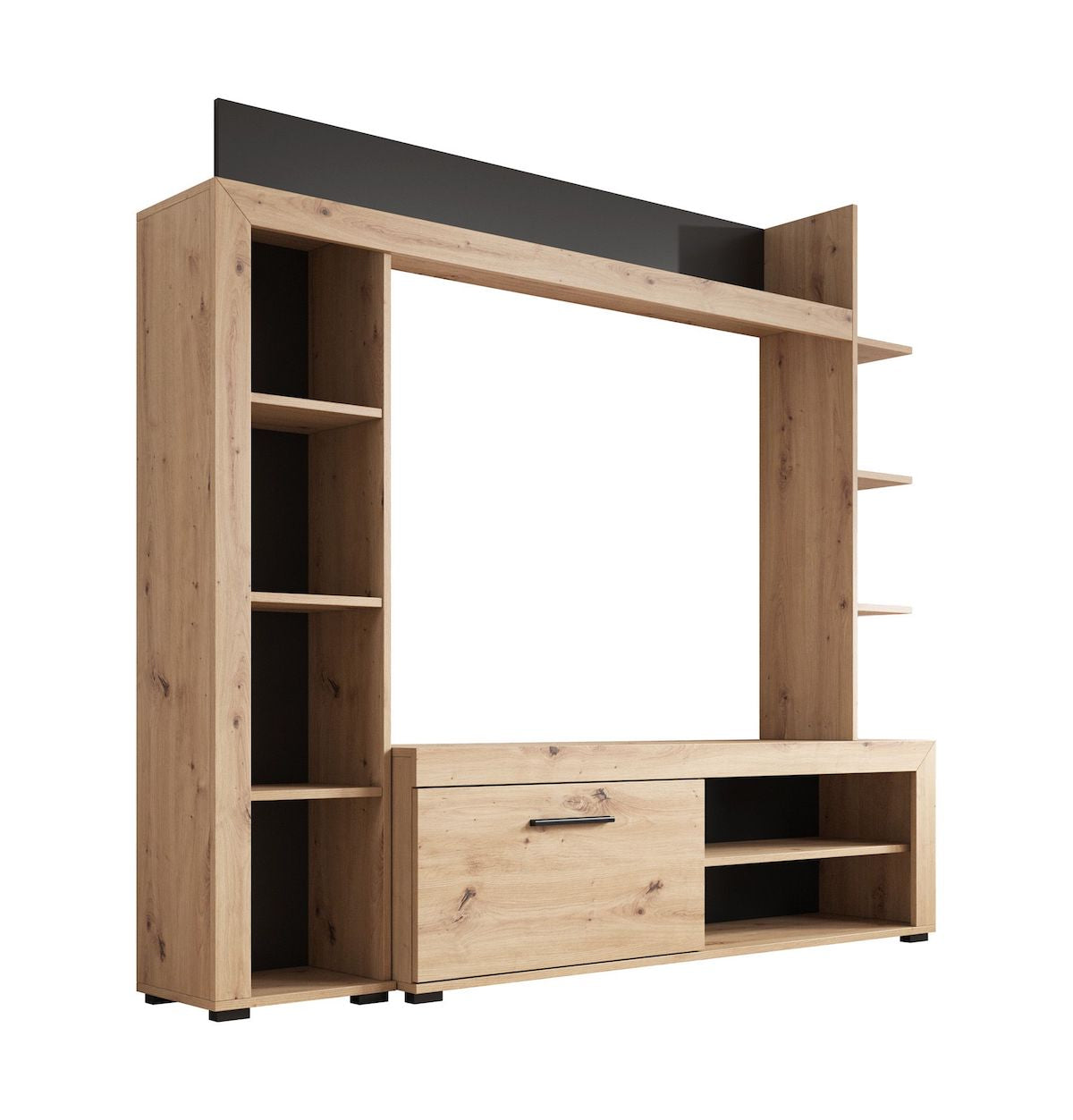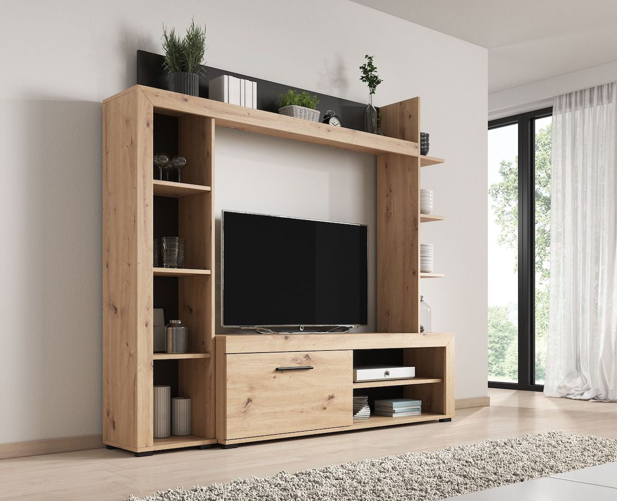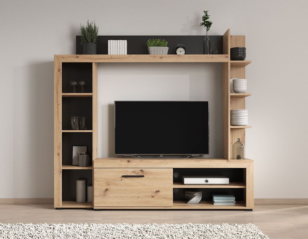 Wandmeubel Ramona bestaat uit een tv-meubel met bijpassende wandkast Het tvmeubel heeft 1 klep. Het meubel staat op lage pootjes.